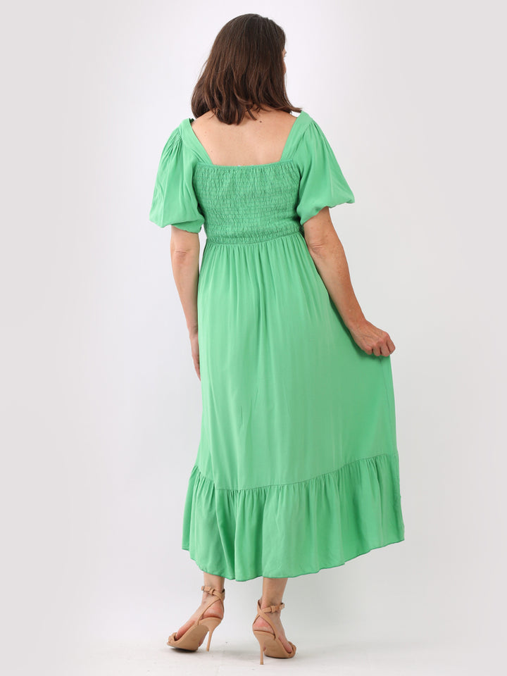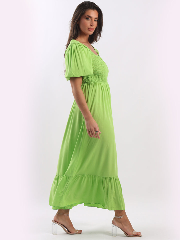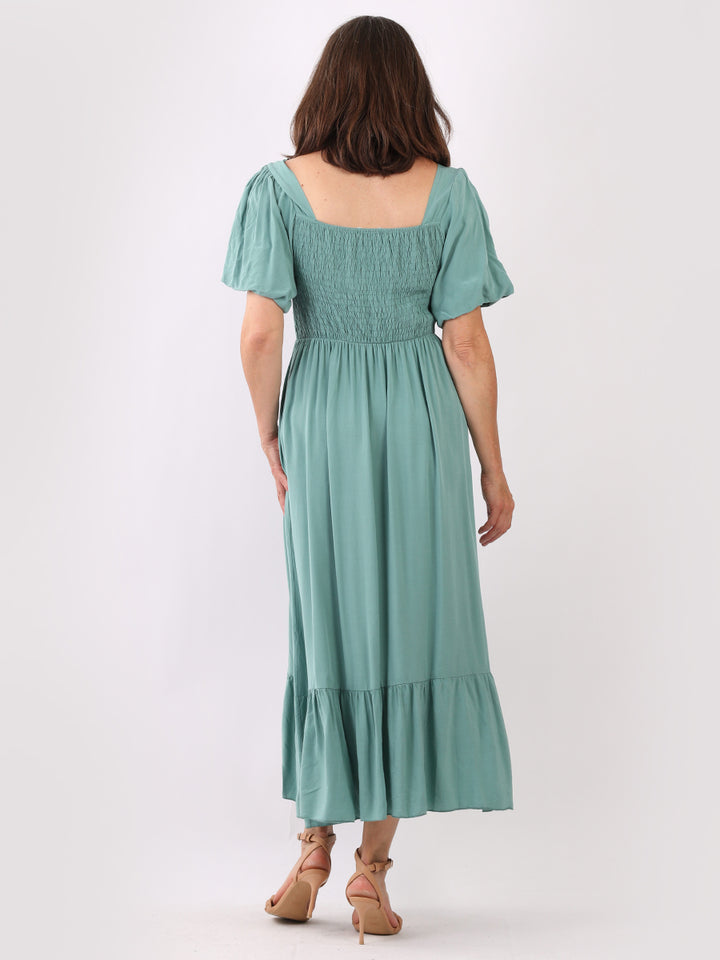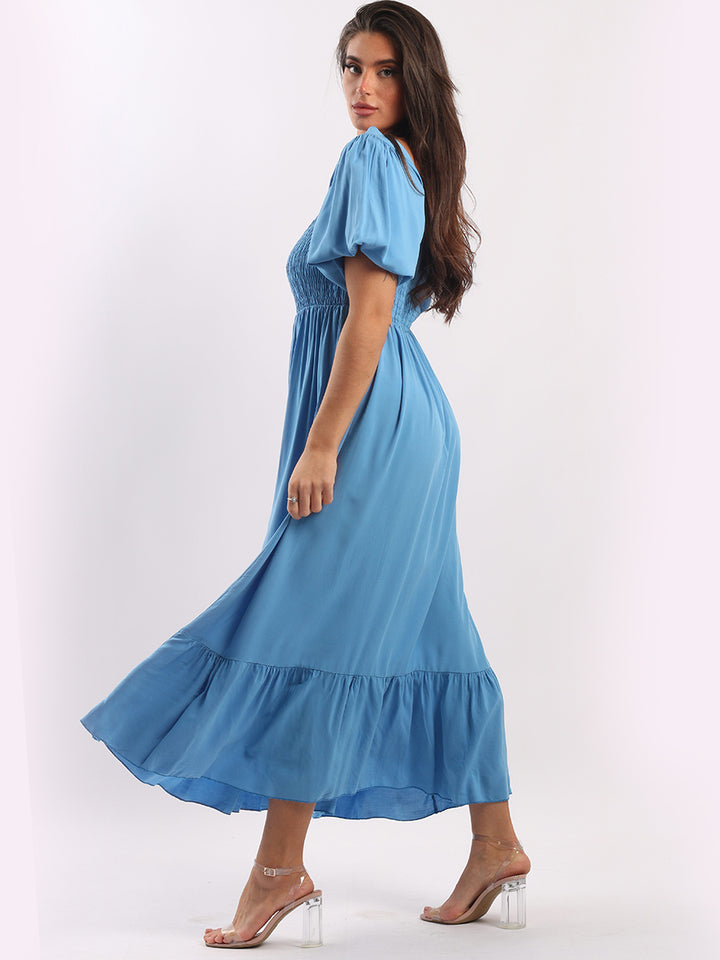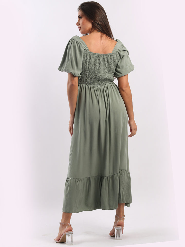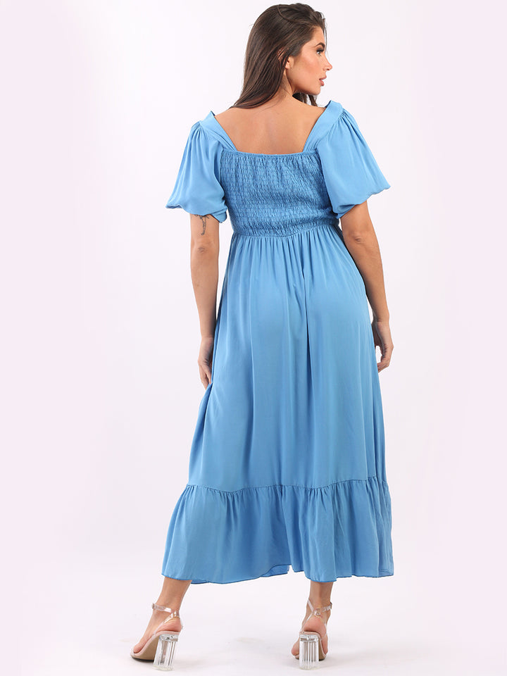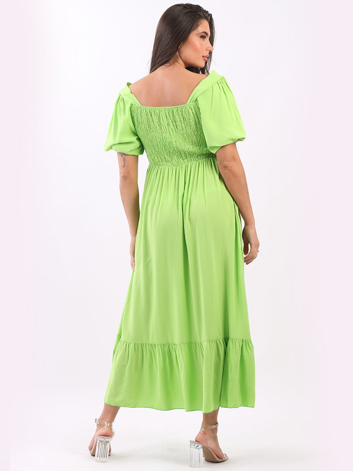A blast from the past yet more comfy and stylish! This is made in Italy and the soft fabric maxi dress has made a grand comeback with classy timeless features like wide square neckline, bold and rich colors, puff sleeves for a formal finish and flared style finish. Dress it with high square platform heels and duffle bag.