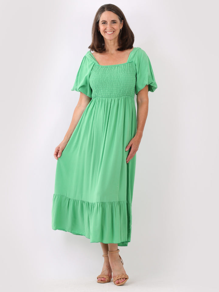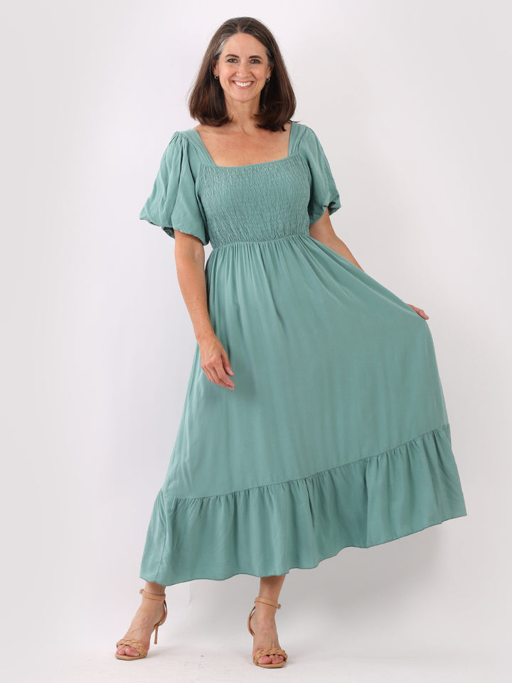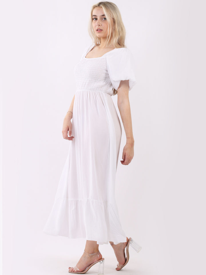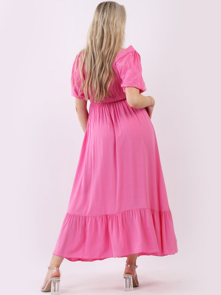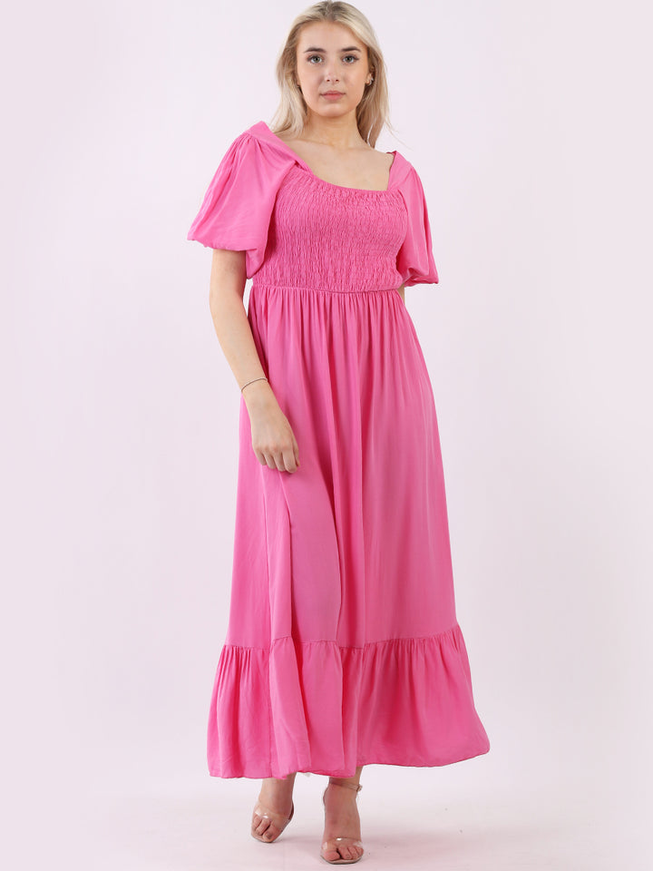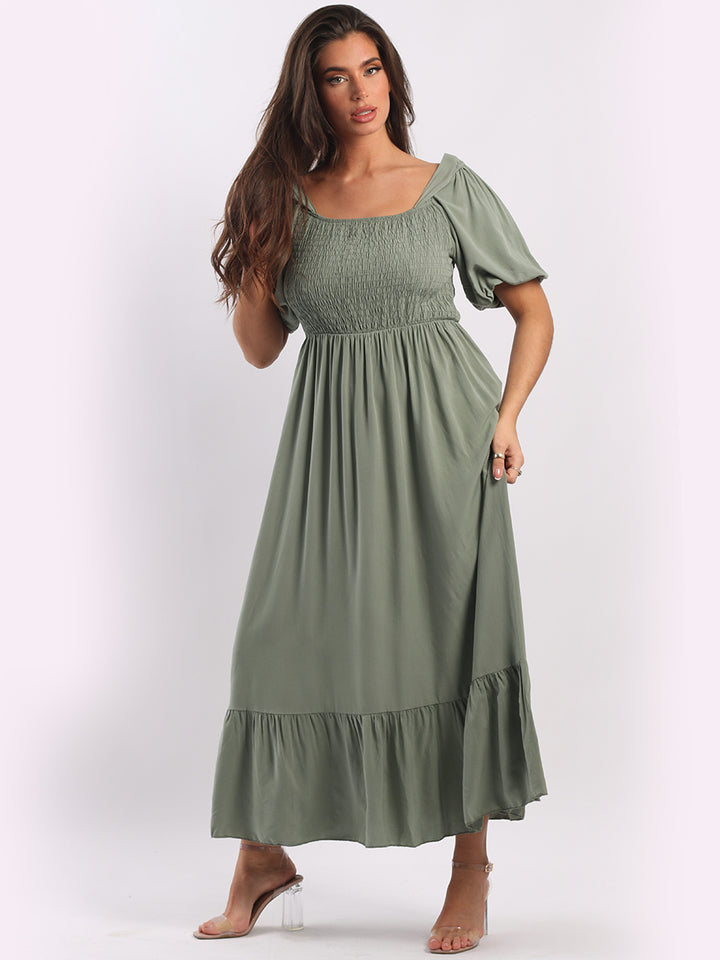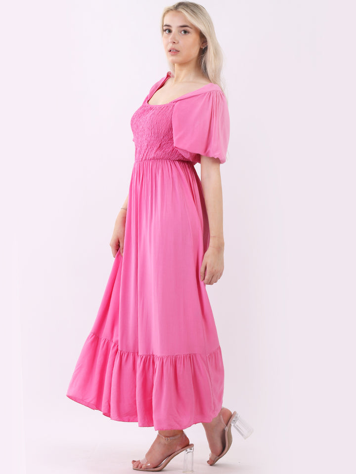 A blast from the past yet more comfy and stylish! This is made in Italy and the soft fabric maxi dress has made a grand comeback with classy timeless features like wide square neckline, bold and rich colors, puff sleeves for a formal finish and flared style finish. Dress it with high square platform heels and duffle bag.