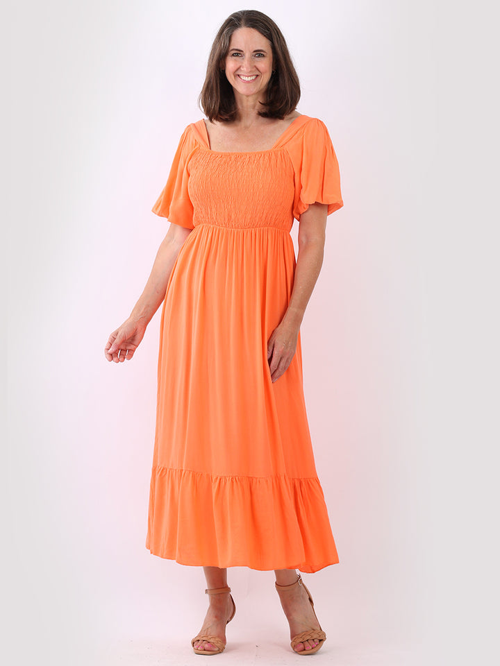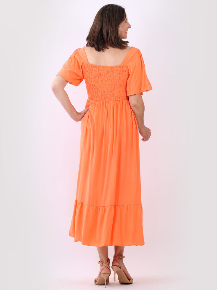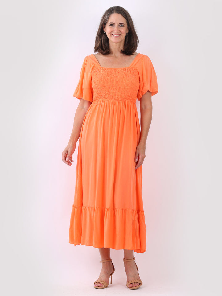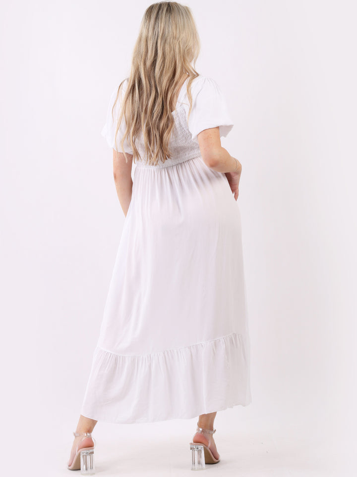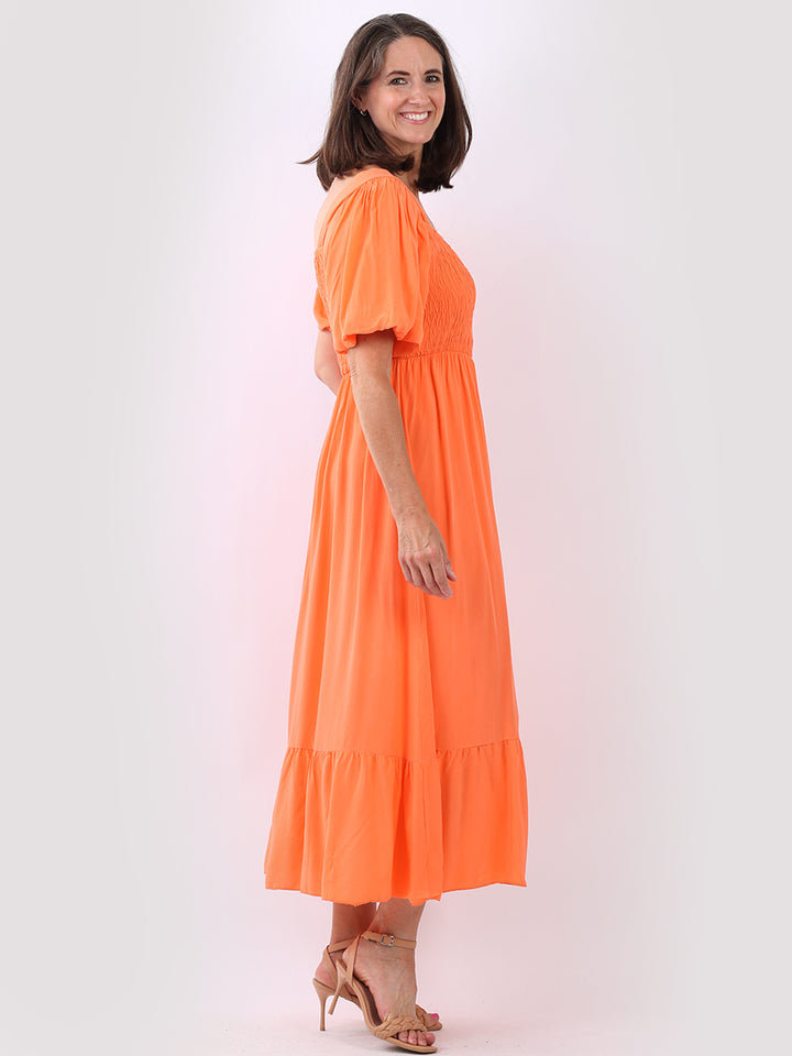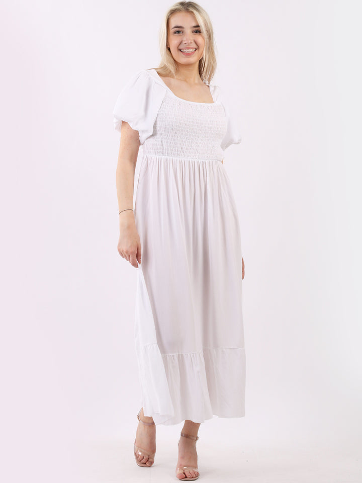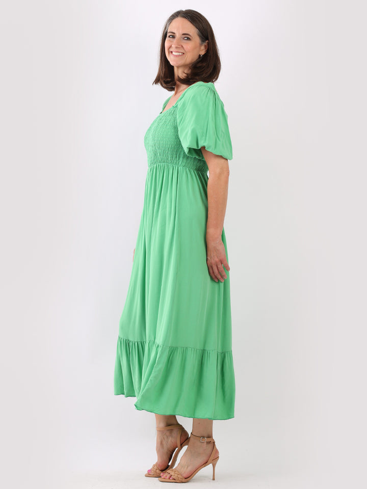 A blast from the past yet more comfy and stylish! This is made in Italy and the soft fabric maxi dress has made a grand comeback with classy timeless features like wide square neckline, bold and rich colors, puff sleeves for a formal finish and flared style finish. Dress it with high square platform heels and duffle bag.
