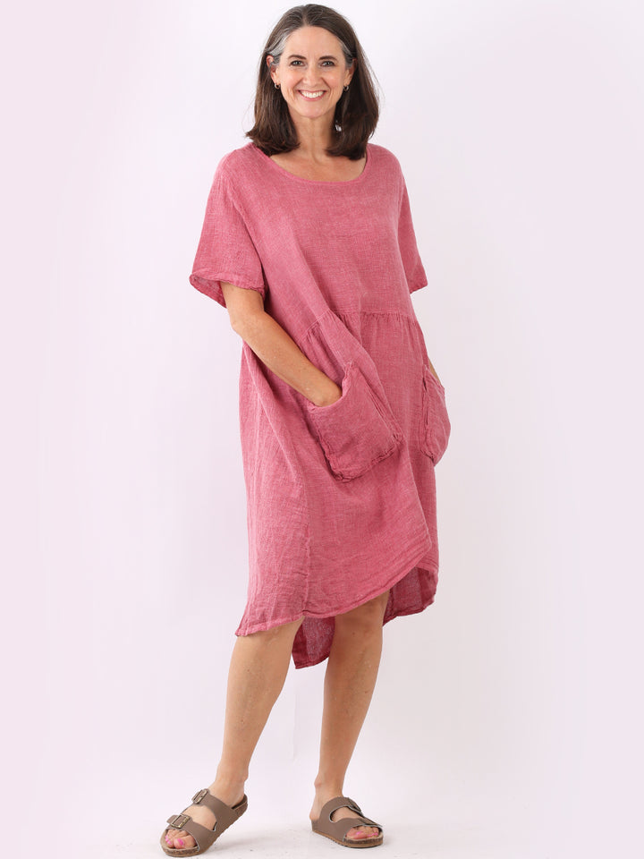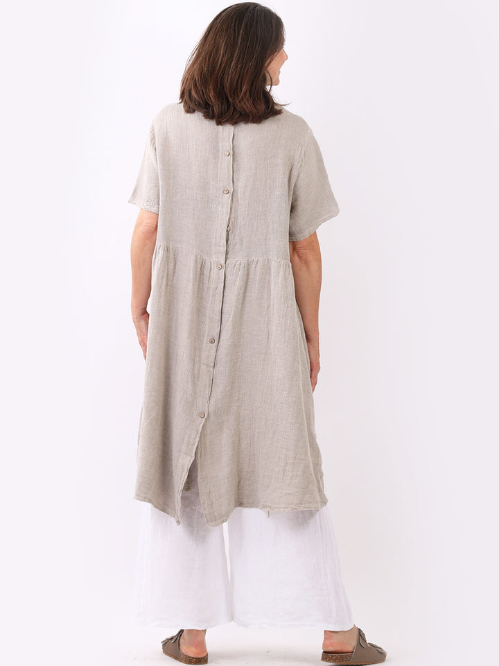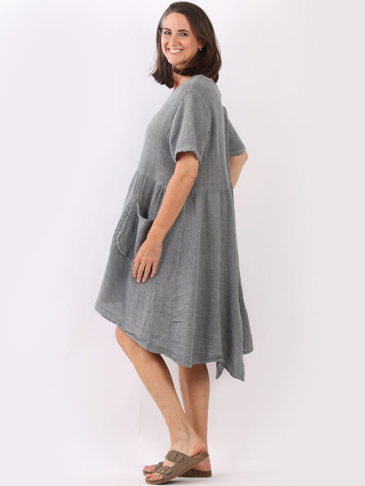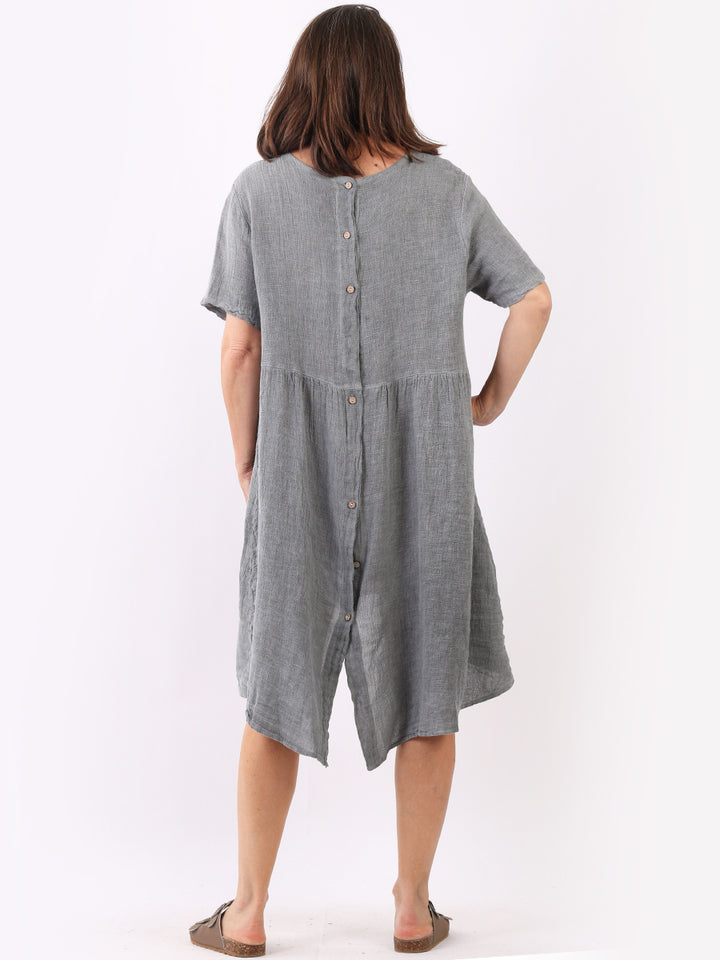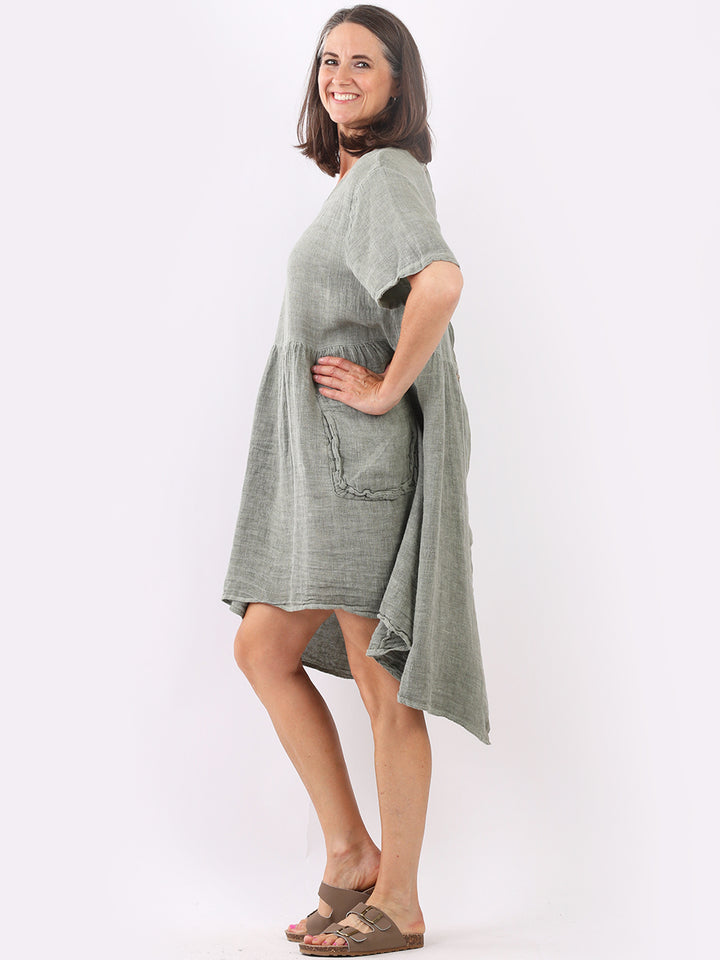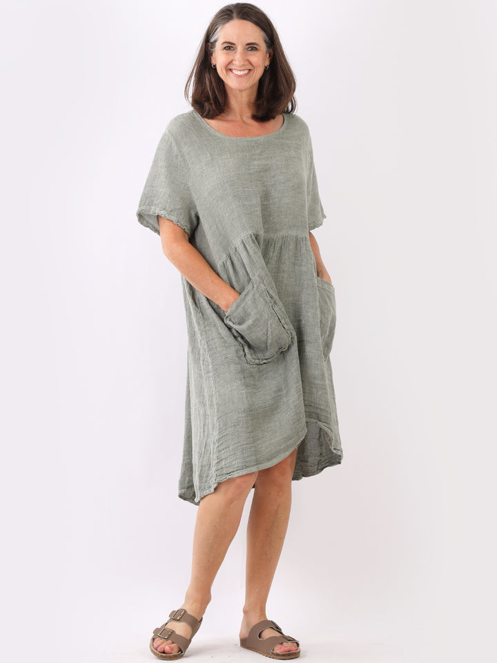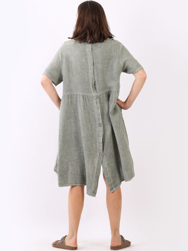 Made In Italy Plain Vintage Washed Linen Lagenlook Swing Midi Dress