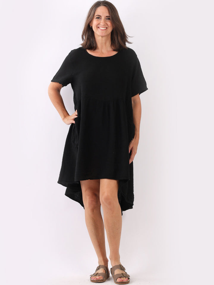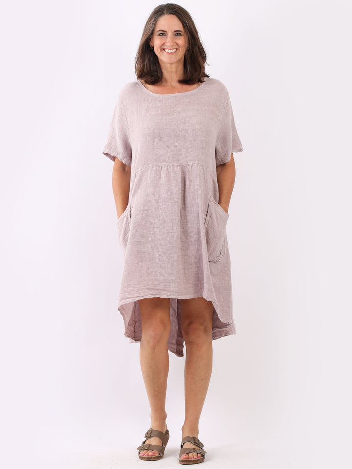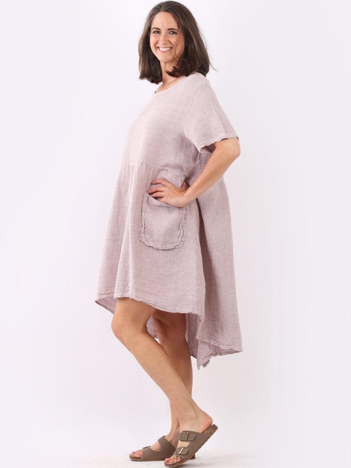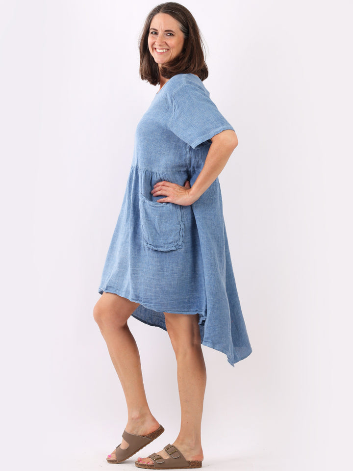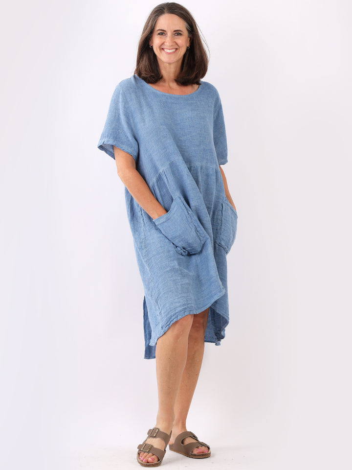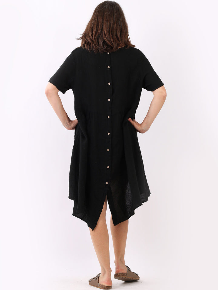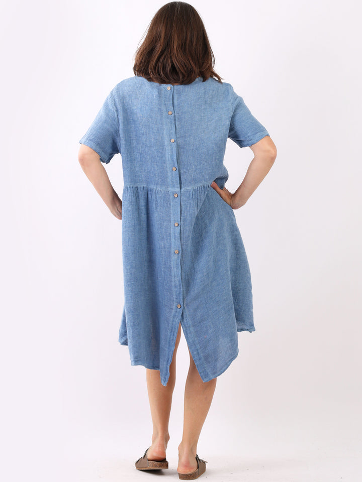 Casual yet ideal for any day dressing up in a fashionable manner. Made in Italy with high quality pure cotton blend the dress has vintage wash finish, wide round neckline and modish back buttons on dip hem, front pockets are functional and multiuse. Mix and match this dress with animal print capris and gladiator sandals.