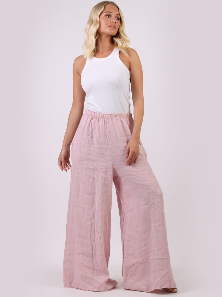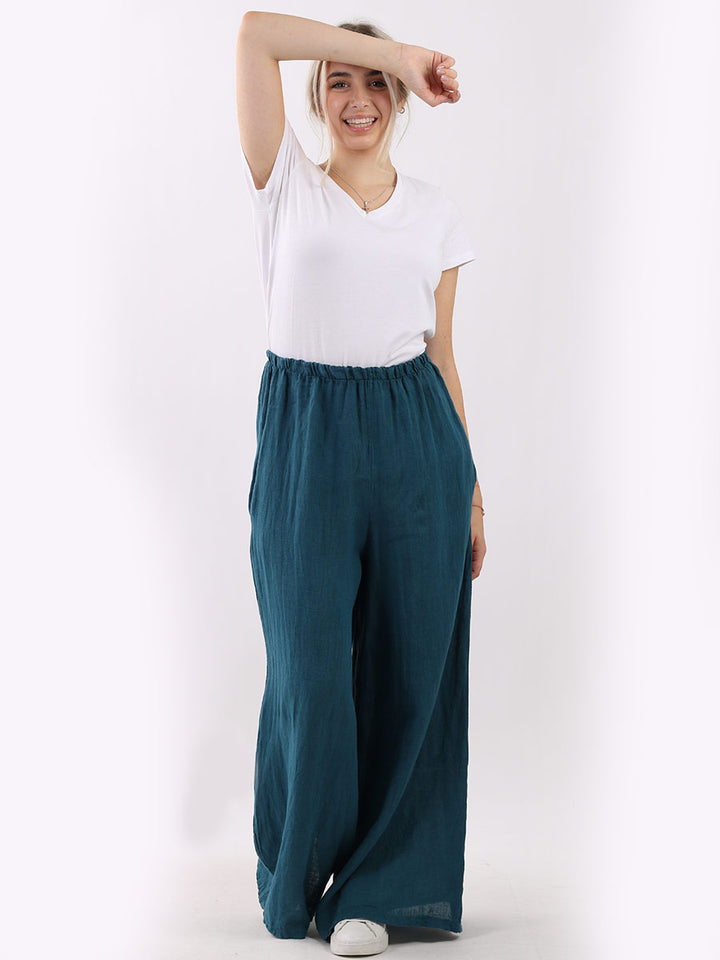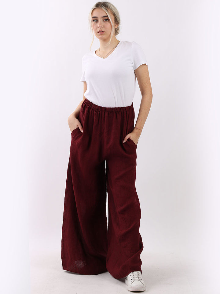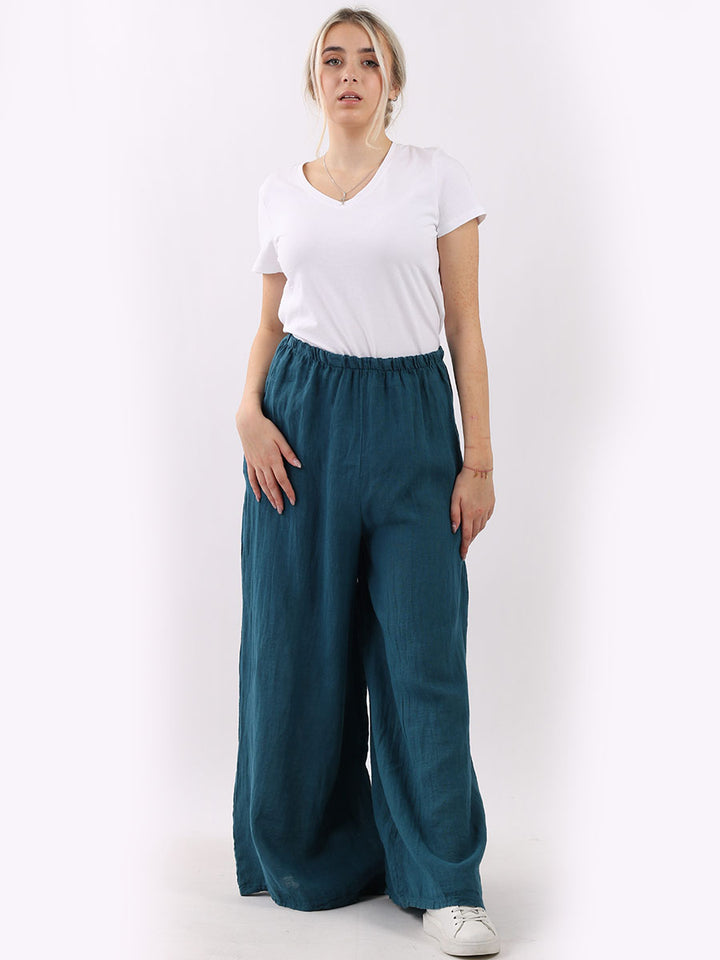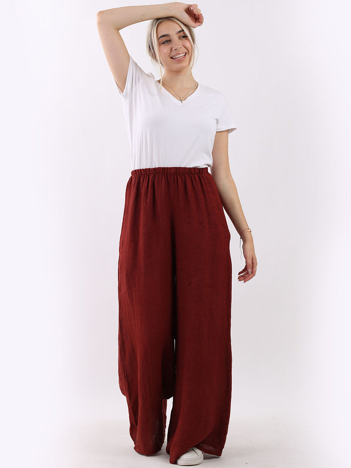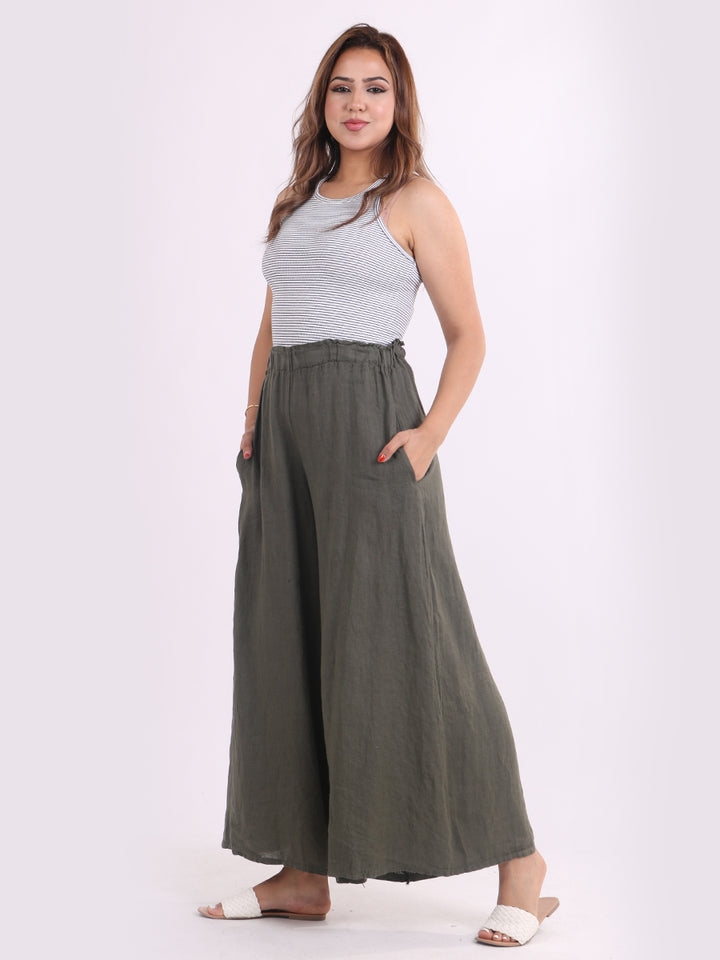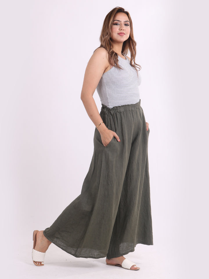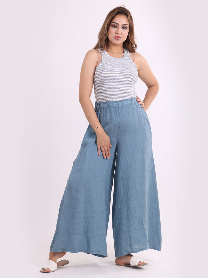 The wardrobe must have that woman wearers need for turning their casual looks into fun-fiestas tic affair! Made to perfection with pure skin friendly linen that flows very nicely with every step, made in Italy with promising quality these wide leg and elastic easy pull on style palazzo pants is classically chic. Dress with skinny crop tops and high heels.