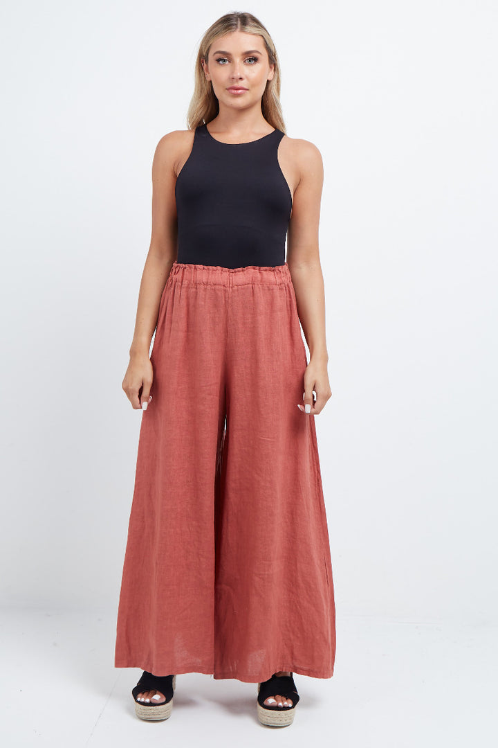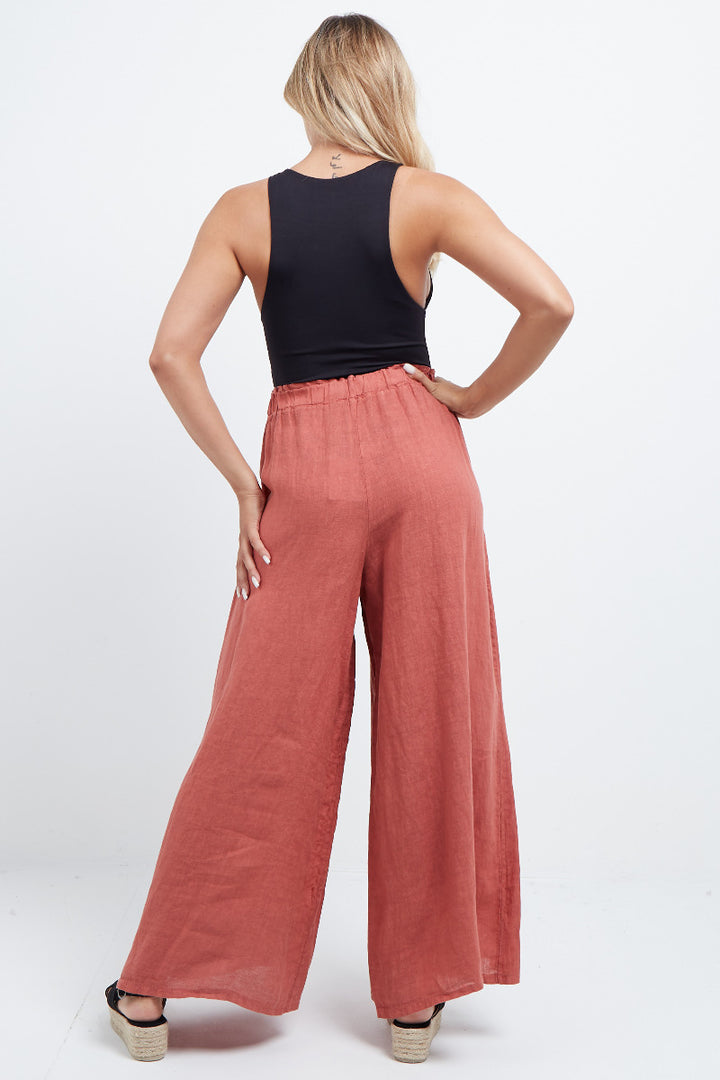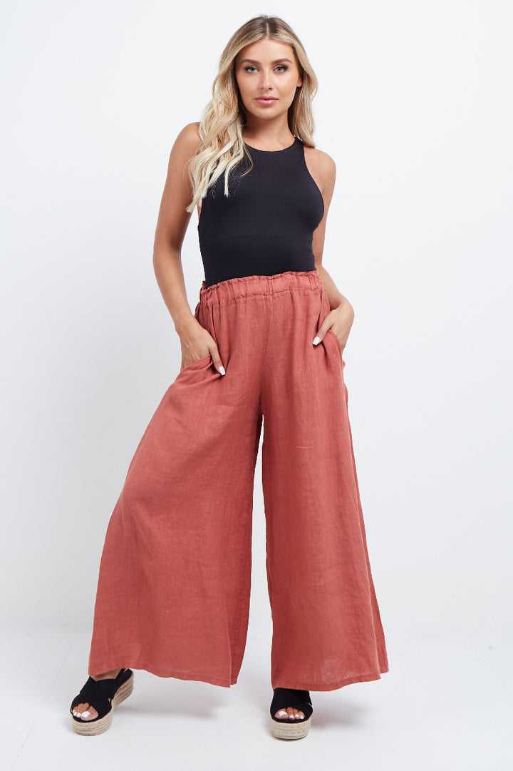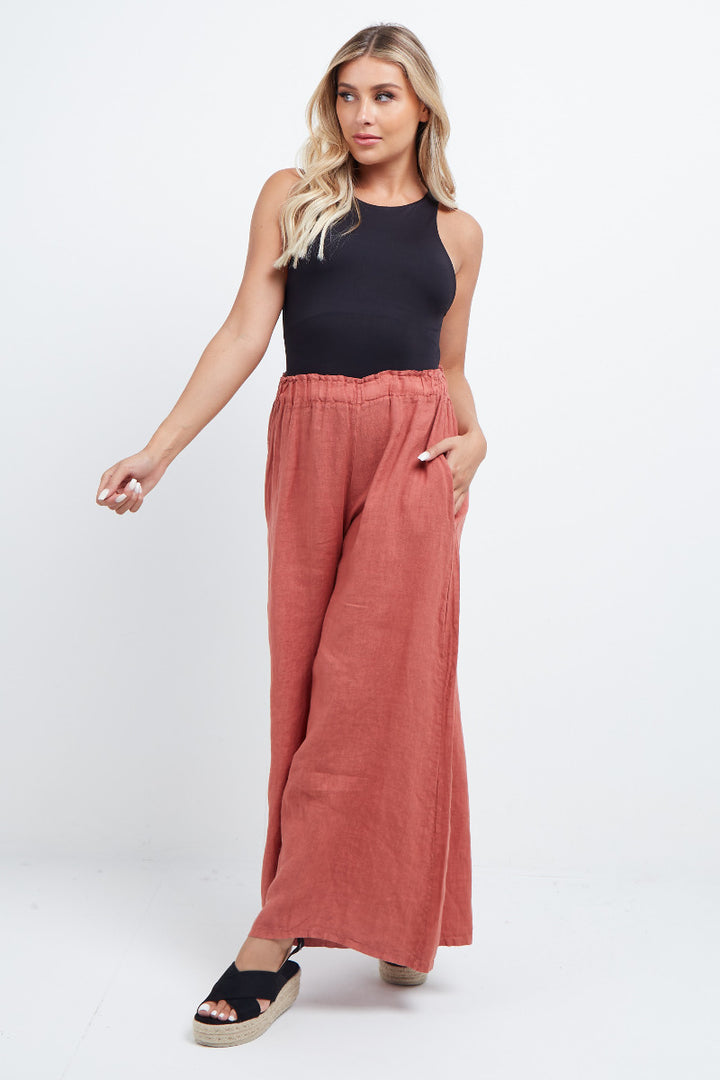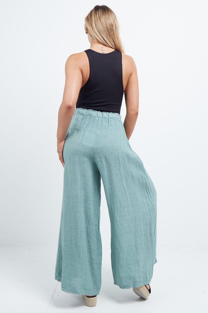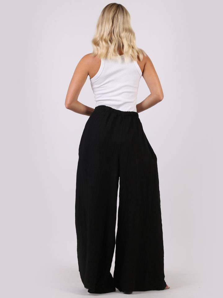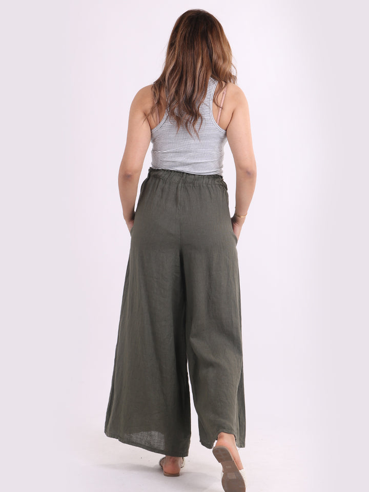 The wardrobe must have that woman wearers need for turning their casual looks into fun-fiestas tic affair! Made to perfection with pure skin friendly linen that flows very nicely with every step, made in Italy with promising quality these wide leg and elastic easy pull on style palazzo pants is classically chic. Dress with skinny crop tops and high heels.