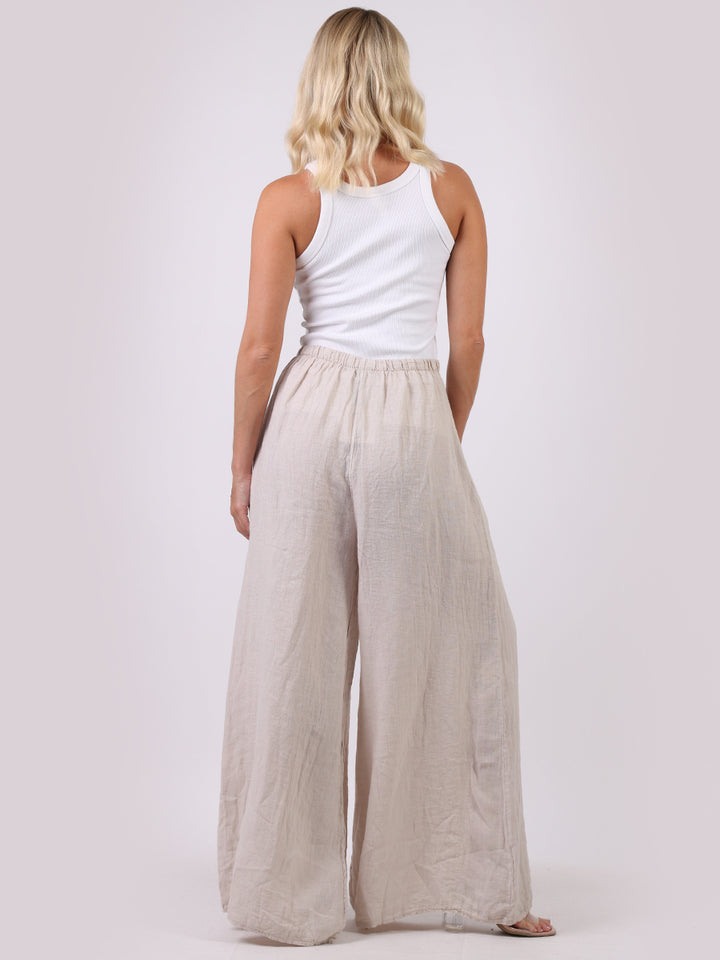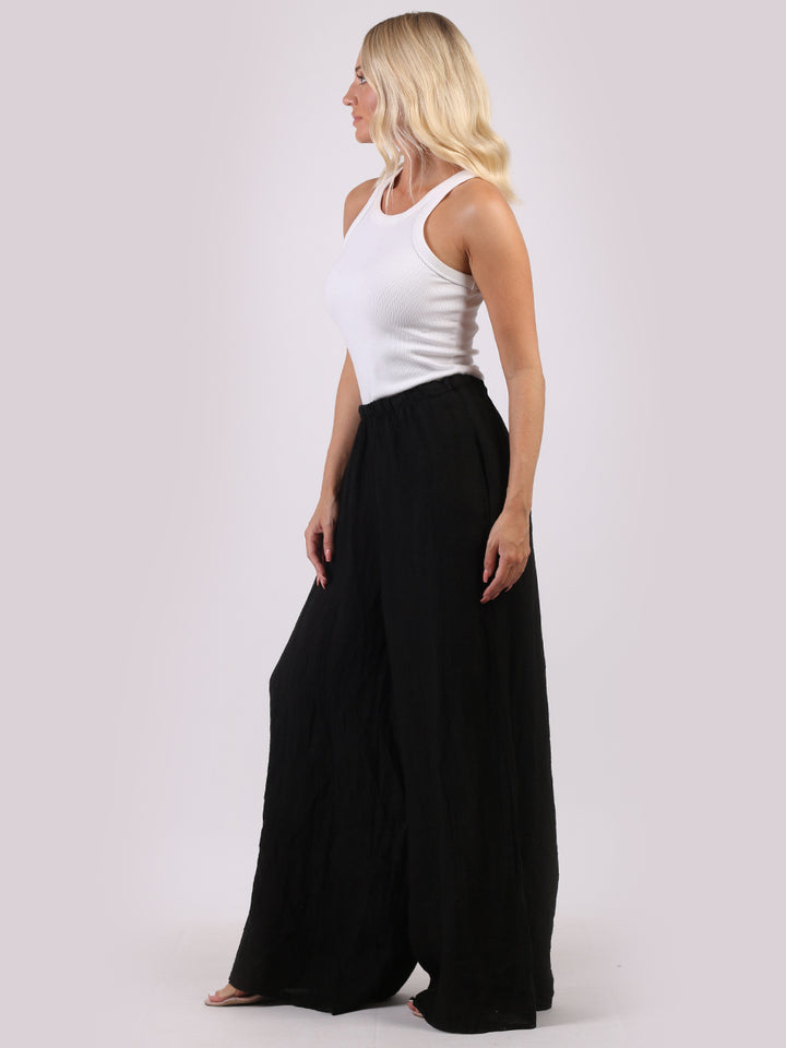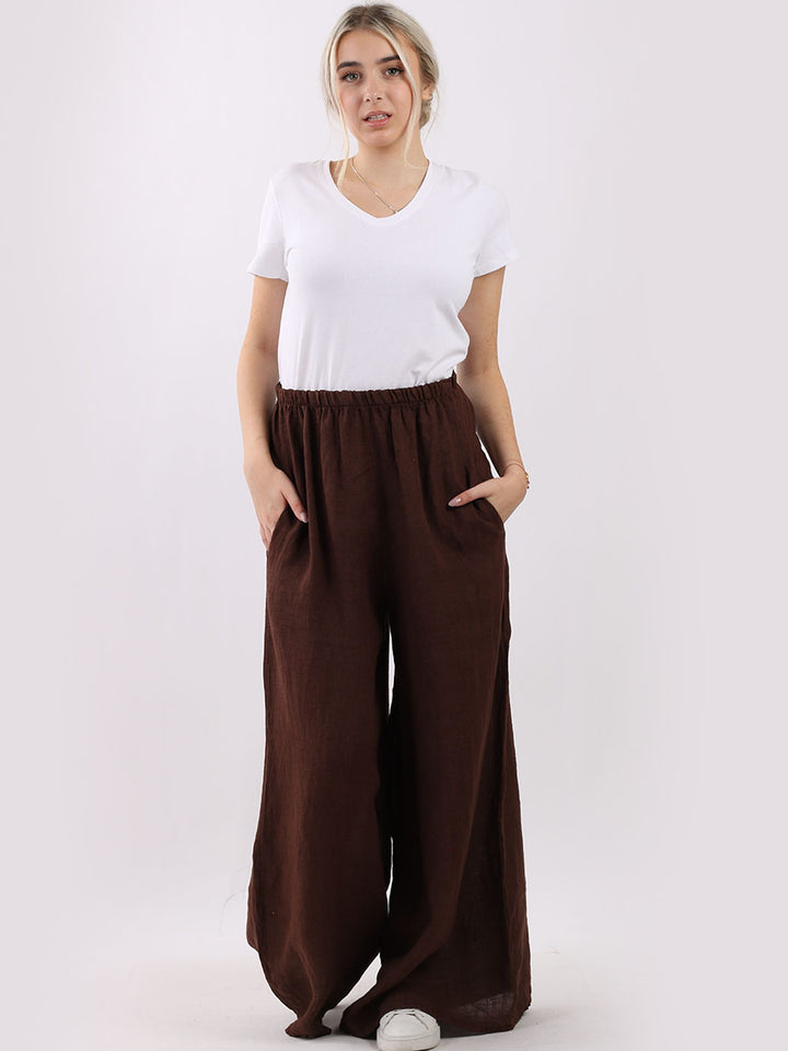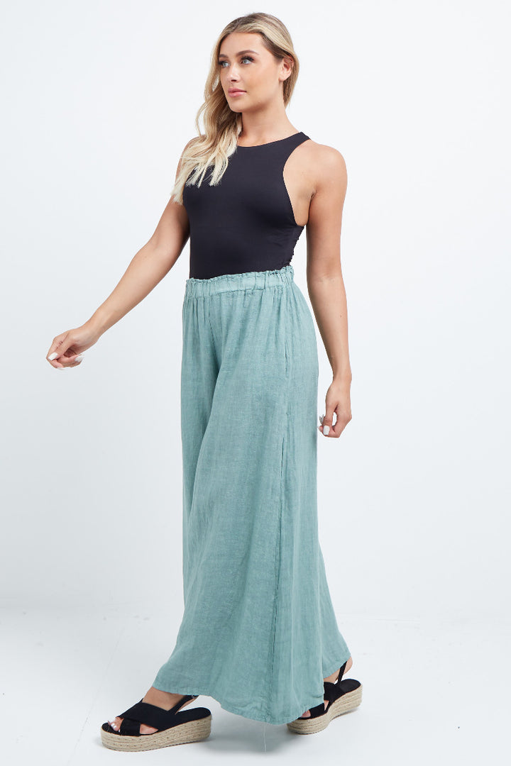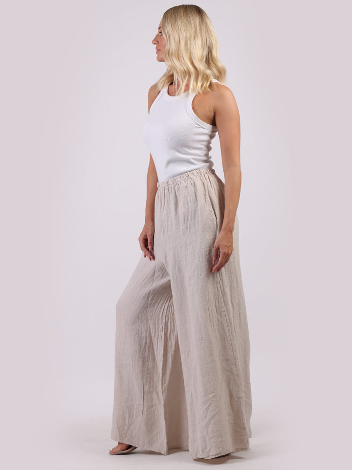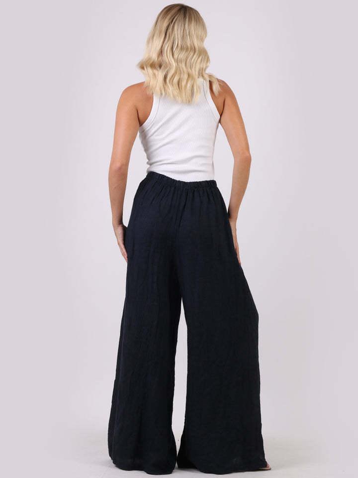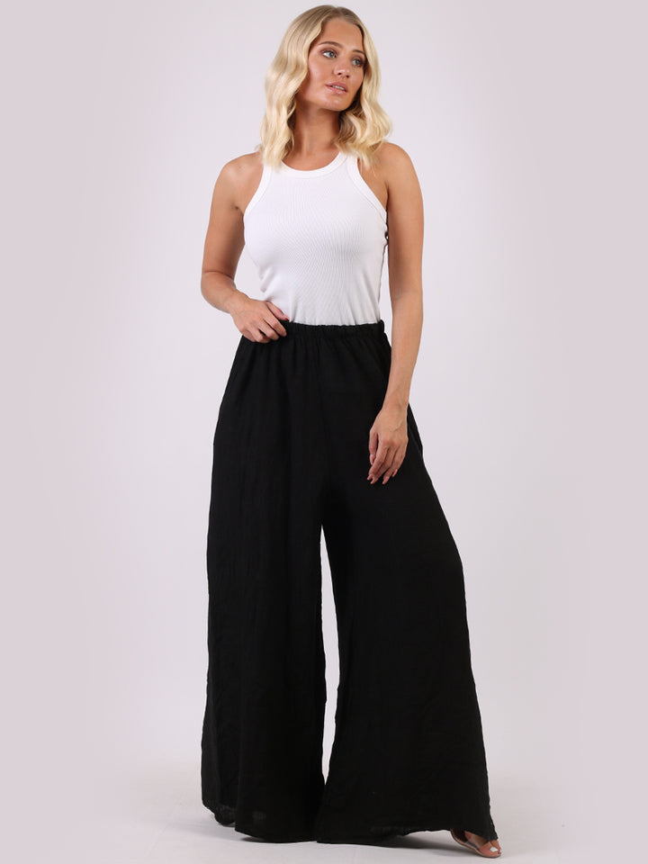 The wardrobe must have that woman wearers need for turning their casual looks into fun-fiestas tic affair! Made to perfection with pure skin friendly linen that flows very nicely with every step, made in Italy with promising quality these wide leg and elastic easy pull on style palazzo pants is classically chic. Dress with skinny crop tops and high heels.