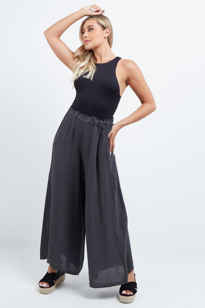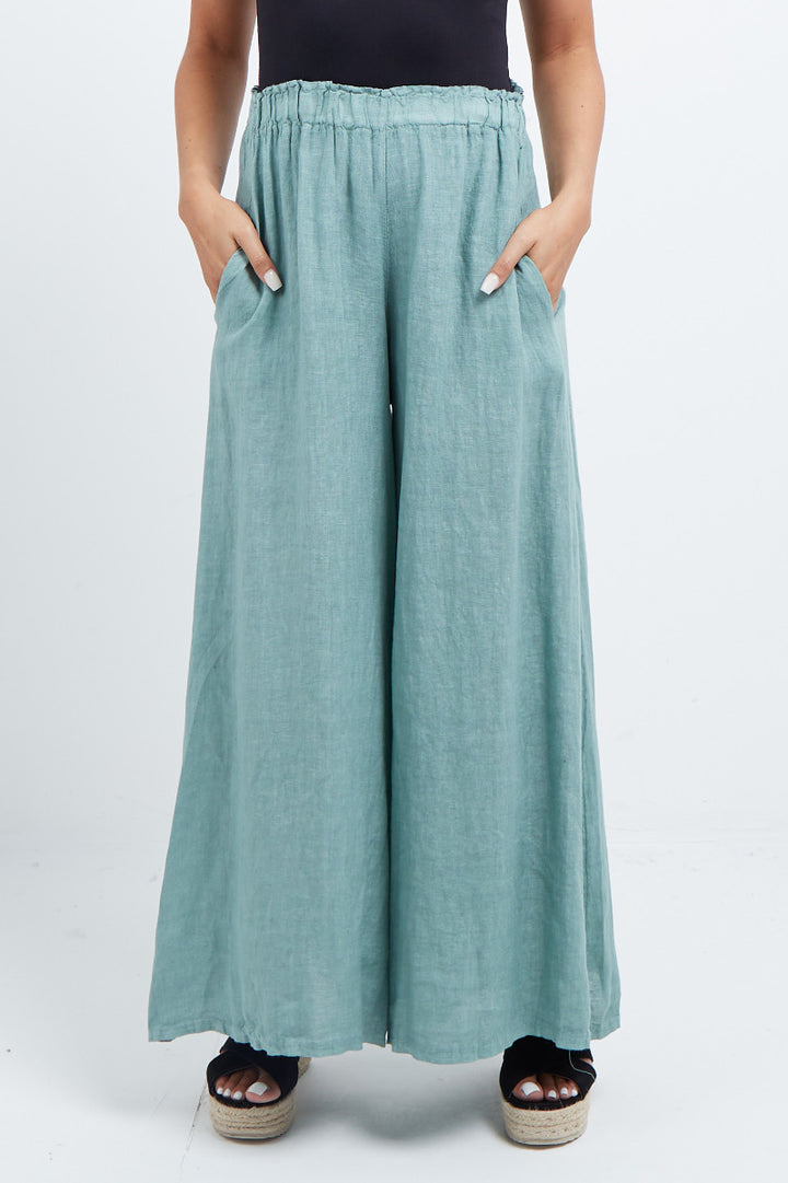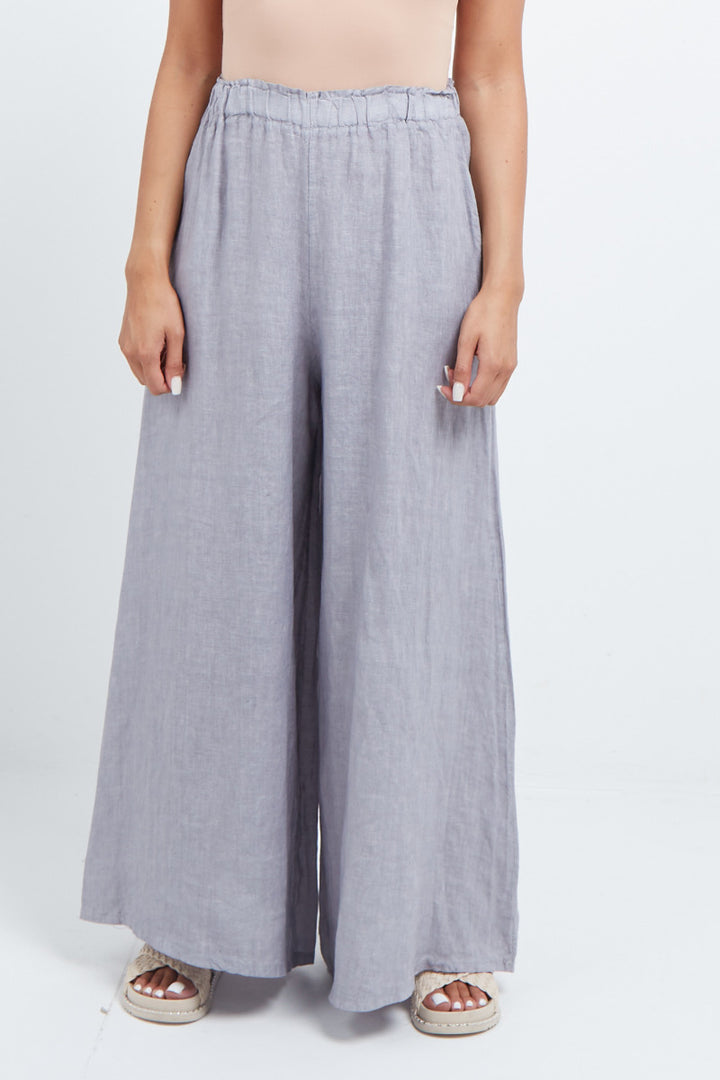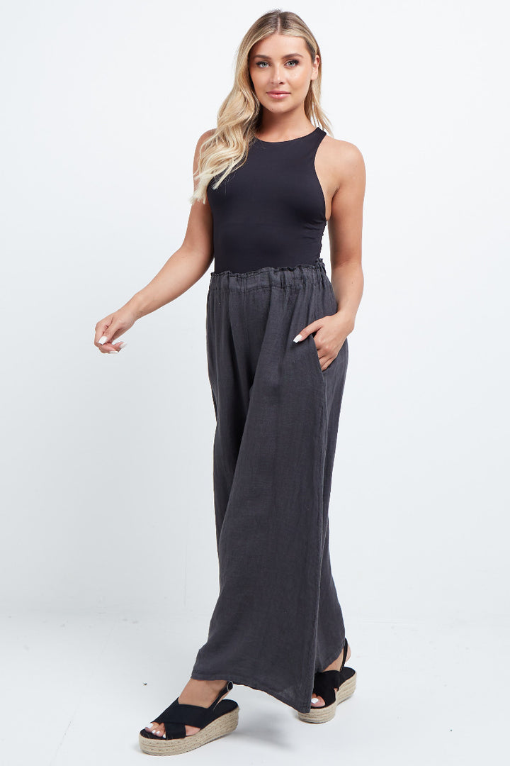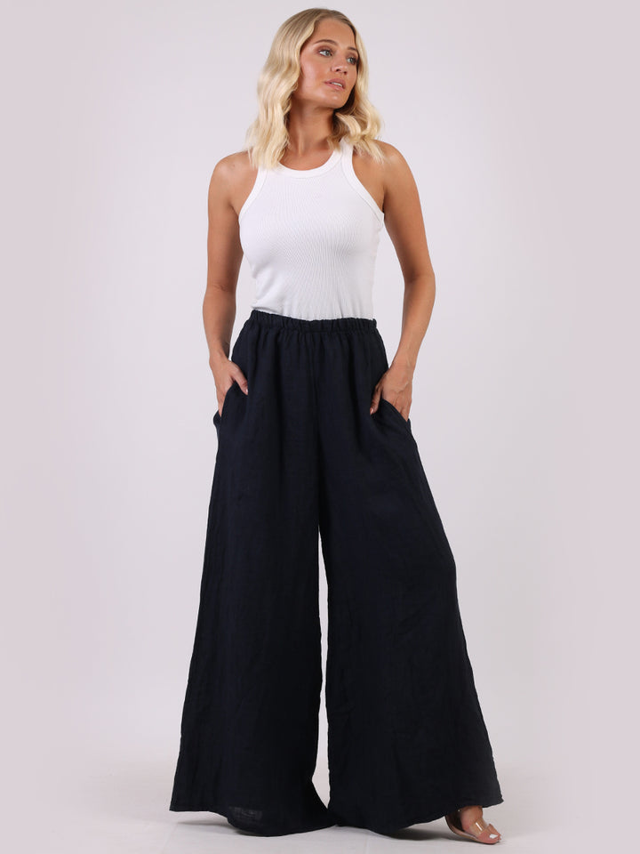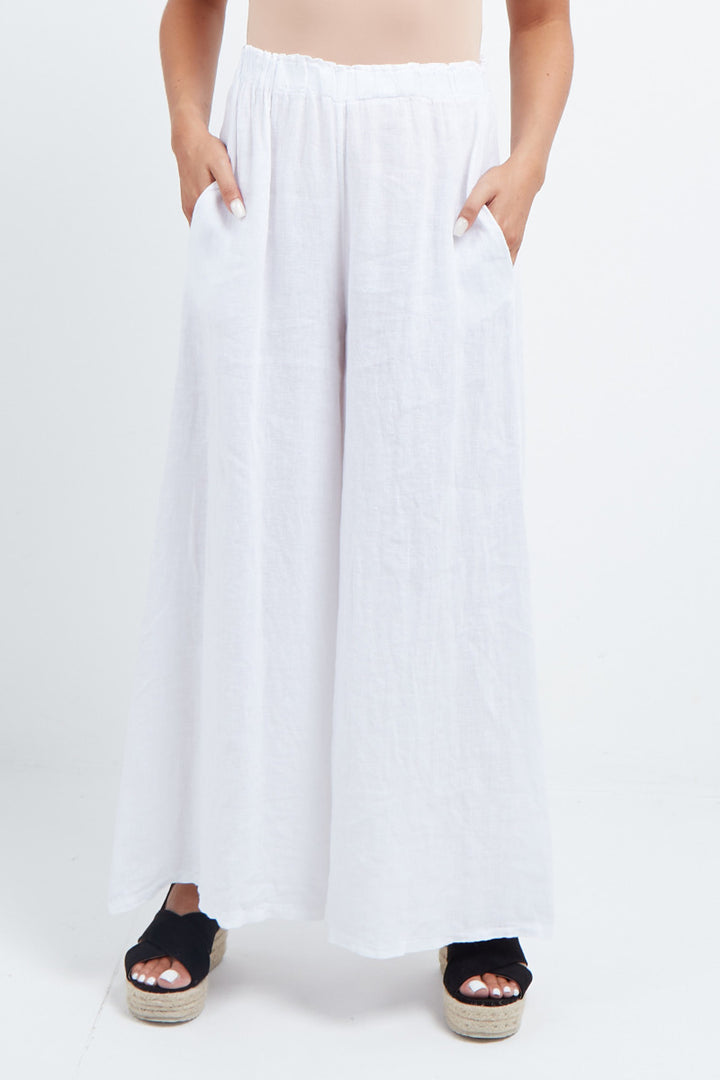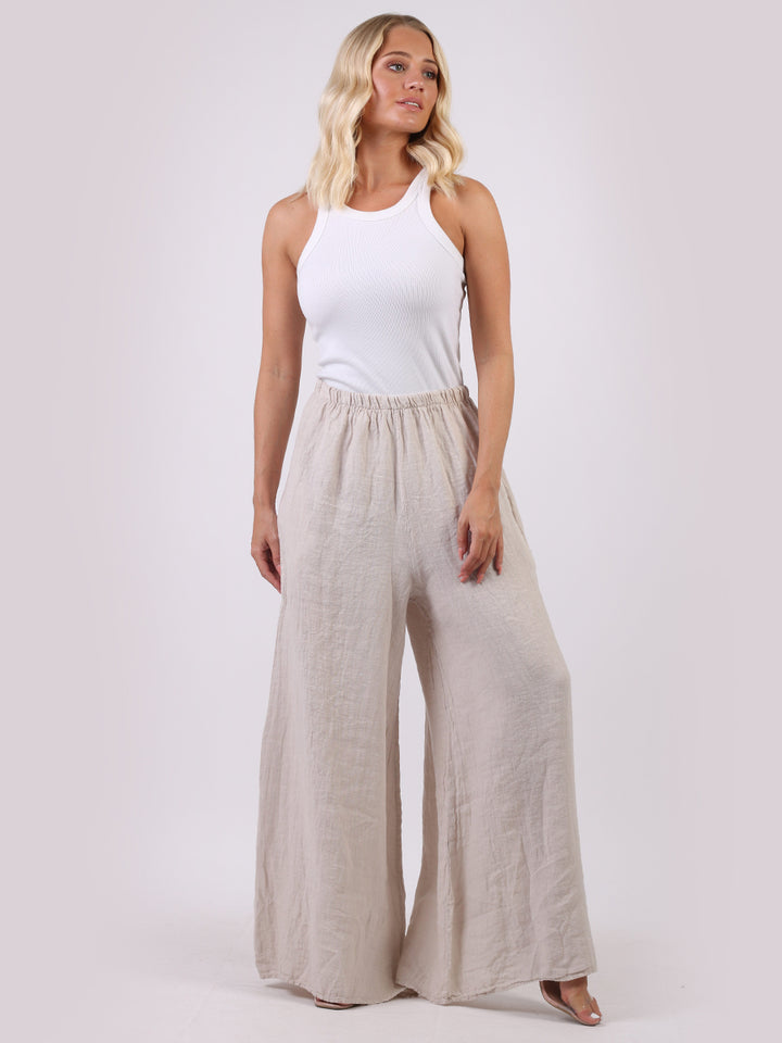 The wardrobe must have that woman wearers need for turning their casual looks into fun-fiestas tic affair! Made to perfection with pure skin friendly linen that flows very nicely with every step, made in Italy with promising quality these wide leg and elastic easy pull on style palazzo pants is classically chic. Dress with skinny crop tops and high heels.