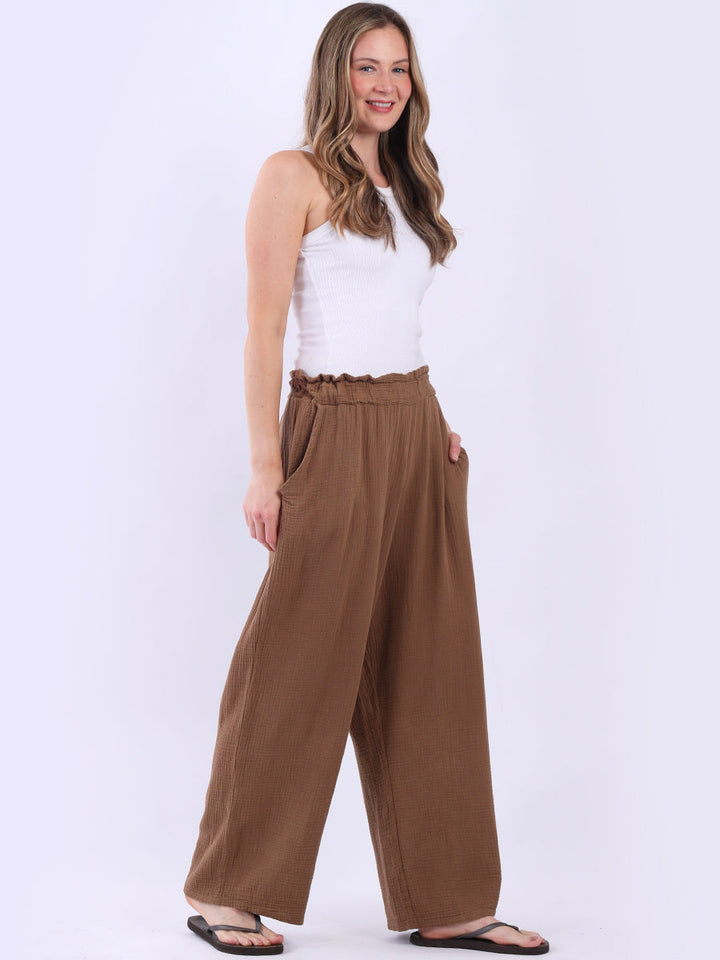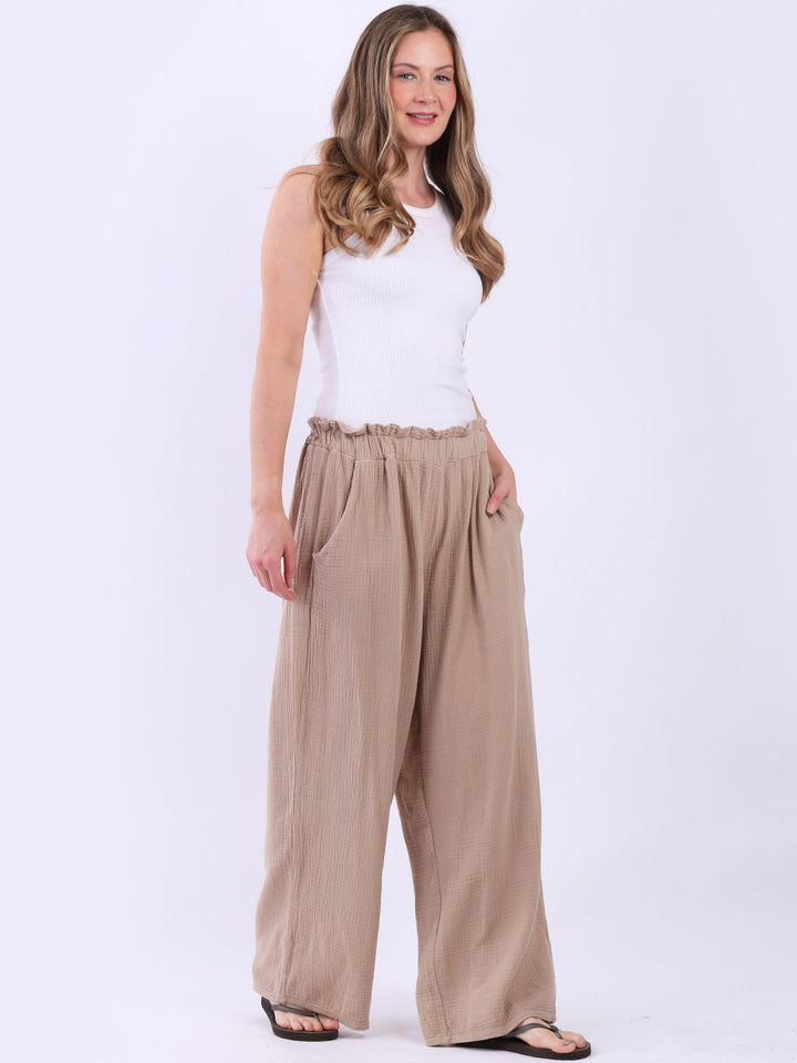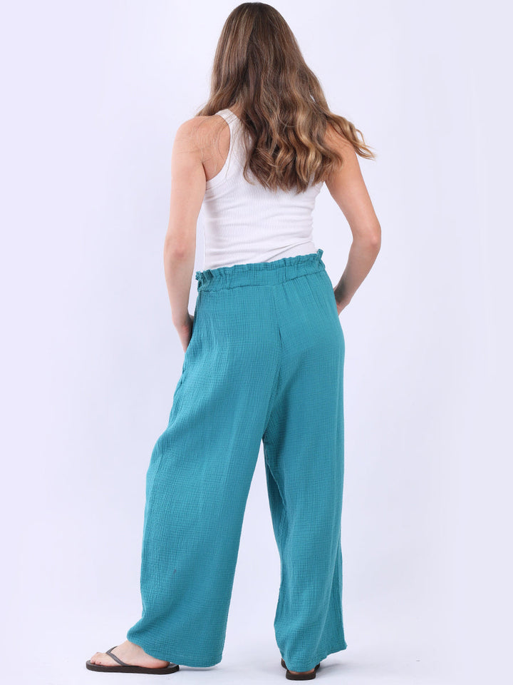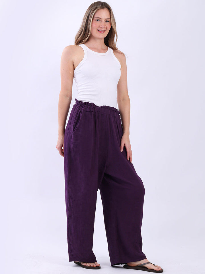 From the latest collection of Redwholesale UK, these plain wide-leg cotton trousers are a wardrobe essential. Everything women wearers desire in a casual outfit, these trousers have, including comfortable elastic waistband, side pockets and wide flowy silhouette. Mix and match them with a floral top for a casual outings with friends.