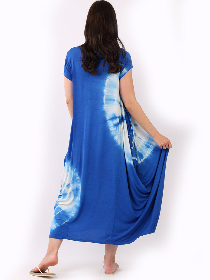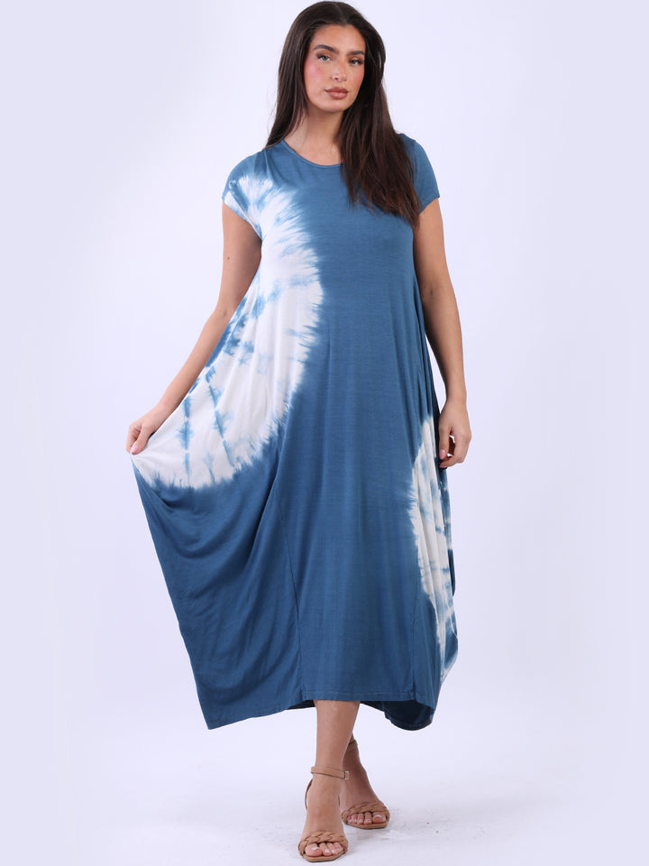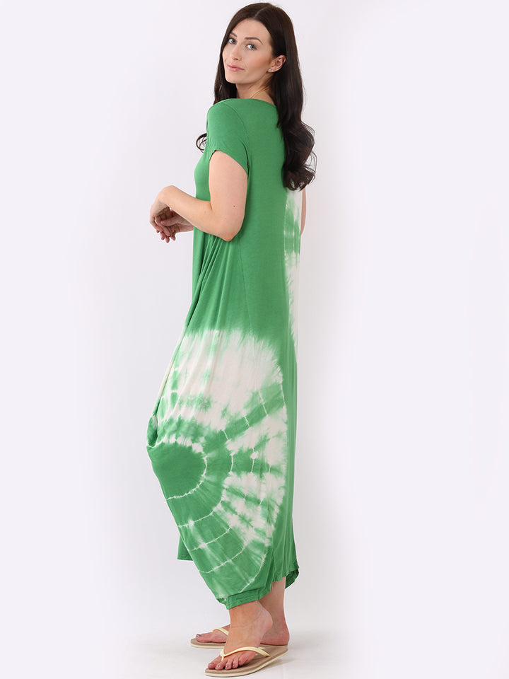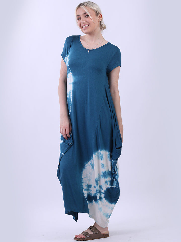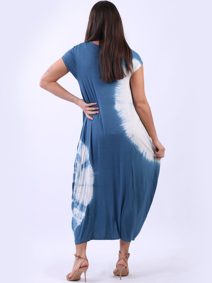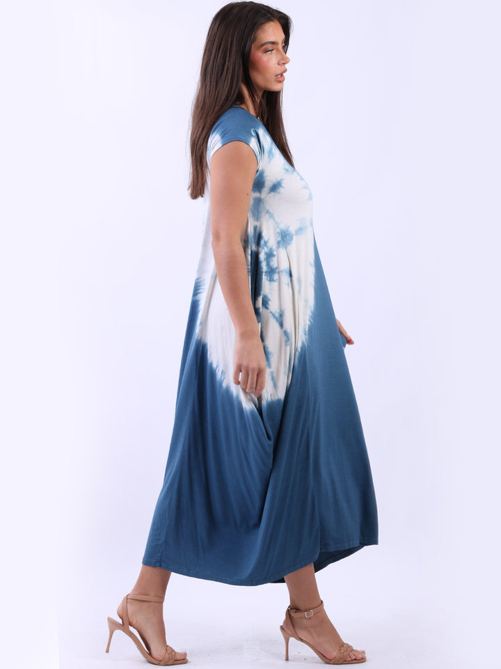 Simple and splendid this is ideal summer attire women wearers would love to add to wardrobes. Made in Italy with perfection baggy and plus size fit the classic timeless tie and dye print with basic round neckline, front pockets and maxi style makes it a go-to cover-all from every day wear to sandy beaches. Team it with flip-flops and Mexican hat.