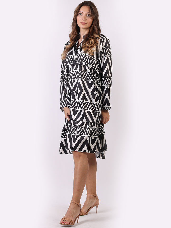 Authentic and attractive with many qualities of must have this is made in Italy with finest durable fabric that would add a touch of class to women wardrobe instantly. Band collar neckline with a plunging V, baggy plus size fit and long sleeves all make it more desirable and demanding. Dress it with capris and sandals.