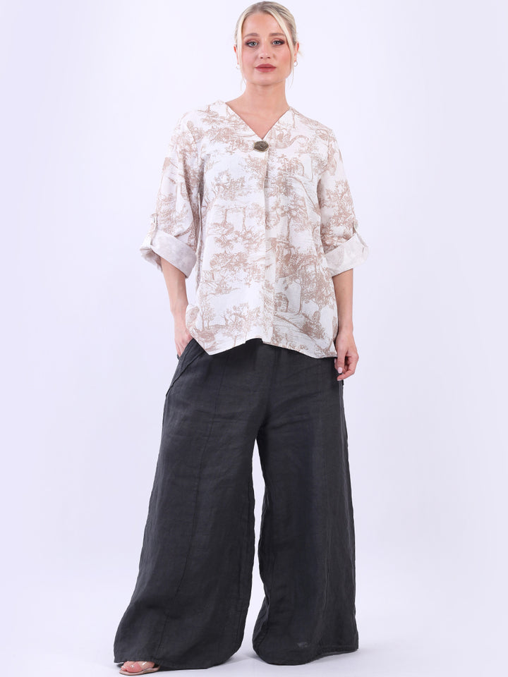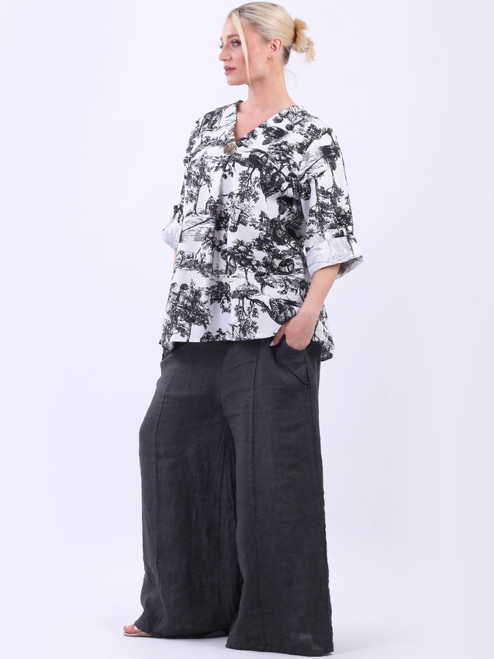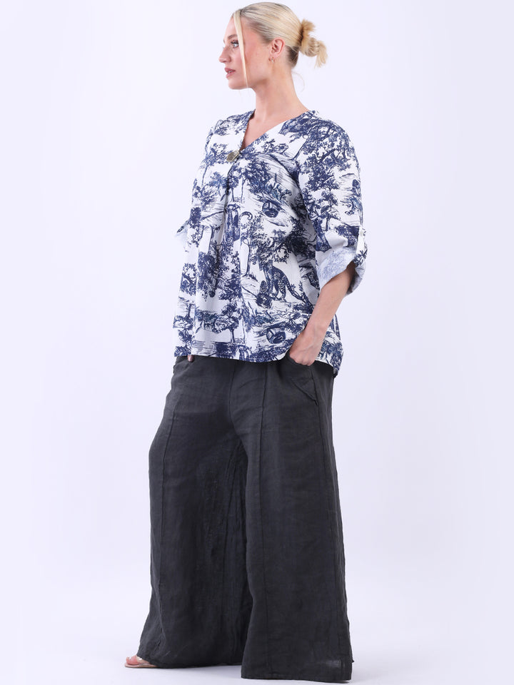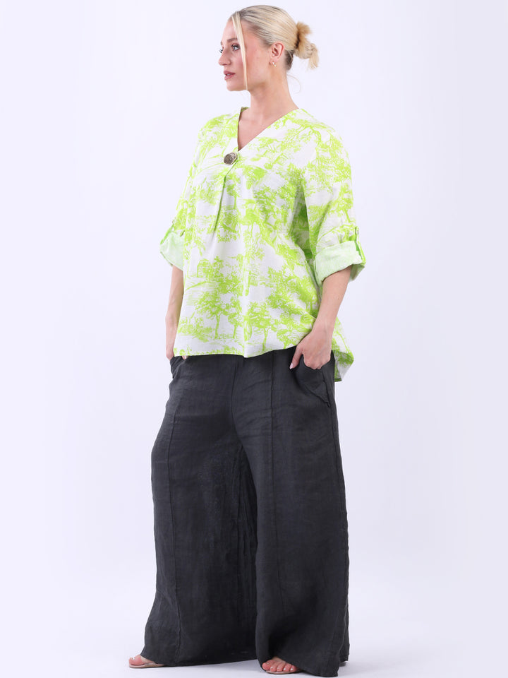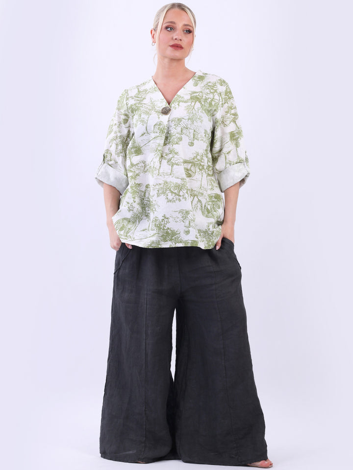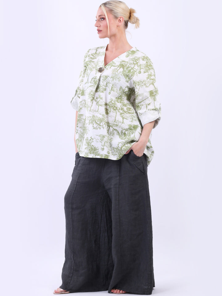 Iconic and rich this is the luxurious look that is very popular among women wearers. Made in Italy with finest and soft linen that is skin friendly with stunning barn jungle duo print with plunging V-neckline and button detailing. Baggy and plus size with versatile rolled up sleeves the top would suit ideally with wide leg pants and high heels for office and formal events alike.