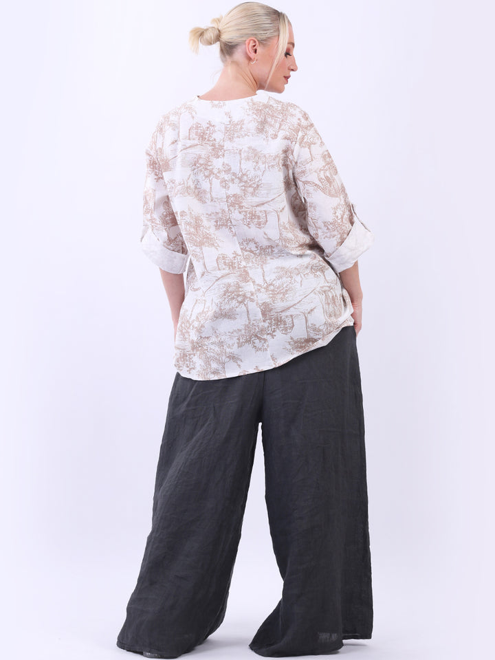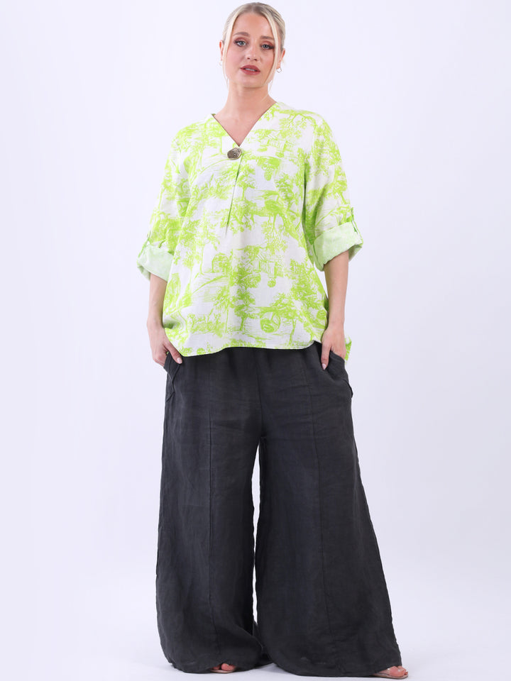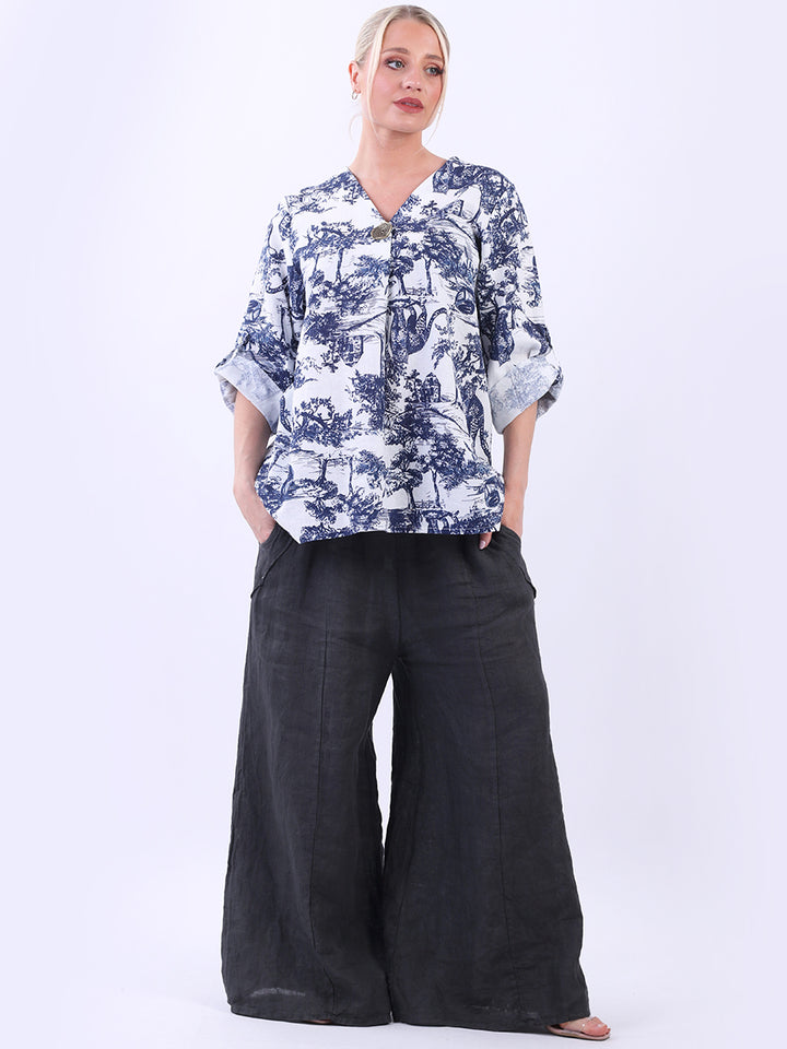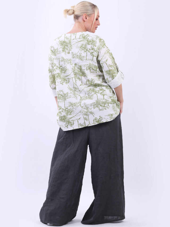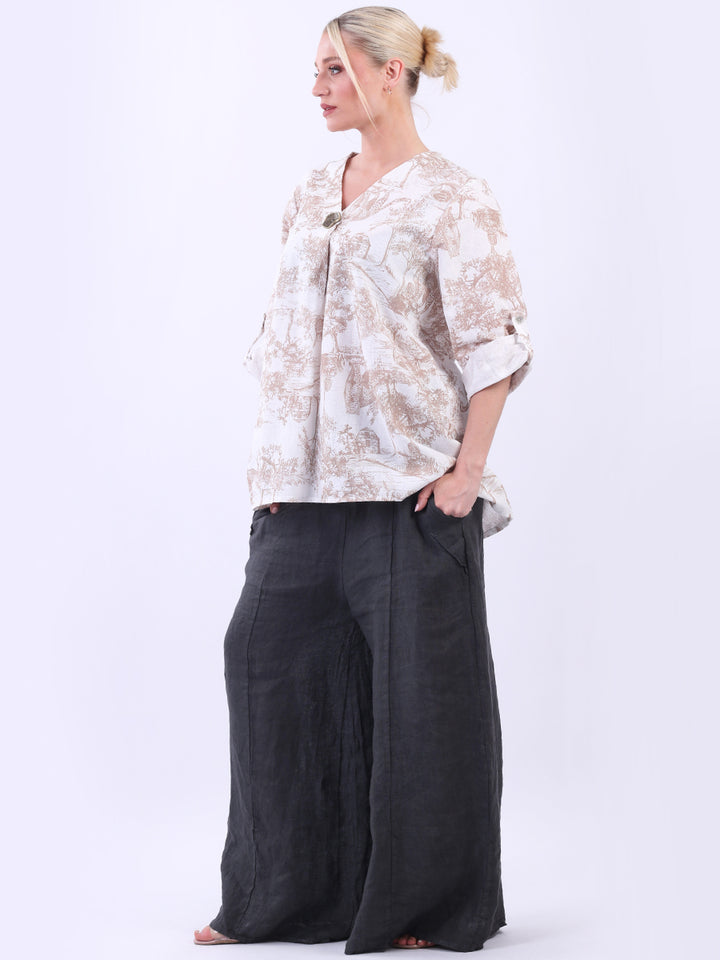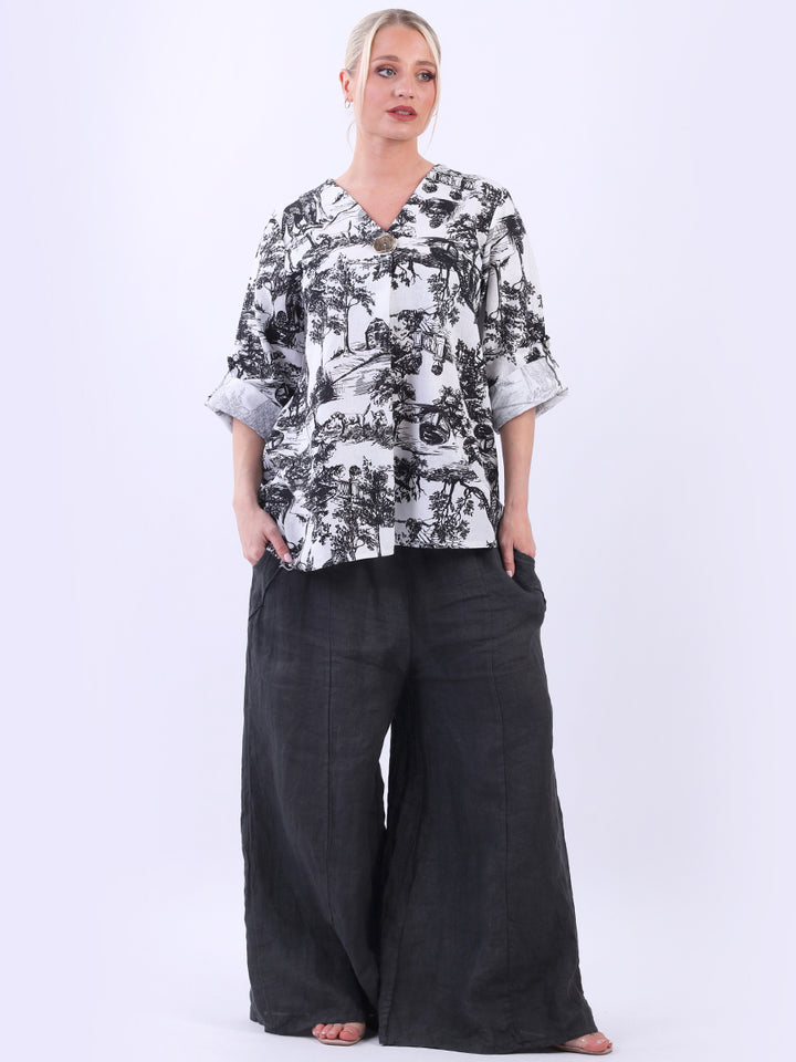 Iconic and rich this is the luxurious look that is very popular among women wearers. Made in Italy with finest and soft linen that is skin friendly with stunning barn jungle duo print with plunging V-neckline and button detailing. Baggy and plus size with versatile rolled up sleeves the top would suit ideally with wide leg pants and high heels for office and formal events alike.
