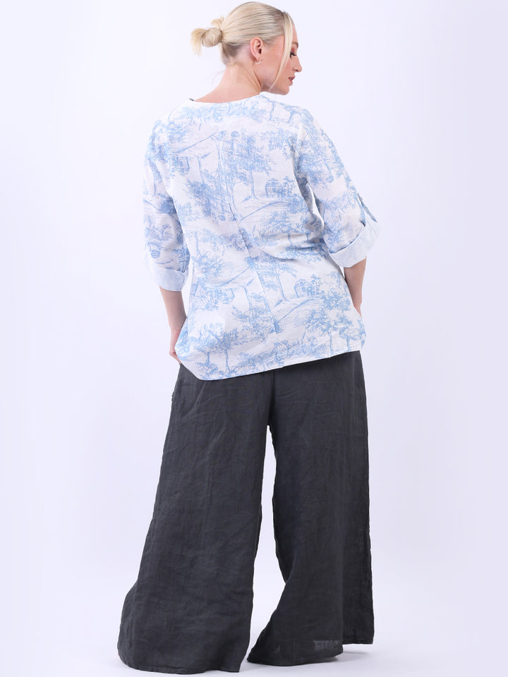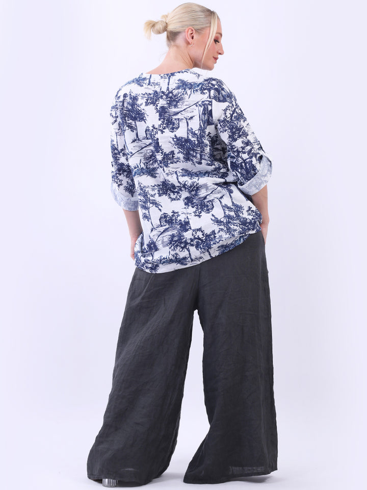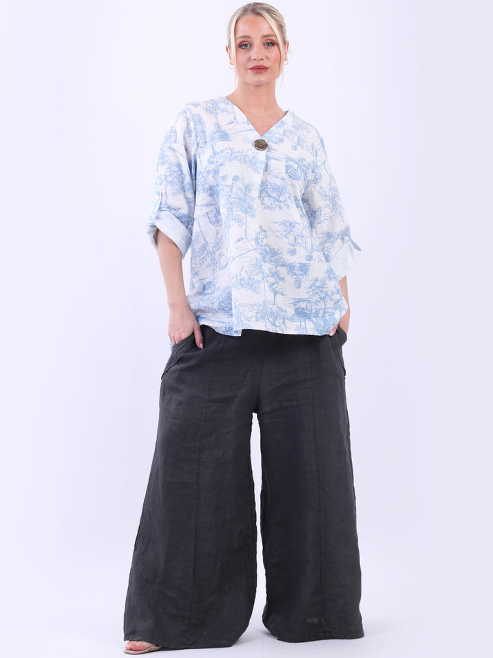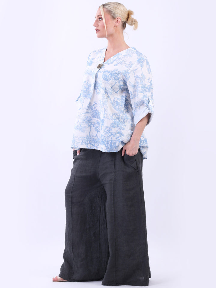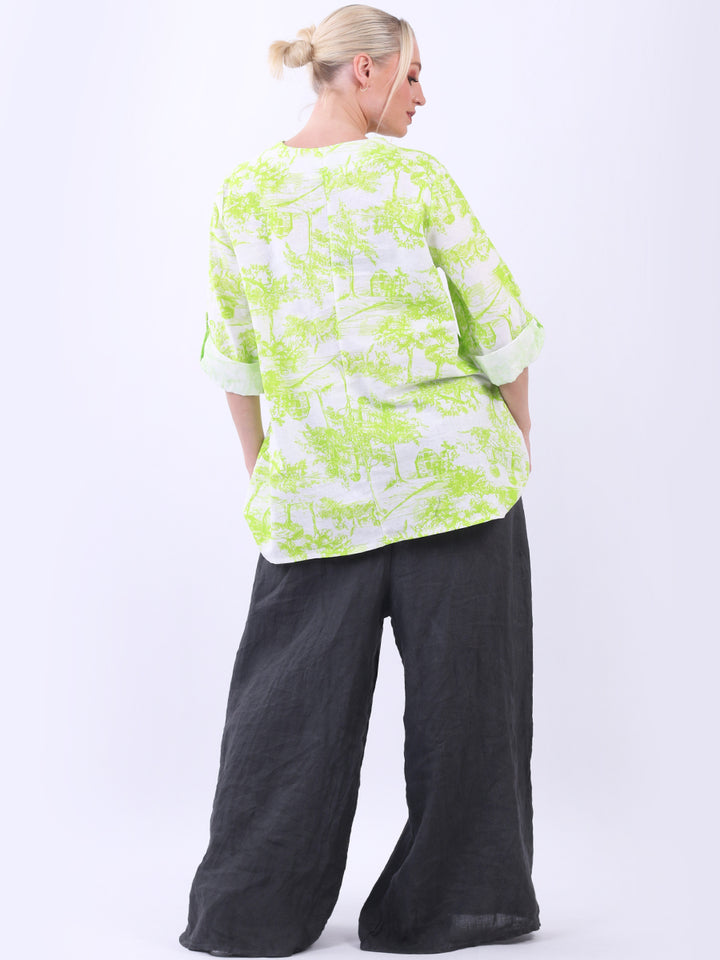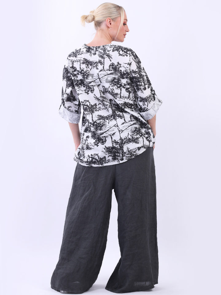 Iconic and rich this is the luxurious look that is very popular among women wearers. Made in Italy with finest and soft linen that is skin friendly with stunning barn jungle duo print with plunging V-neckline and button detailing. Baggy and plus size with versatile rolled up sleeves the top would suit ideally with wide leg pants and high heels for office and formal events alike.