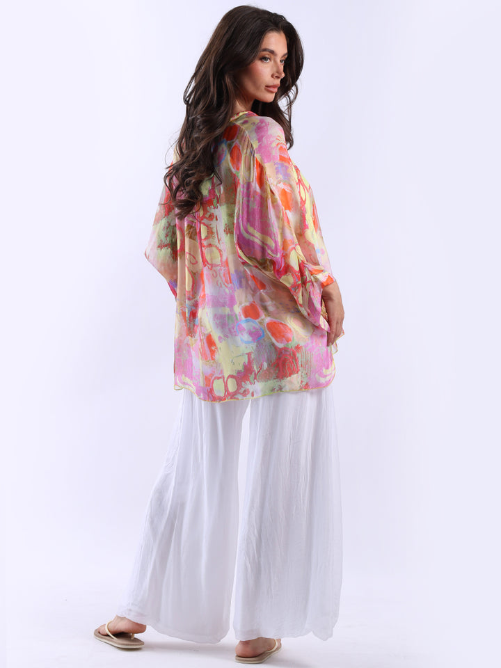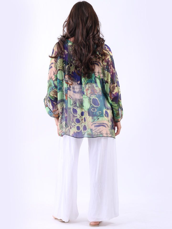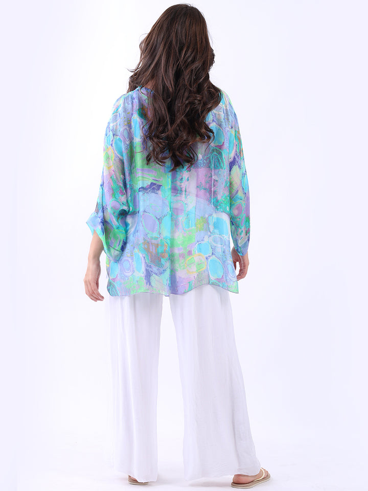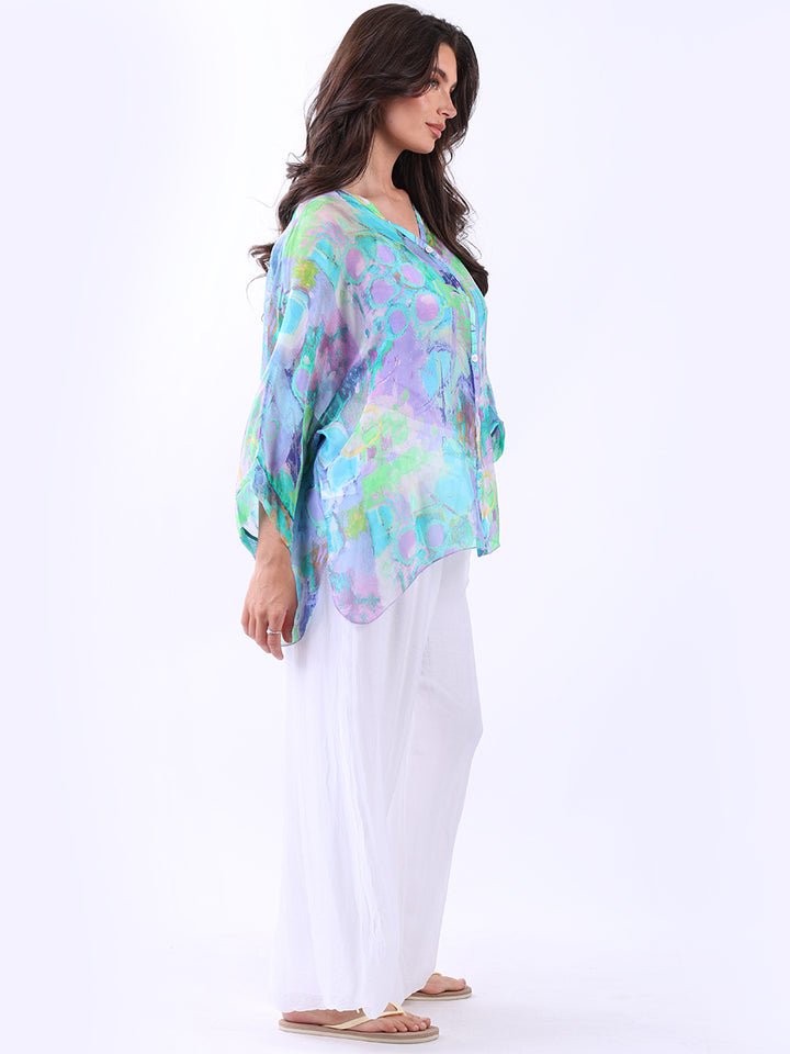 Women wearers can add a modern, luxurious, and trendy addition to their wardrobe with this beautifully crafted double-layer silk tunic shirt. Made in Italy from Lightweight and breathable silk, the shirt features a striking tie and dye print, adding a vibrant flair to any outfit. The deep V-neckline and front button detailing offer a flattering touch, while the short baggy sleeves and relaxed fit make it perfect for plus-size wearers. Mix and match it with wide leg silk bottoms or denims for a laid-back finish for summer evenings.