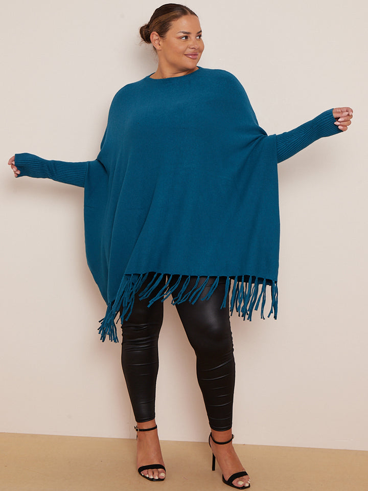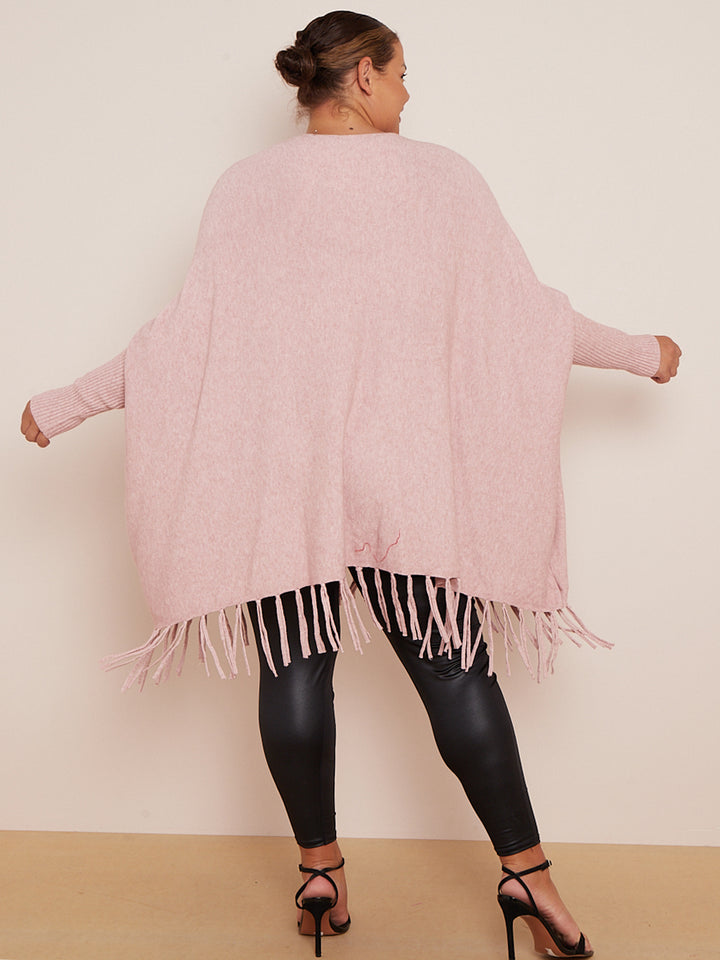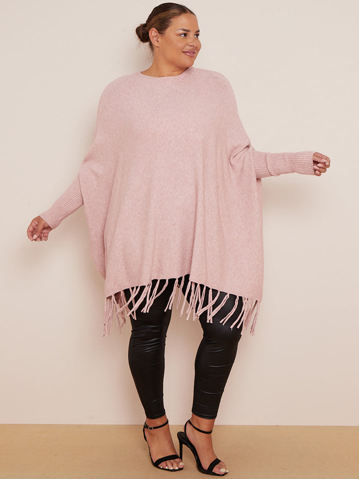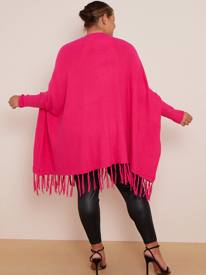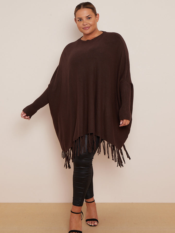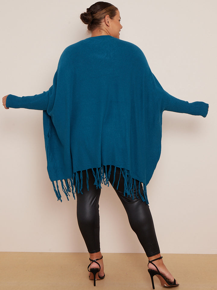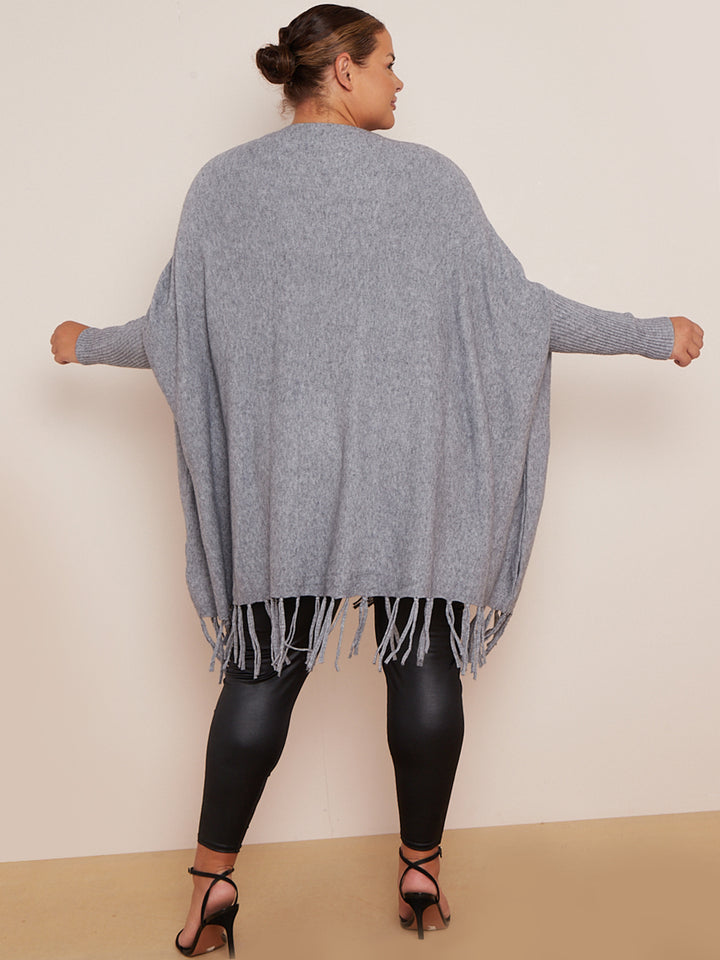 Plus Size Plain Knitted Ribbed Sleeves Fringed-Hem Tunic Poncho