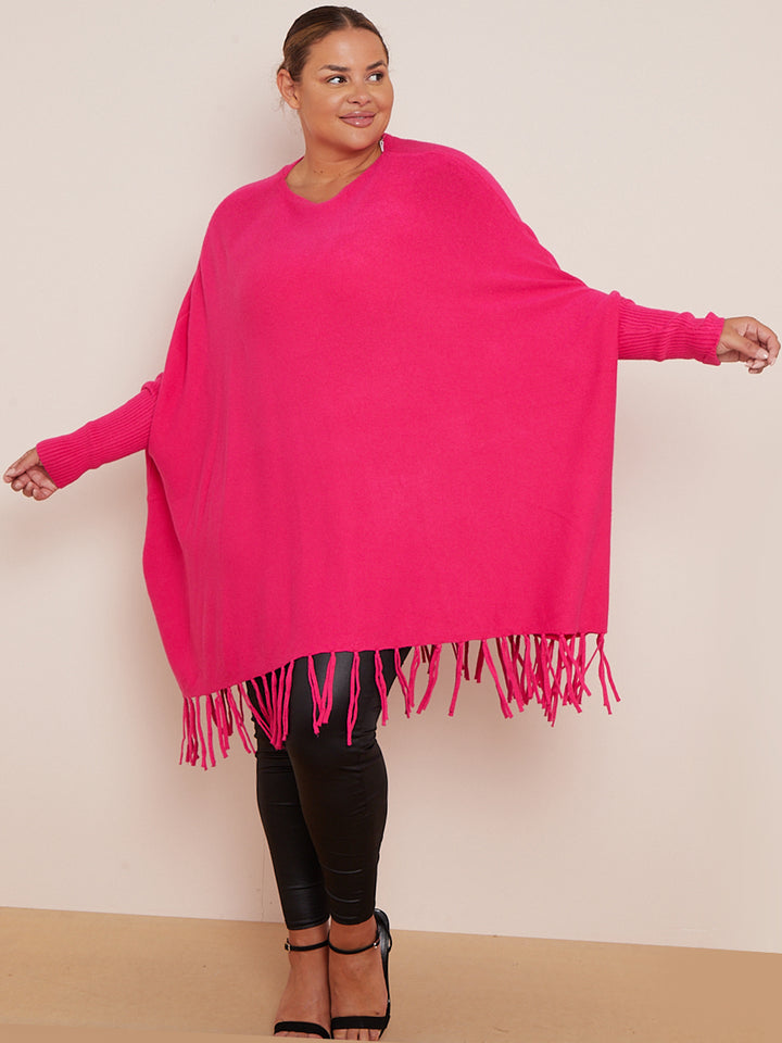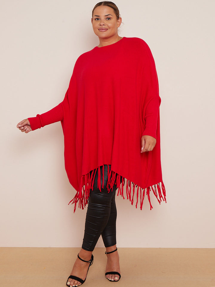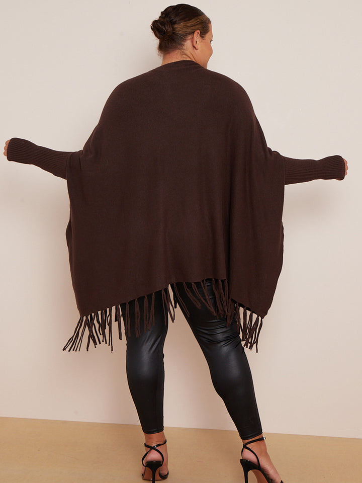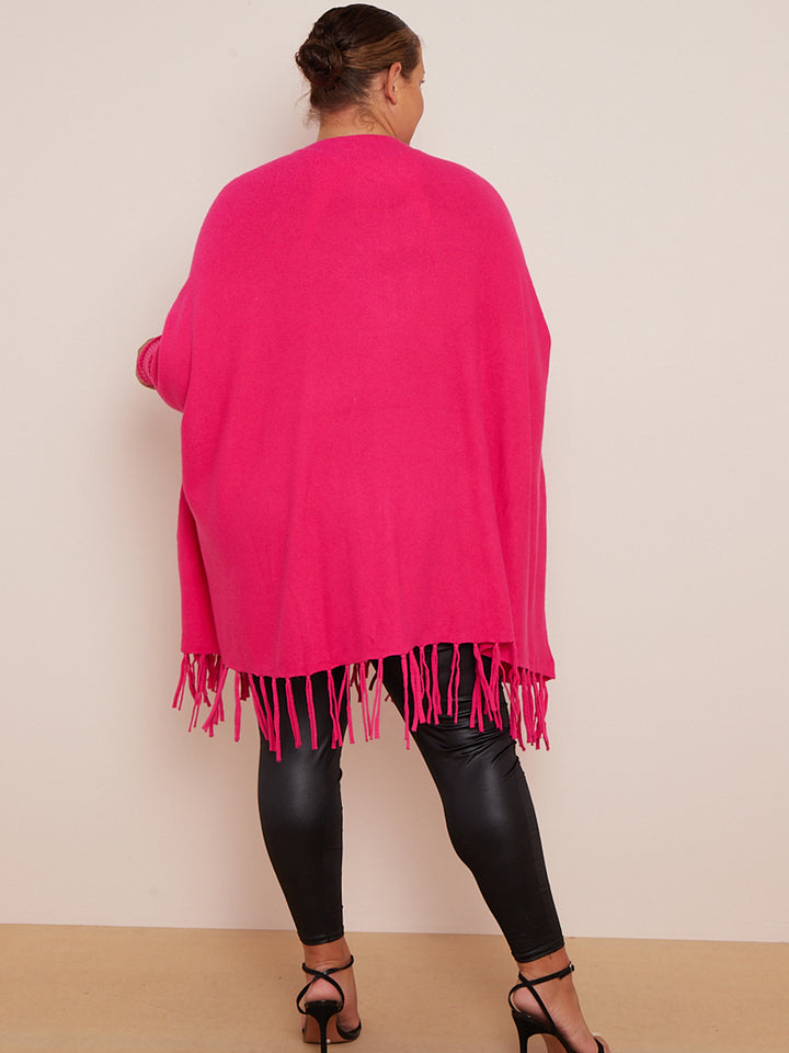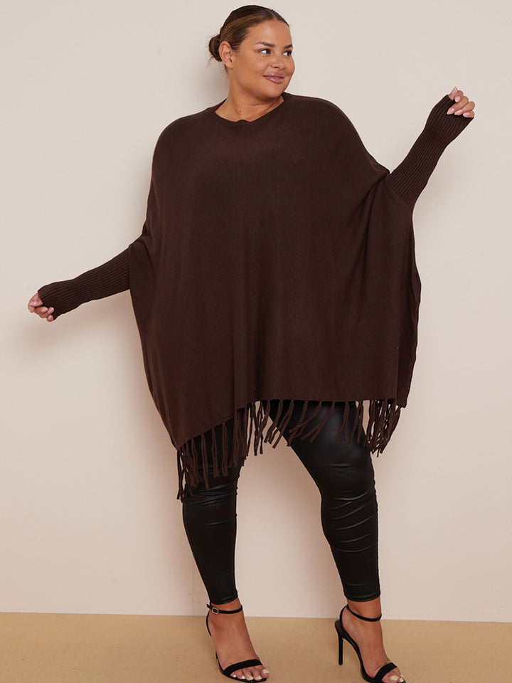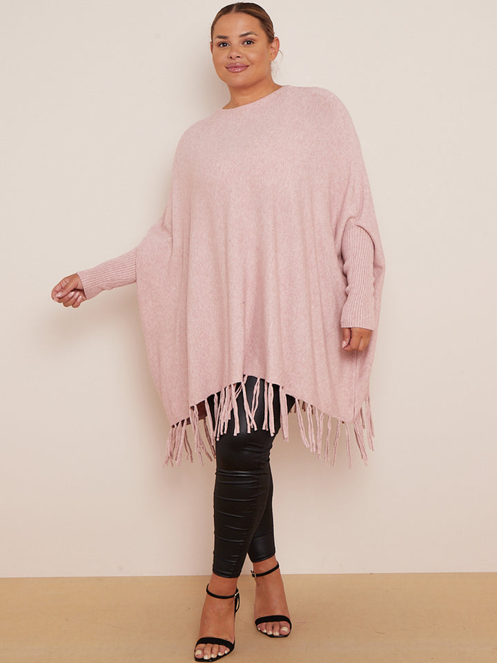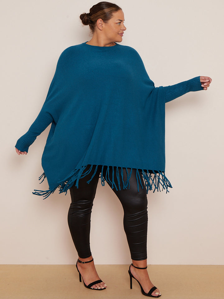 Plus Size Plain Knitted Ribbed Sleeves Fringed-Hem Tunic Poncho