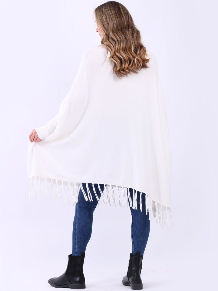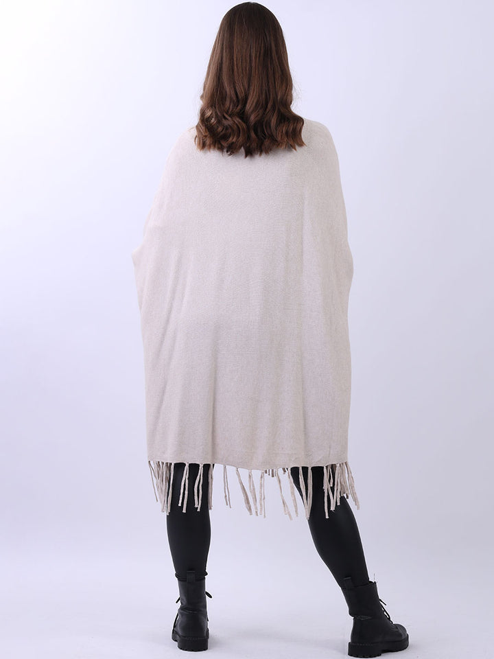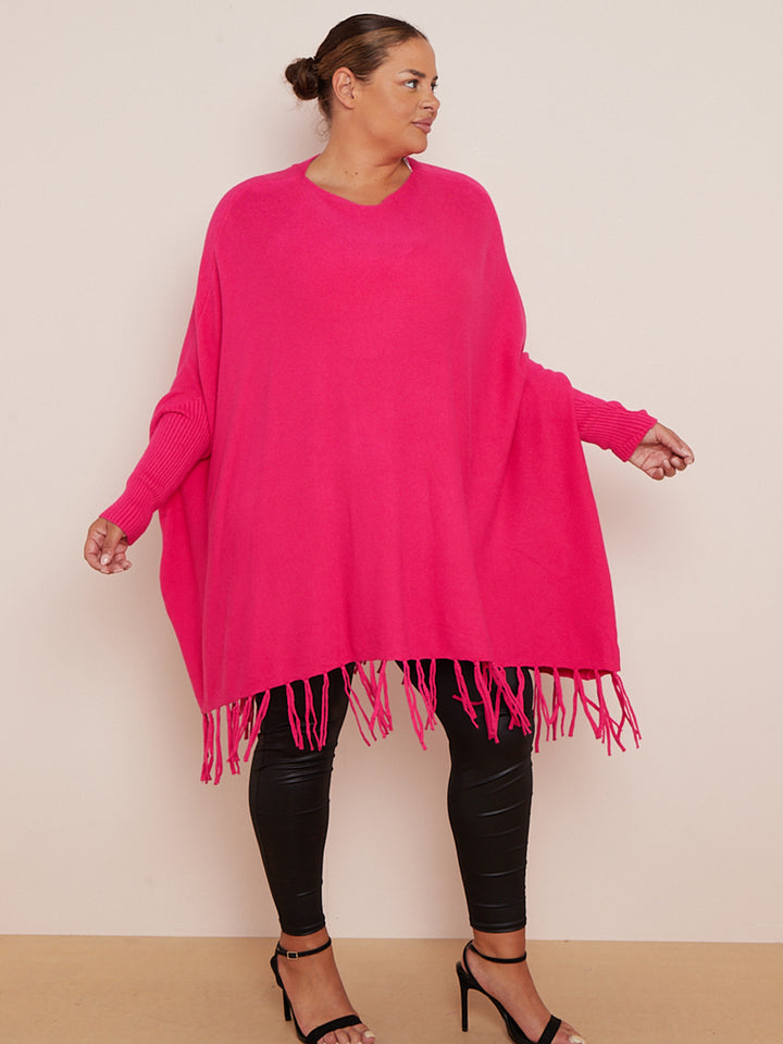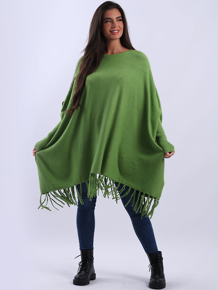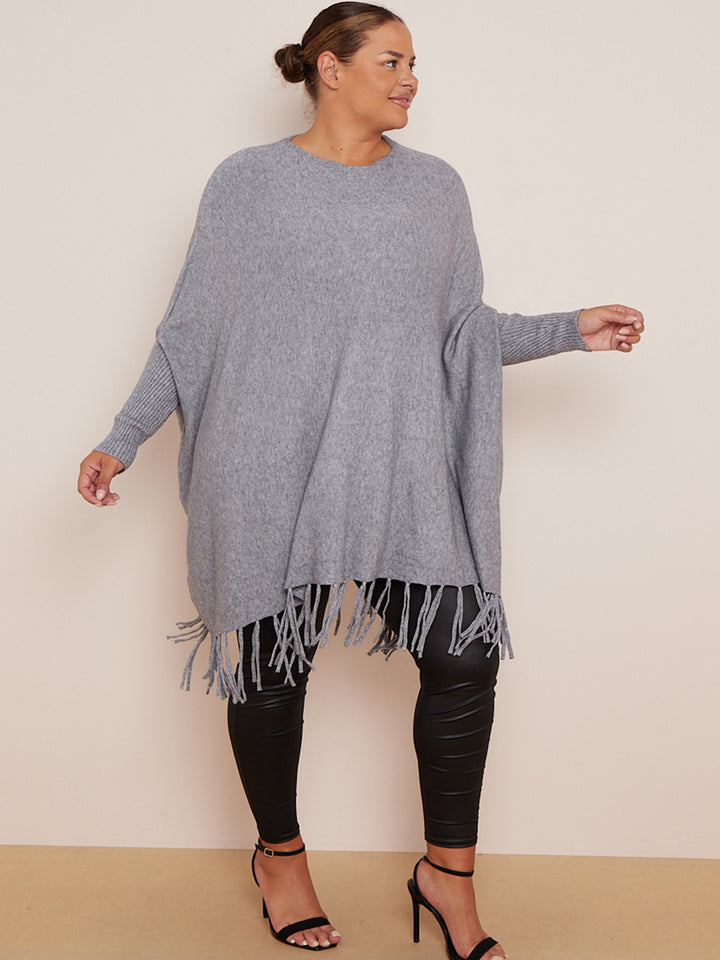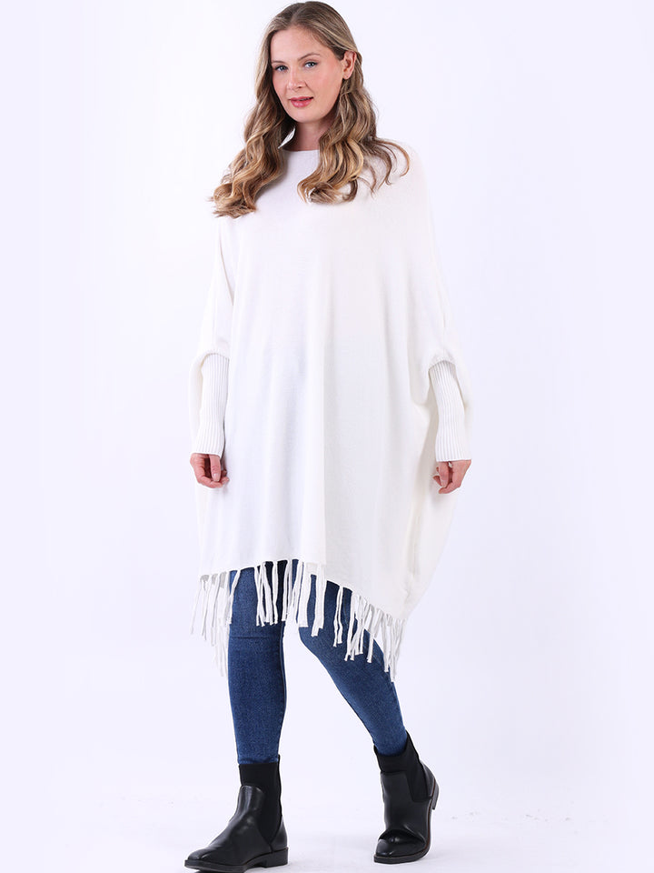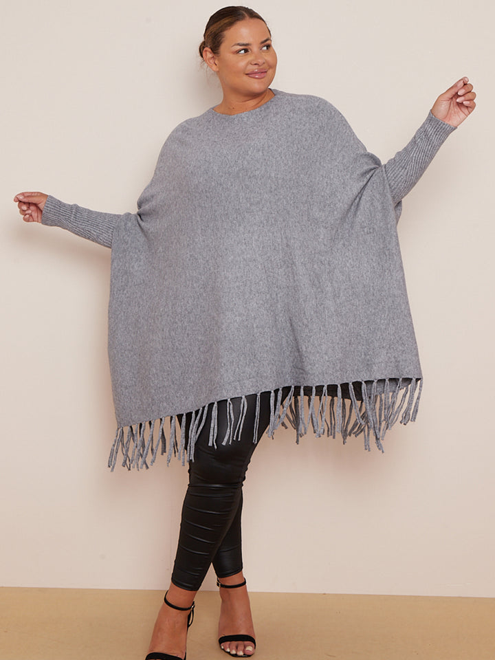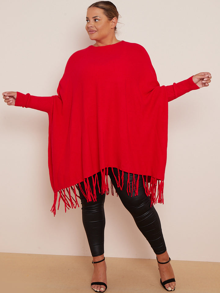 Plus Size Plain Knitted Ribbed Sleeves Fringed-Hem Tunic Poncho