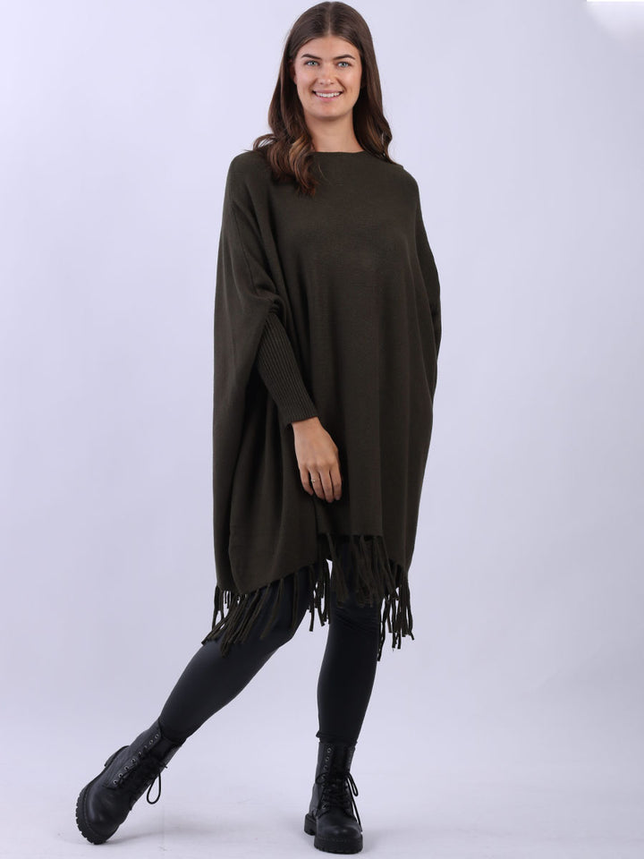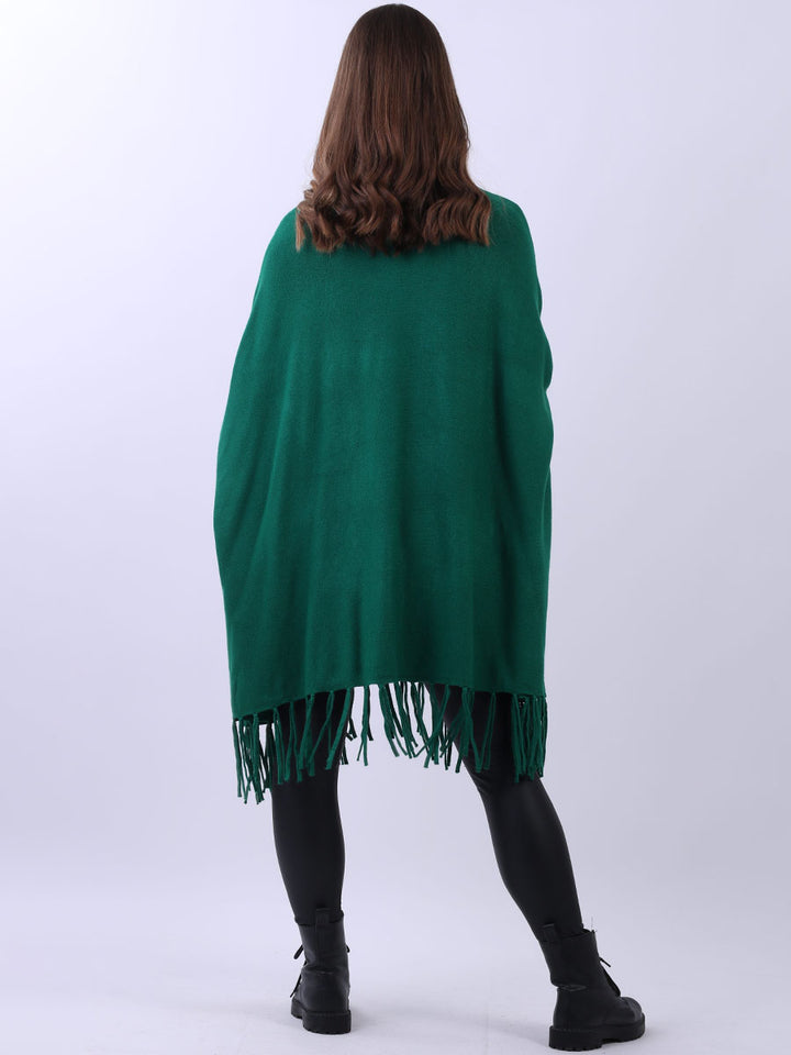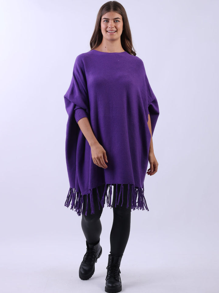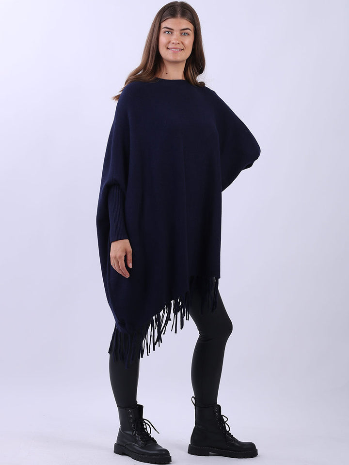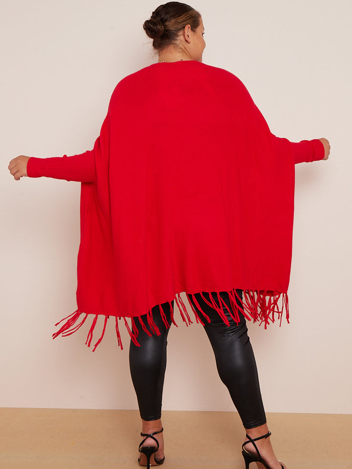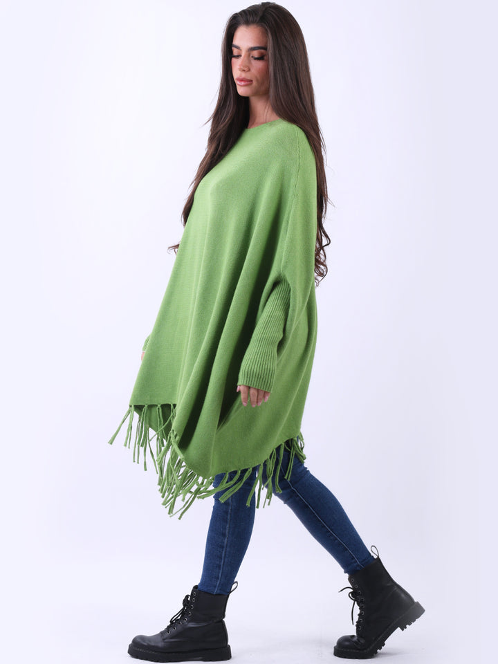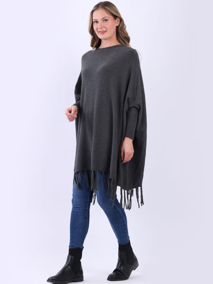 Plus Size Plain Knitted Ribbed Sleeves Fringed-Hem Tunic Poncho