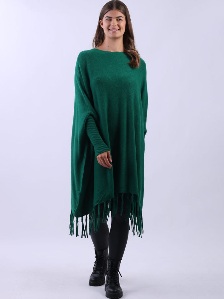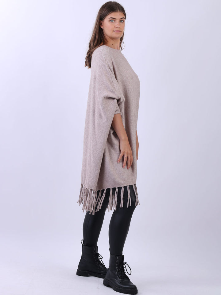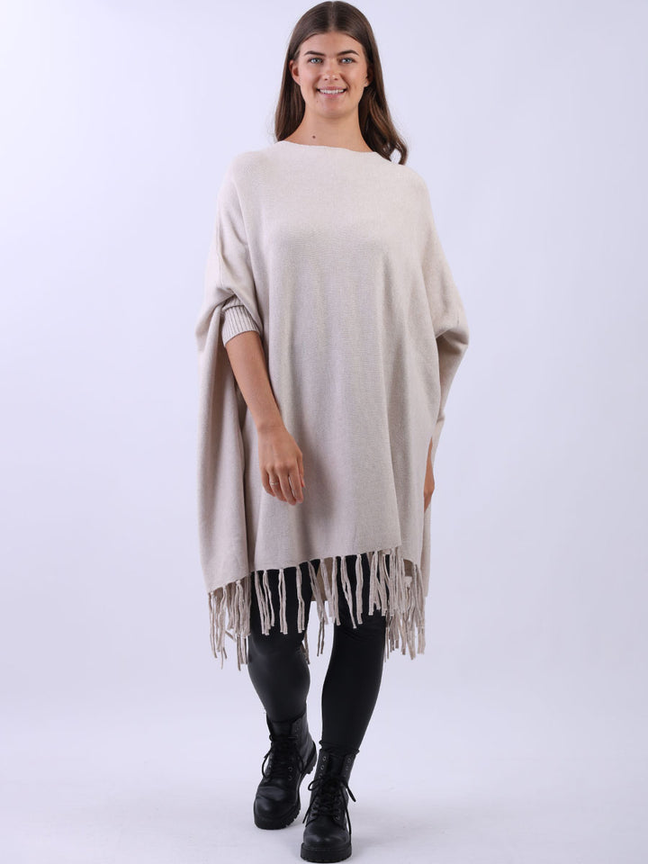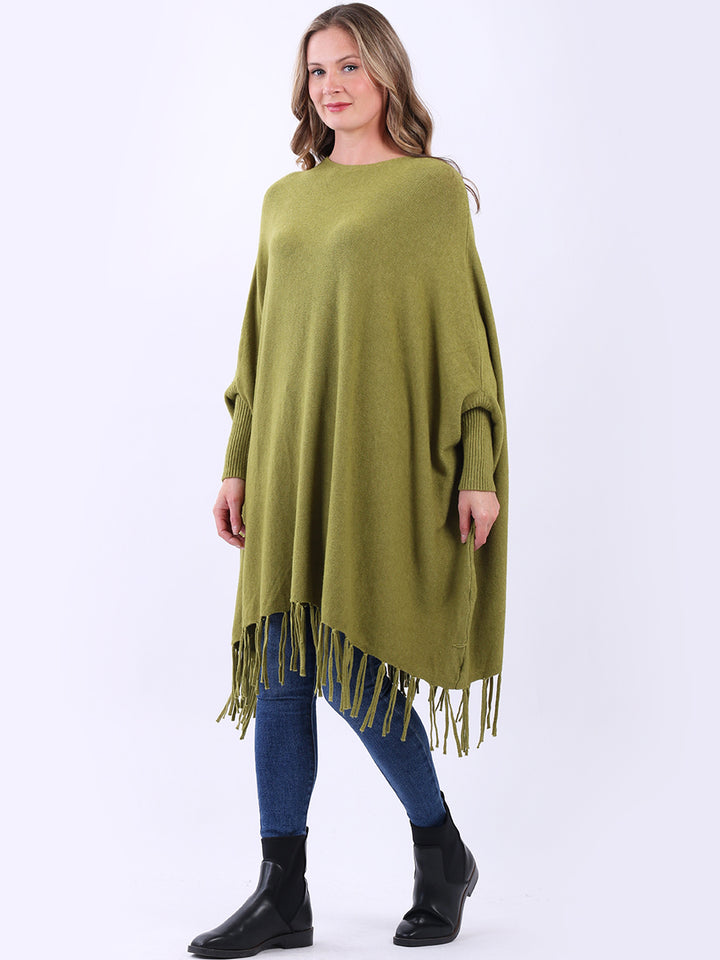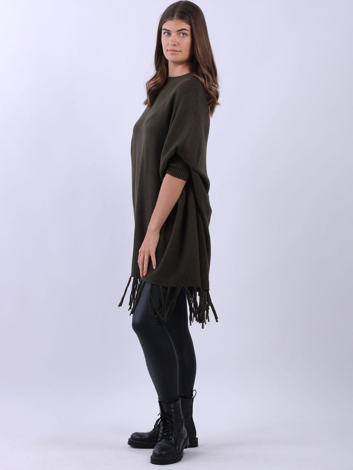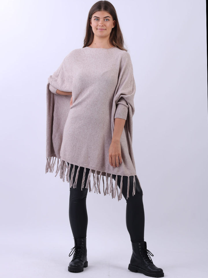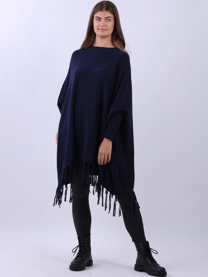 Plus Size Plain Knitted Ribbed Sleeves Fringed-Hem Tunic Poncho