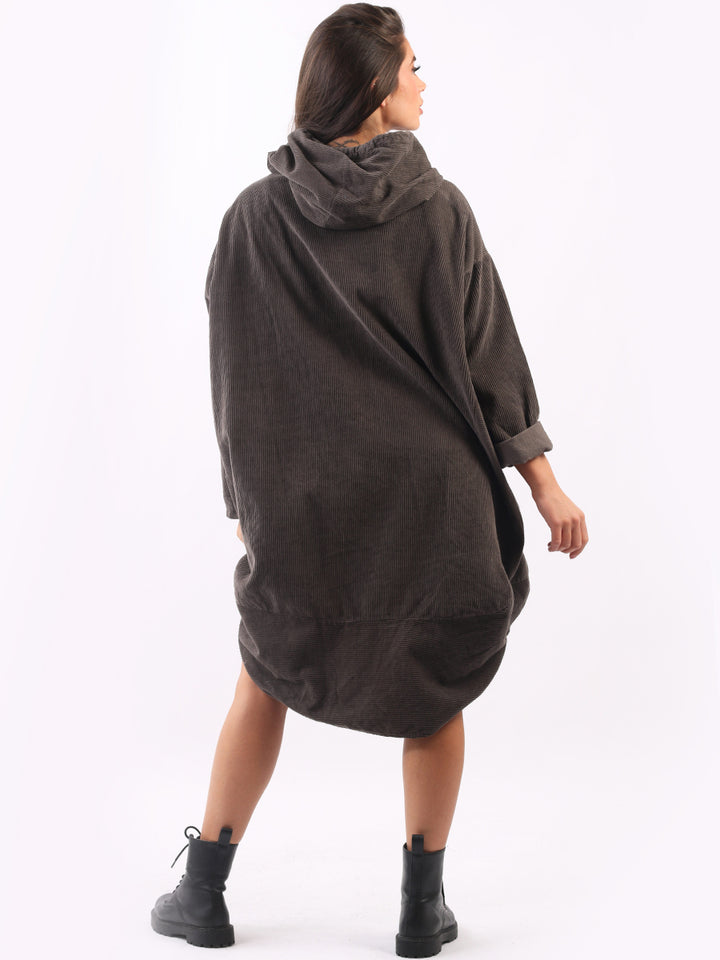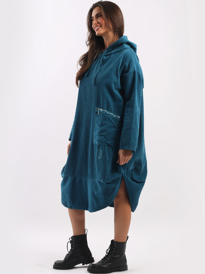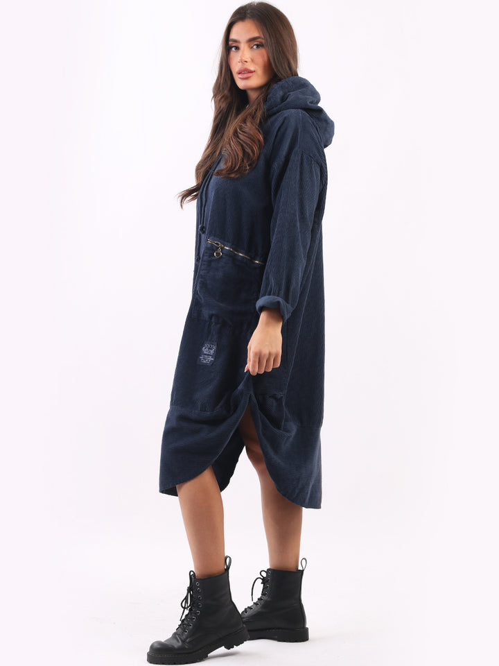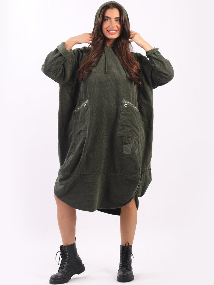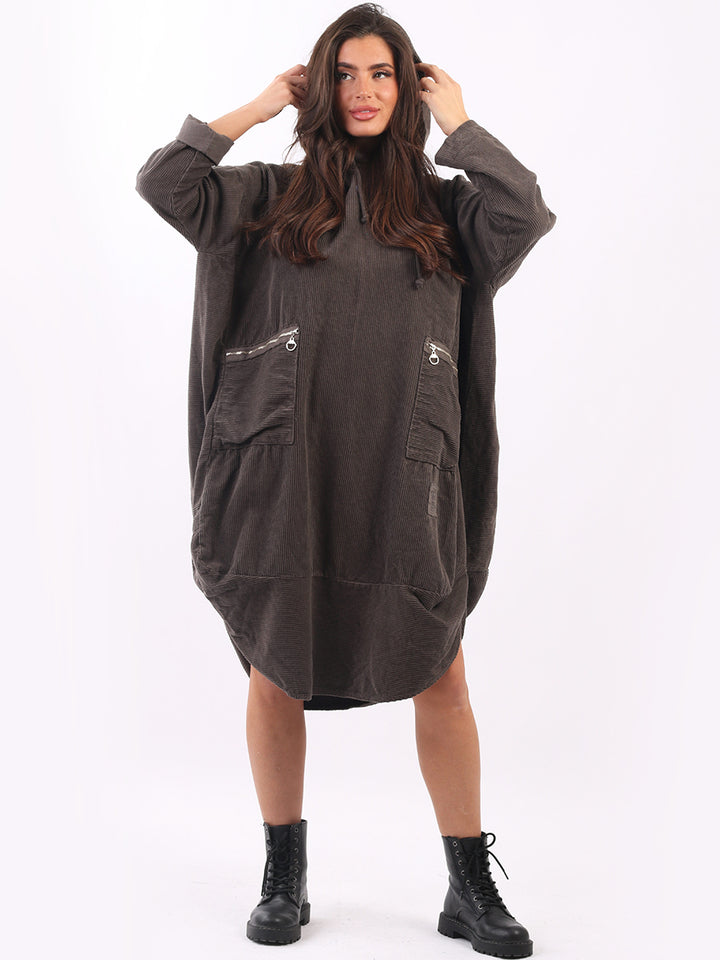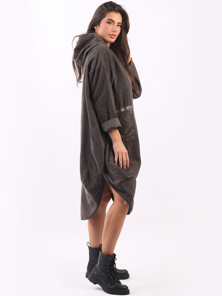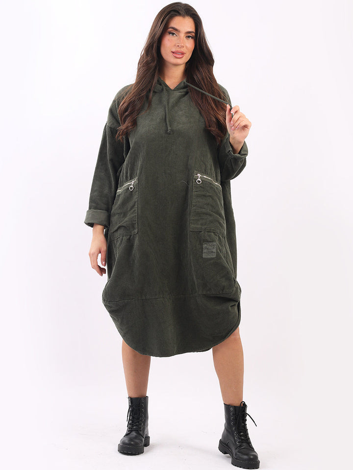 Redwholesale women clothing online store London presents this corduroy lagenlook dress to give an ideal Italian casual fashion look to women wearers. Plus Size, the hooded dress is made of pure, high-quality soft cotton and has long rolled up sleeves, a round hem and front zipper pockets. Dress it with long boots for laid back styling done right.