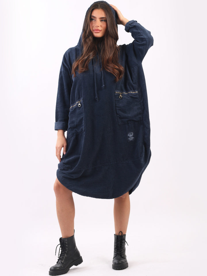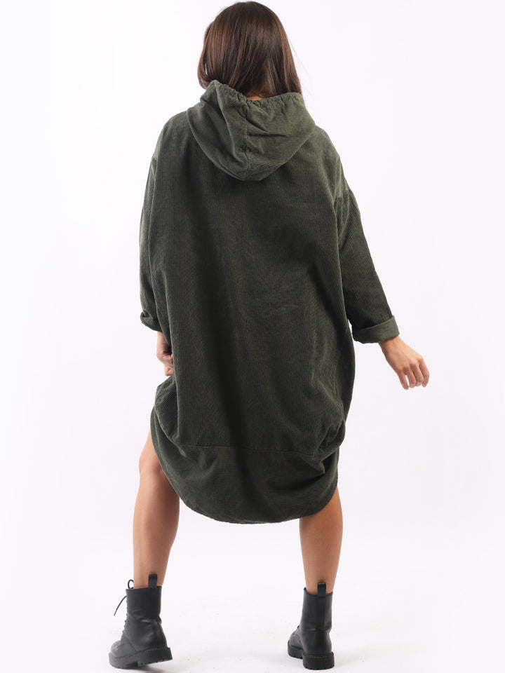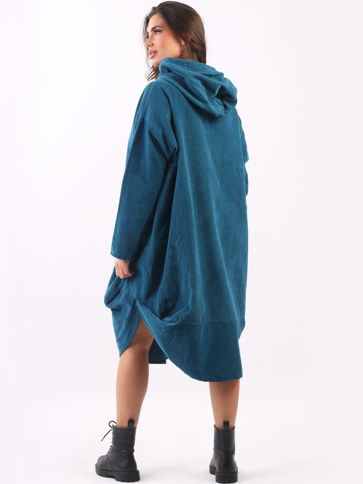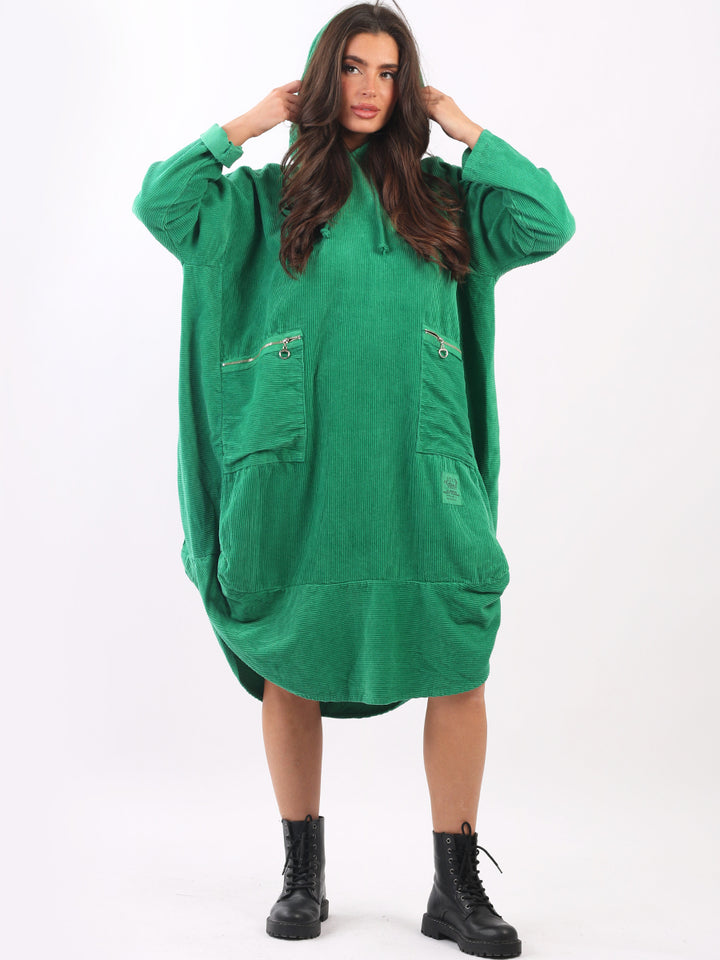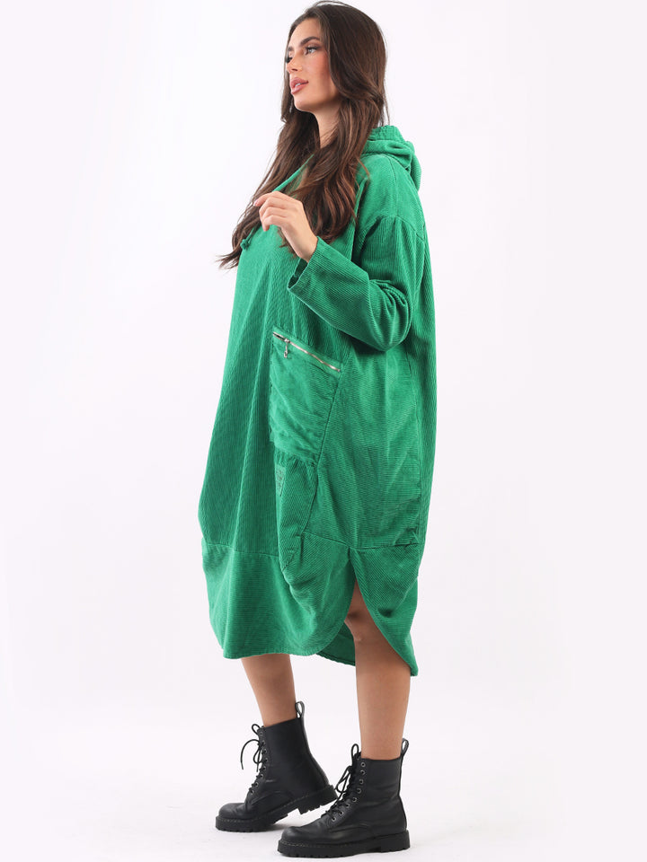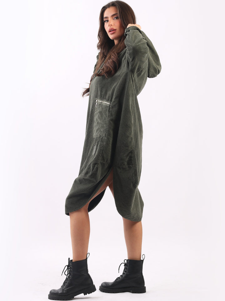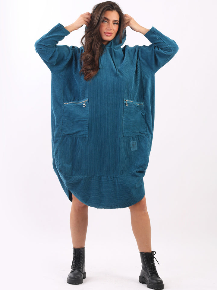 Redwholesale women clothing online store London presents this corduroy lagenlook dress to give an ideal Italian casual fashion look to women wearers. Plus Size, the hooded dress is made of pure, high-quality soft cotton and has long rolled up sleeves, a round hem and front zipper pockets. Dress it with long boots for laid back styling done right.