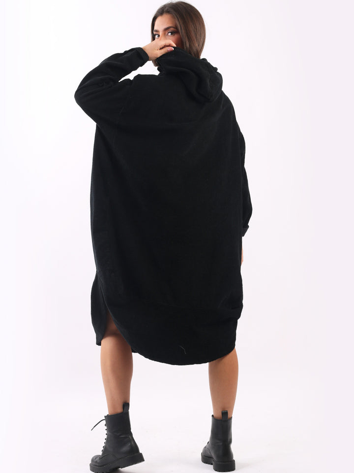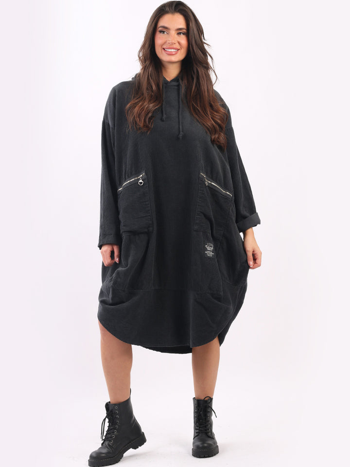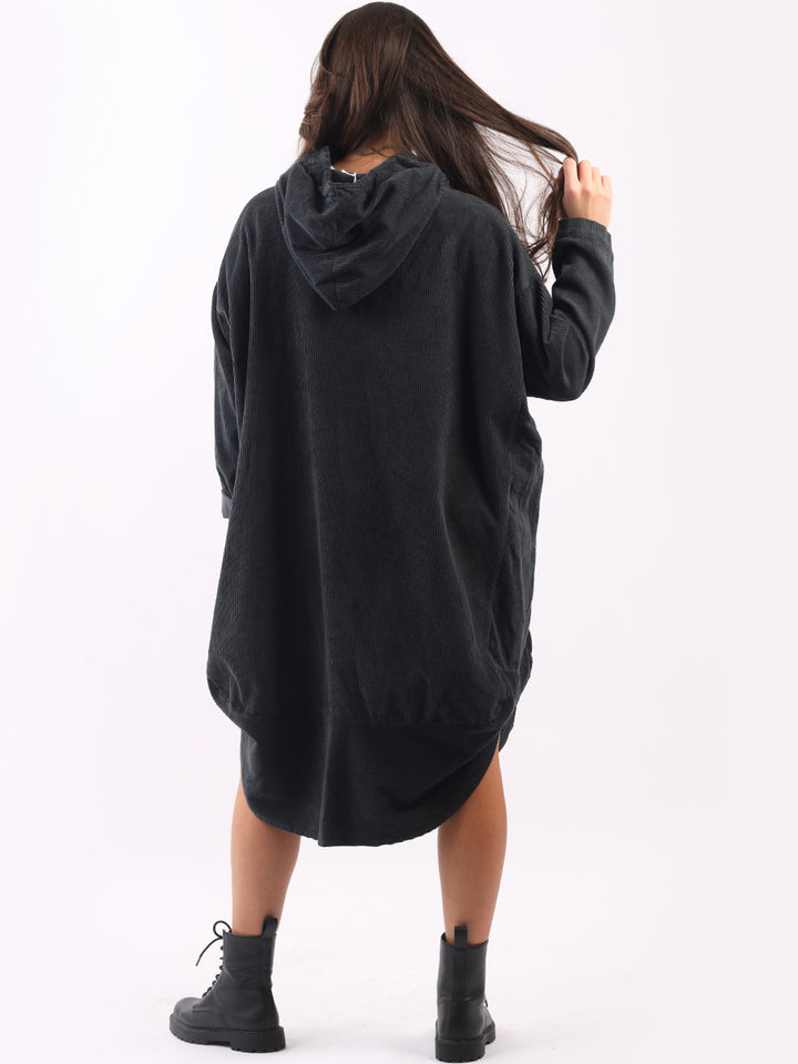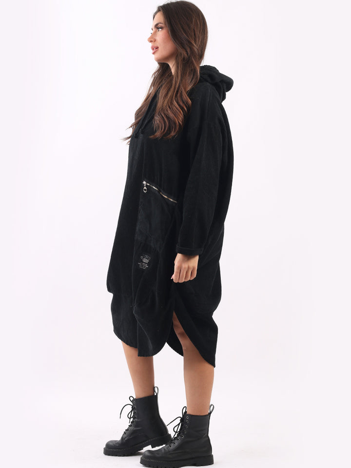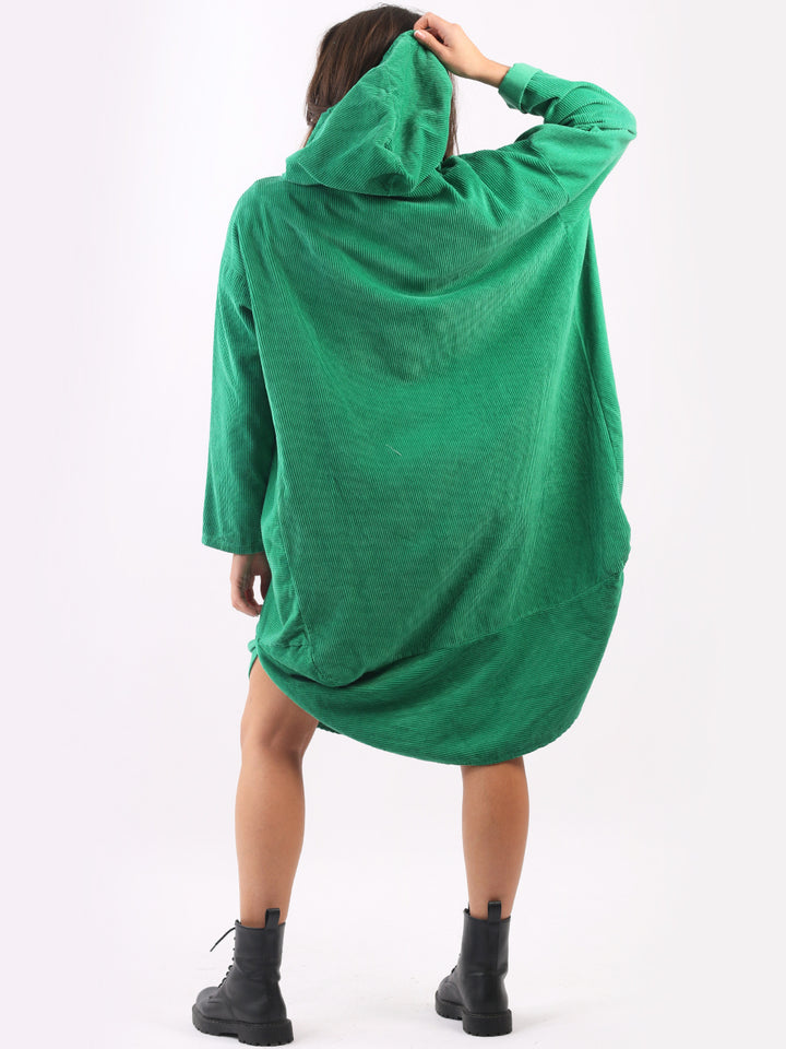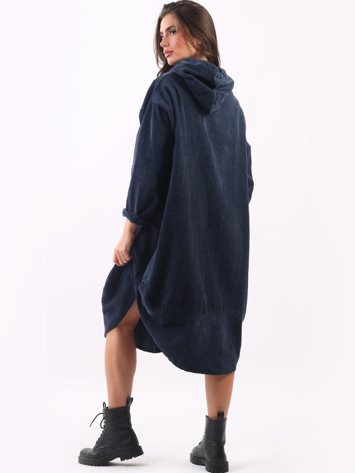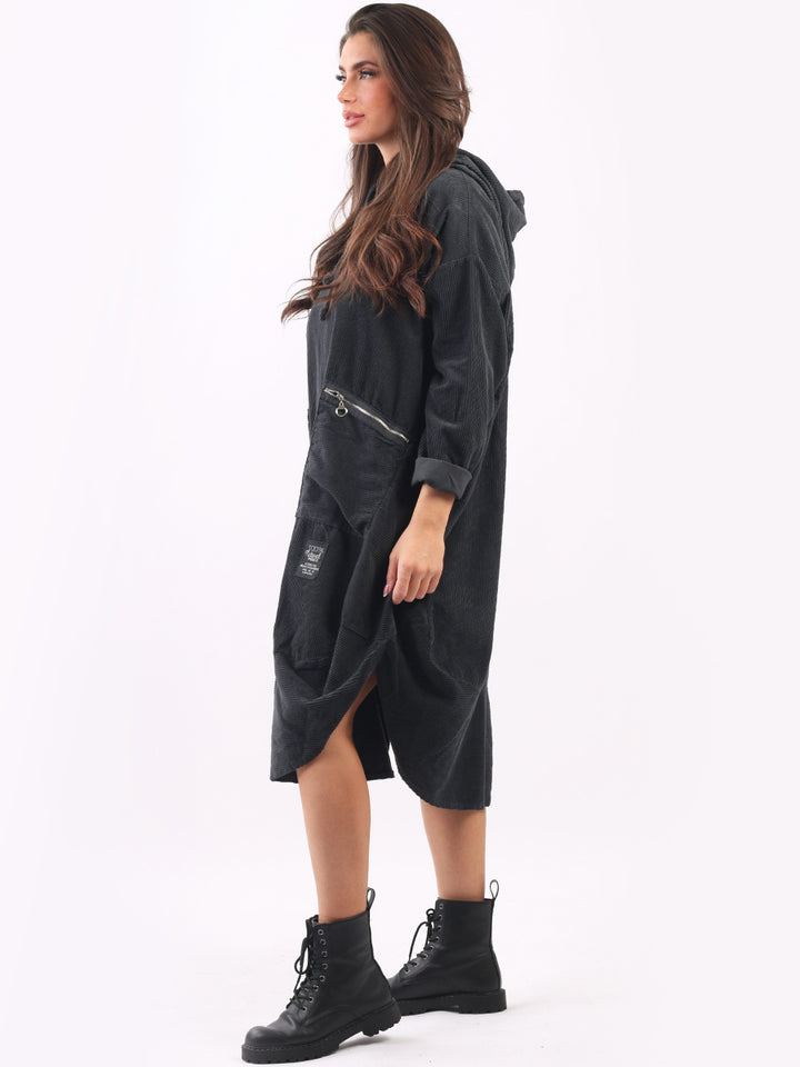 Redwholesale women clothing online store London presents this corduroy lagenlook dress to give an ideal Italian casual fashion look to women wearers. Plus Size, the hooded dress is made of pure, high-quality soft cotton and has long rolled up sleeves, a round hem and front zipper pockets. Dress it with long boots for laid back styling done right.