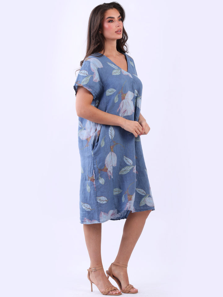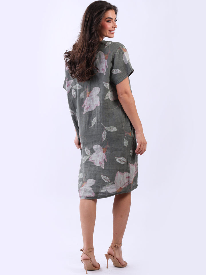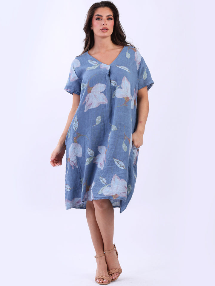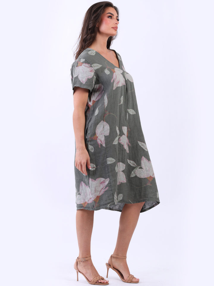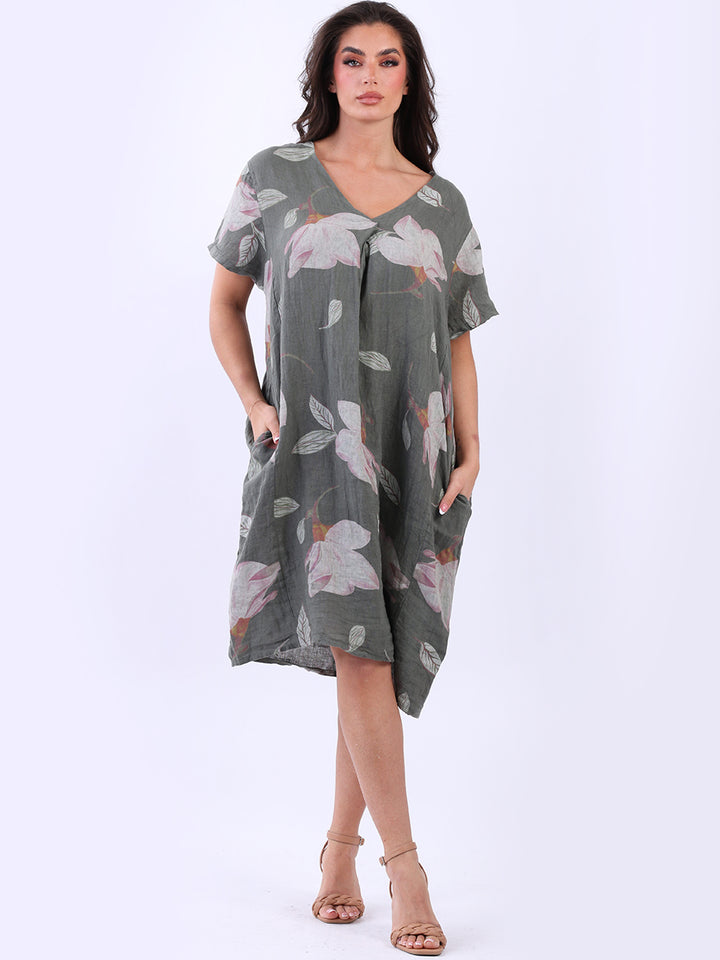 This authentic linen plus size dress is versatile, with its simple design adorned with a beautiful floral print. Its elegant V-neck exudes sophistication while short sleeves add an airy feel. A great example of classic Italian women's fashion, this dress is suitable for casual and semi-formal occasions with its subtle and refined look.