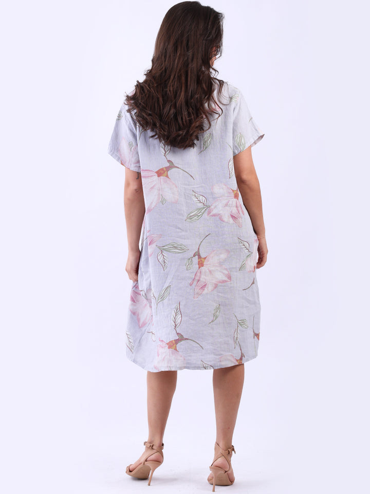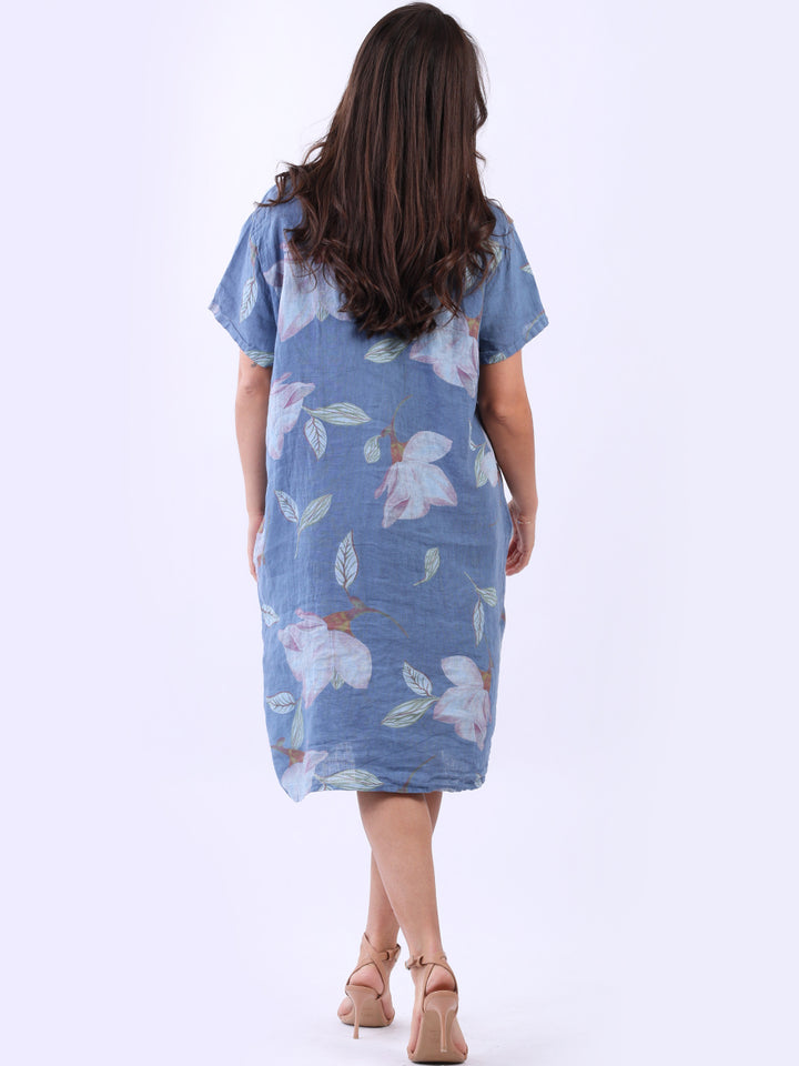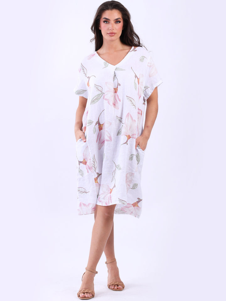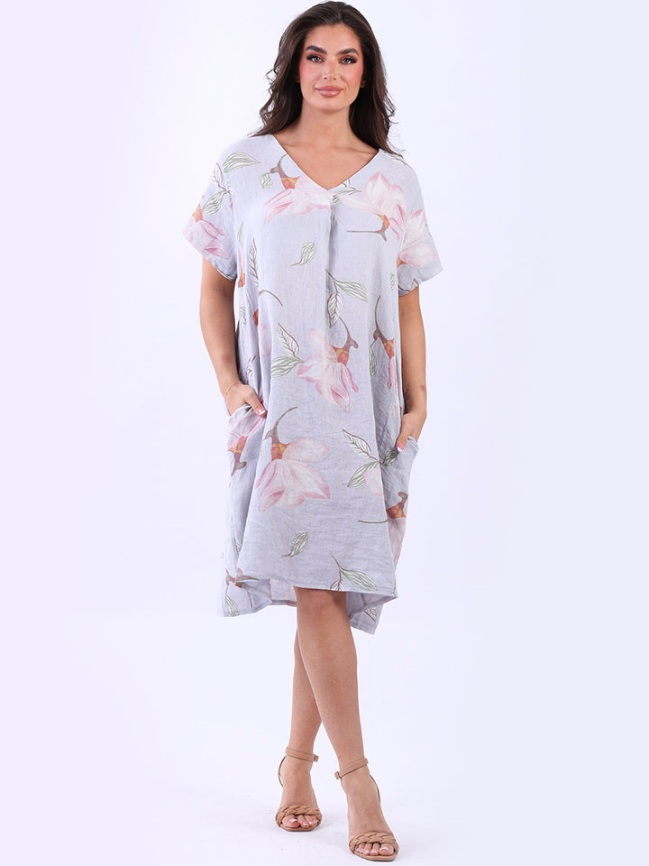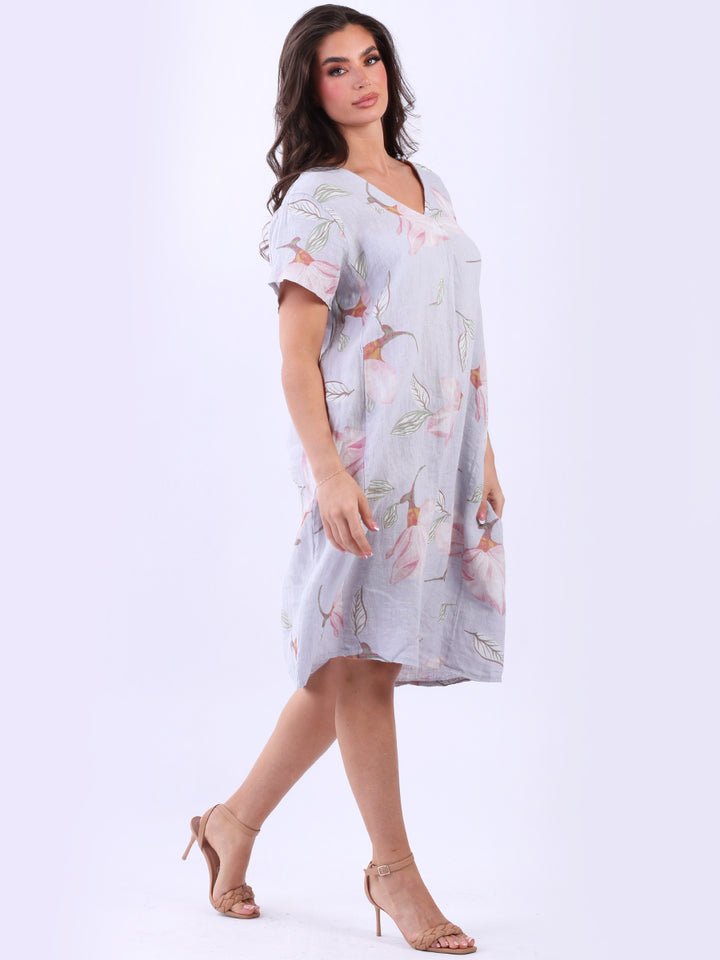 This authentic linen plus size dress is versatile, with its simple design adorned with a beautiful floral print. Its elegant V-neck exudes sophistication while short sleeves add an airy feel. A great example of classic Italian women's fashion, this dress is suitable for casual and semi-formal occasions with its subtle and refined look.