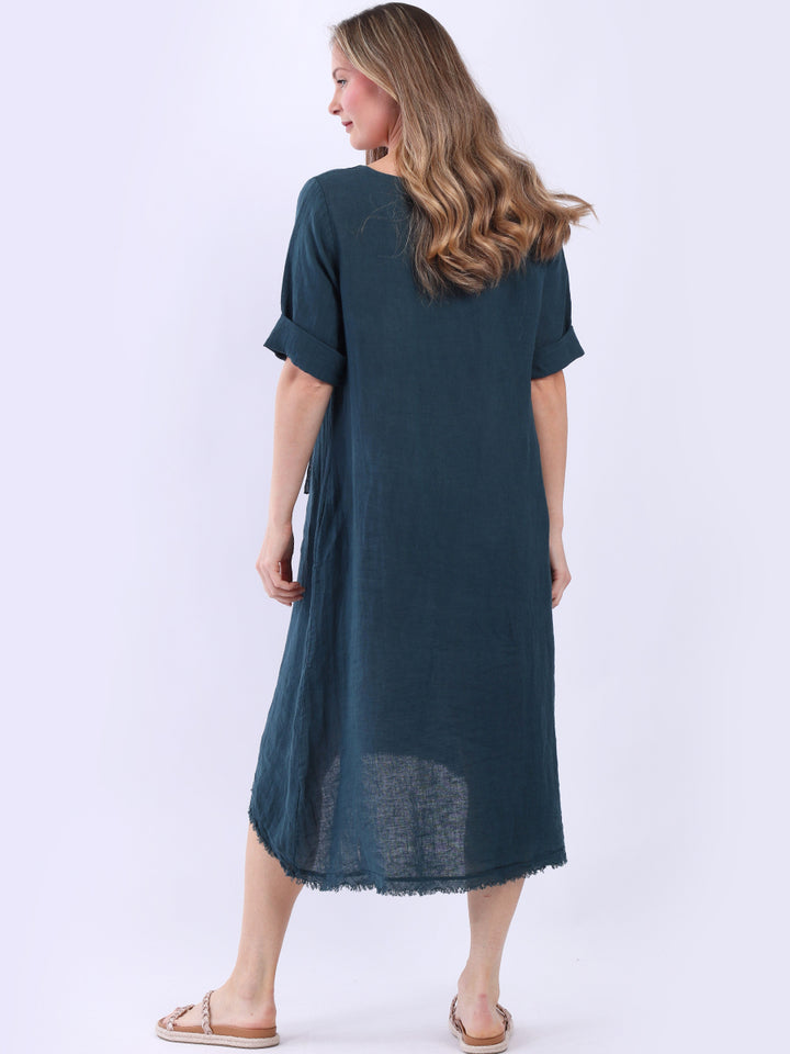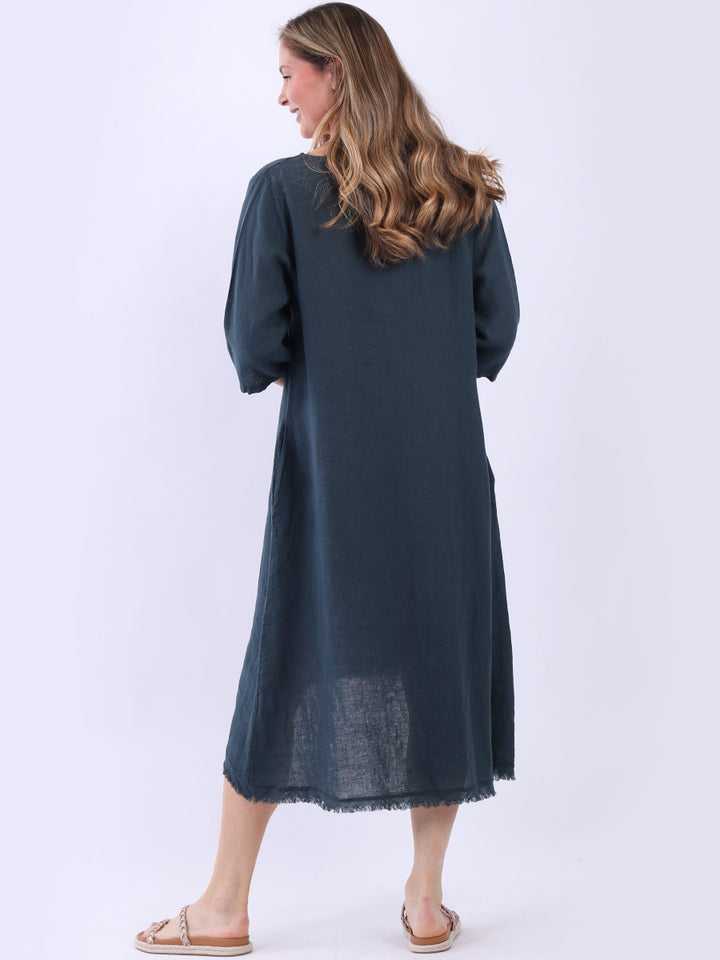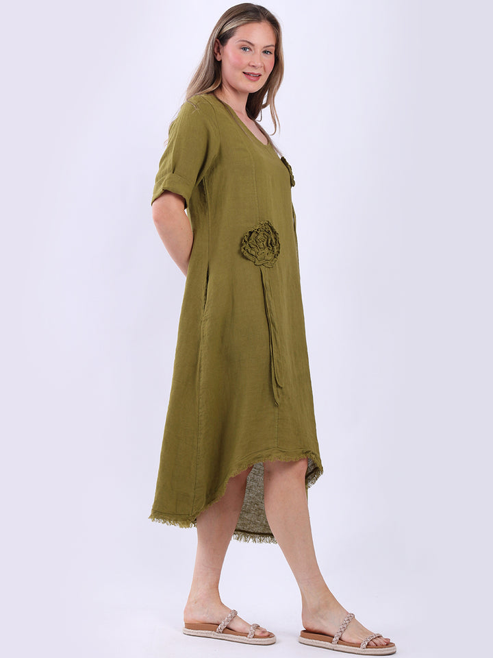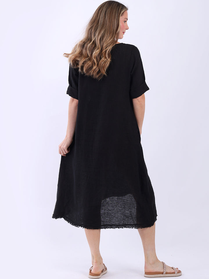 This plus size lagenlook linen dress from UK based wholesale suppliers is a delightful addition to any autumn wardrobe. Made in Italy, it features charming flower applique and a dipped raw edge hem that contrasts beautifully with its simple hue. Complete with rolled-up sleeves and side pockets, this dress offers undeniable comfort and ease, making it ideal for pairing with a light cardigan.
