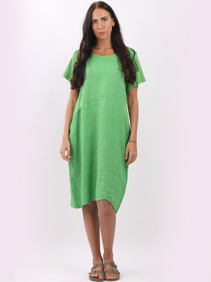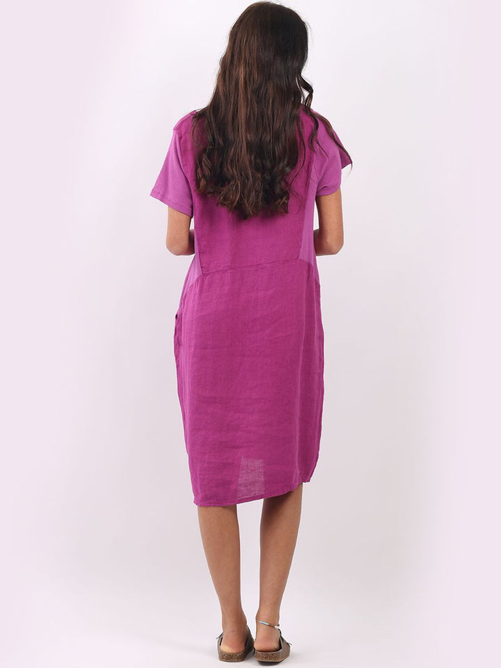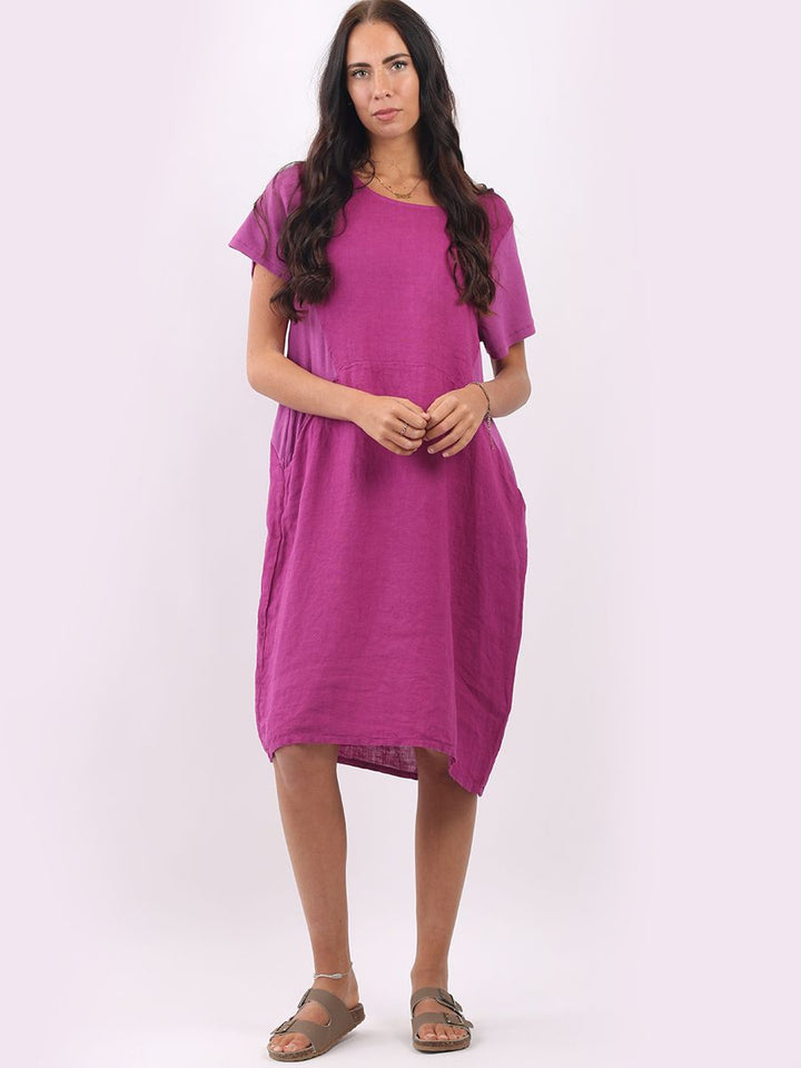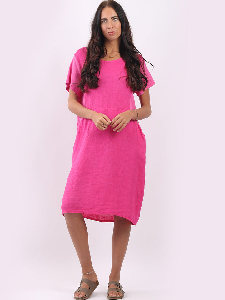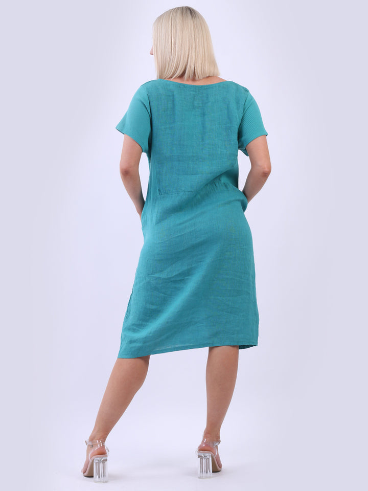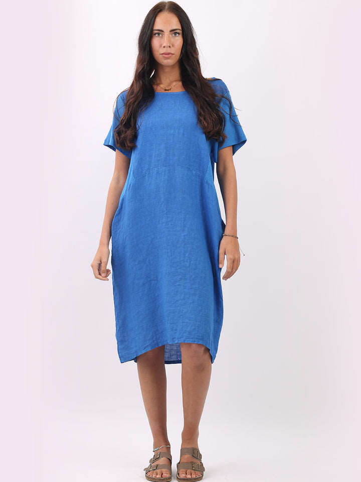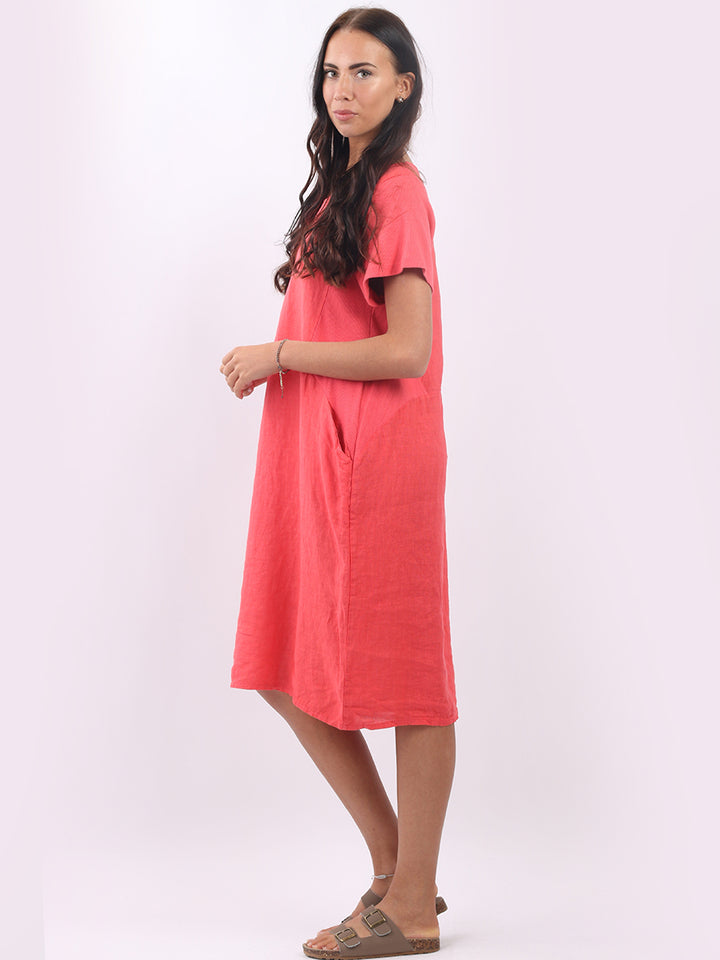 Bright and colorful with all the coziness of pure linen this is the ideal dress that women wearers adore for laid back days. Made in Italy with high quality fabric the plain dress has ribbed sides for a sleek finish, plunging round neckline and refreshing bold colors. Team it with a floral scarf for blissful finish.