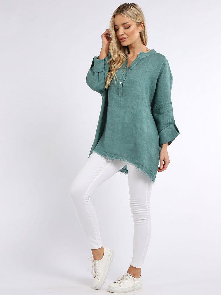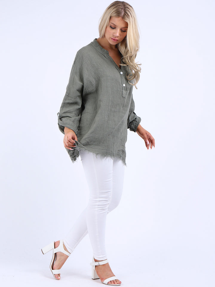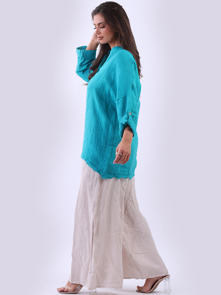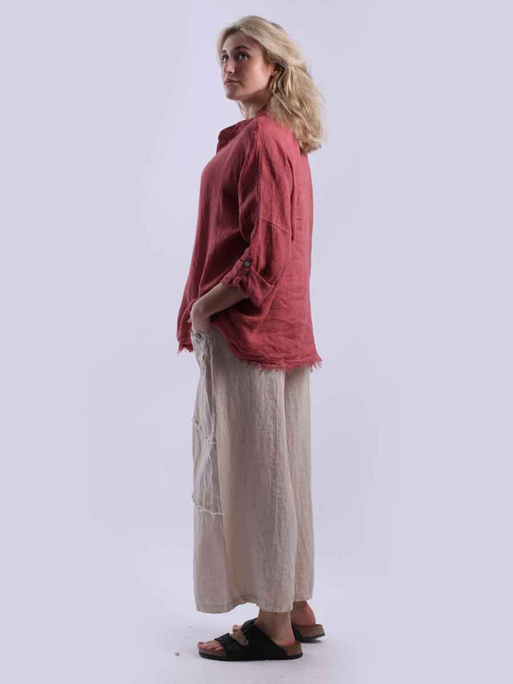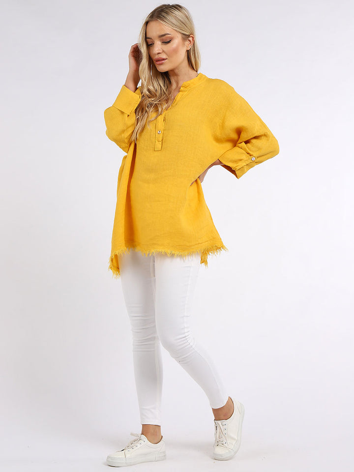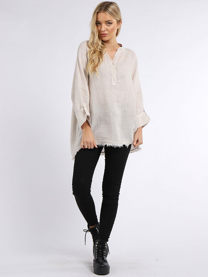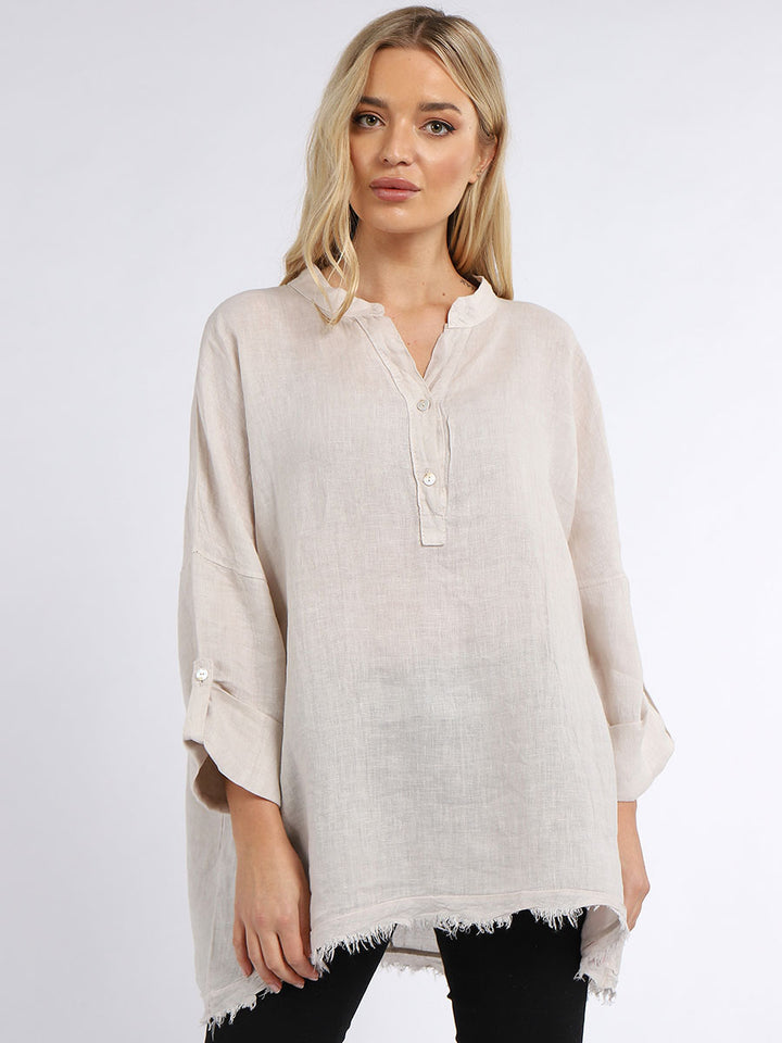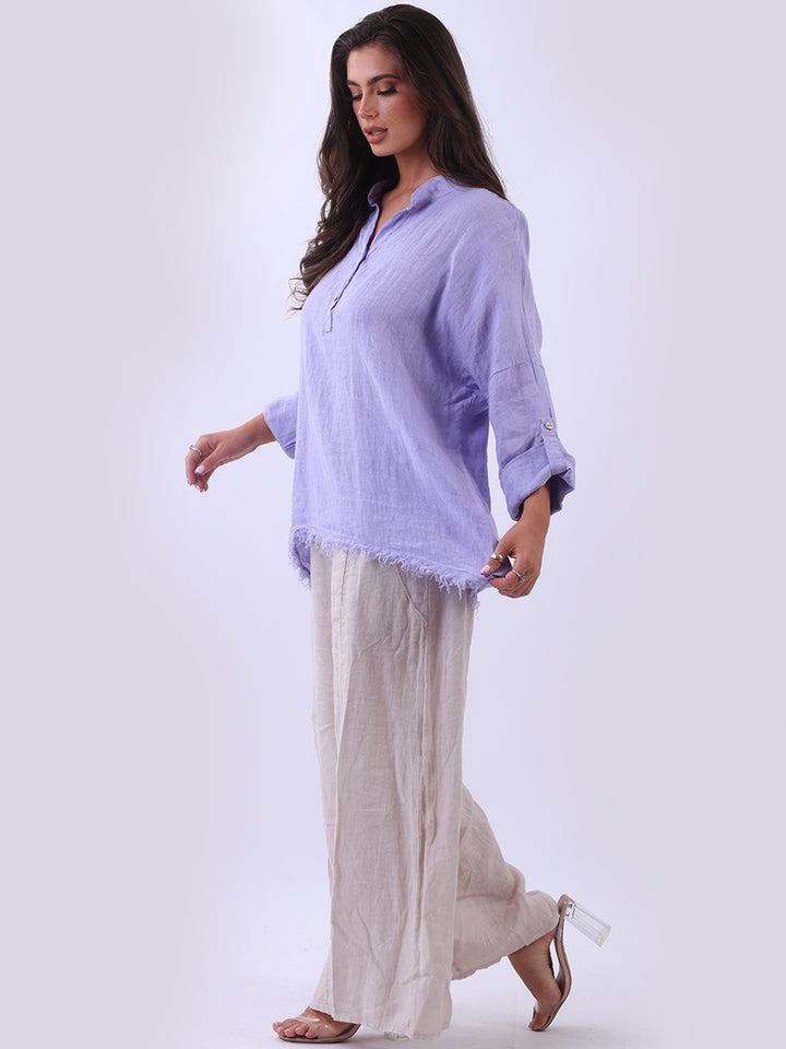Pure off the grid beauty top that is all in one a wardrobe staple and essential exclusively from Redwholesale. Made to perfection in Italy with features like raw edge hem on a baggy fitting, long button up sleeves, mandarin neck with buttons on the bottom this made in linen that is breathable and skin friendly. Dress it up with jacket and wide leg pants.