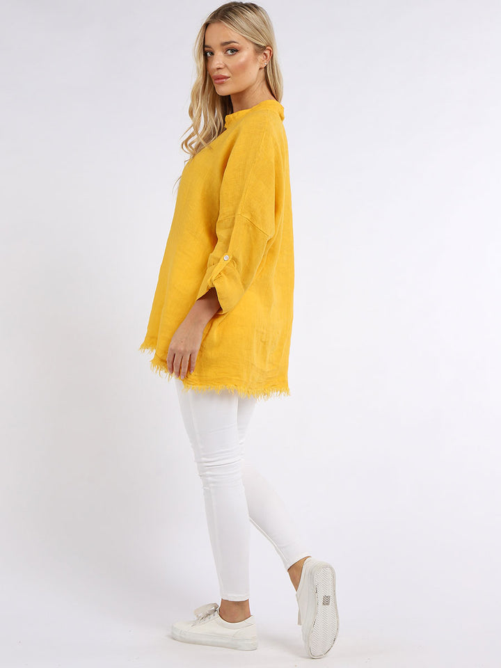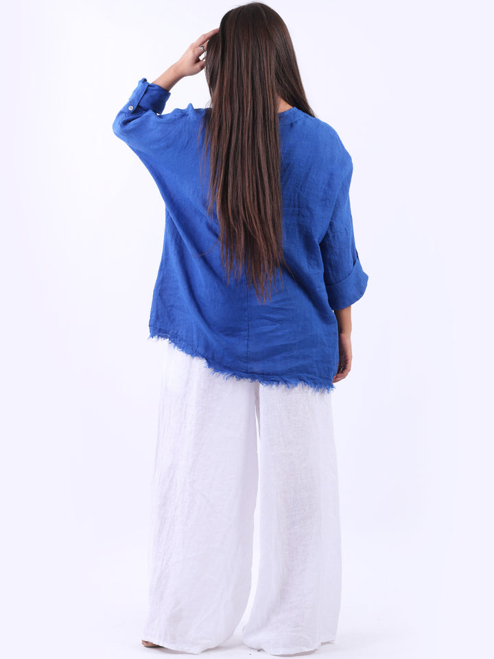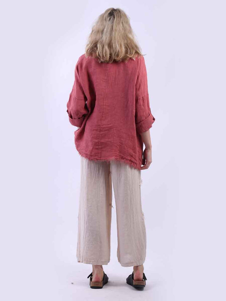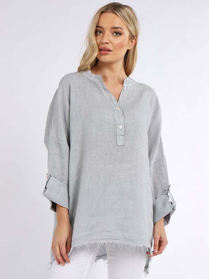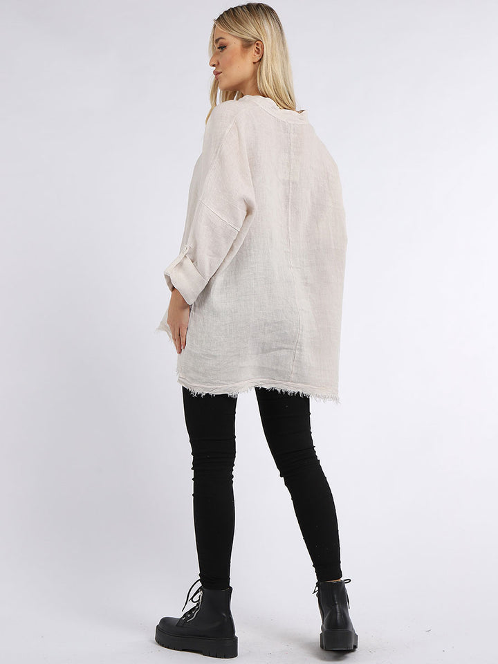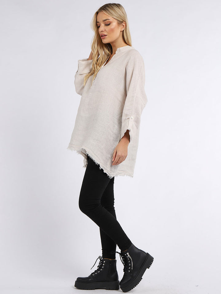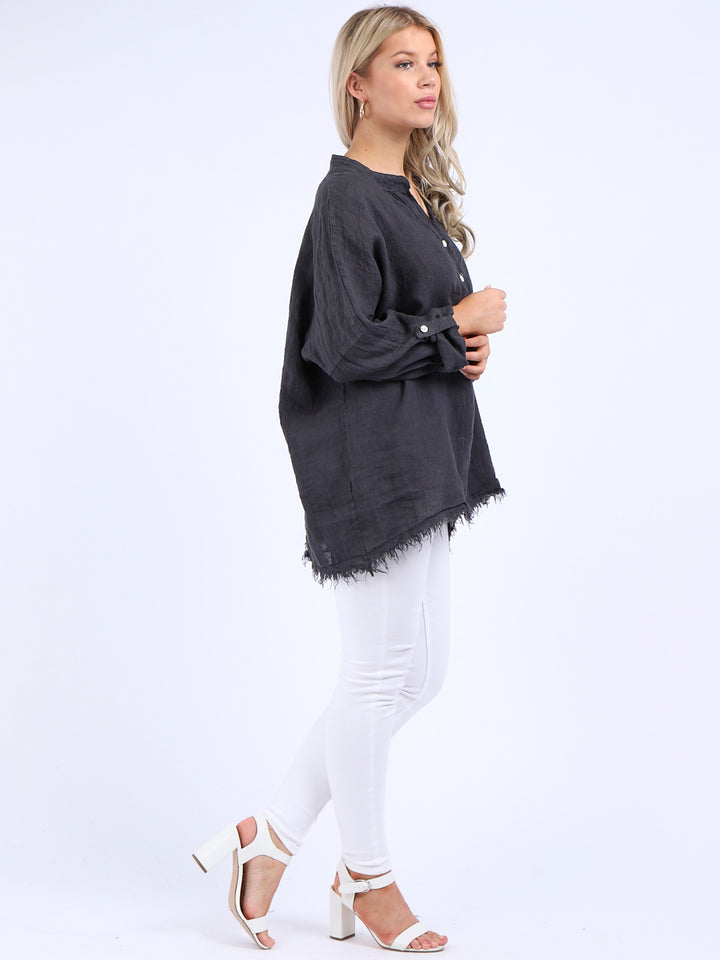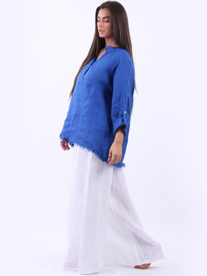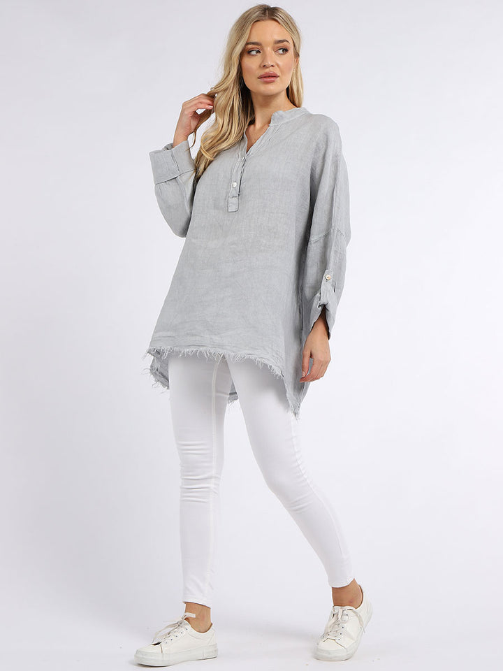 Pure off the grid beauty top that is all in one a wardrobe staple and essential exclusively from Redwholesale. Made to perfection in Italy with features like raw edge hem on a baggy fitting, long button up sleeves, mandarin neck with buttons on the bottom this made in linen that is breathable and skin friendly. Dress it up with jacket and wide leg pants.
