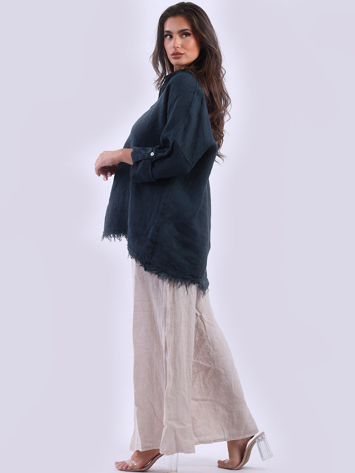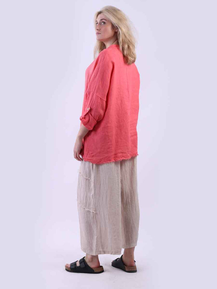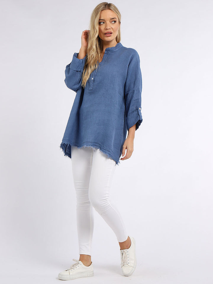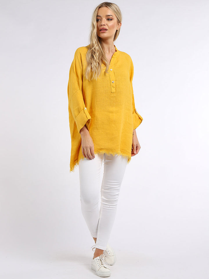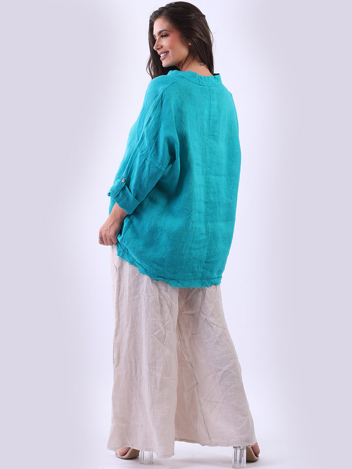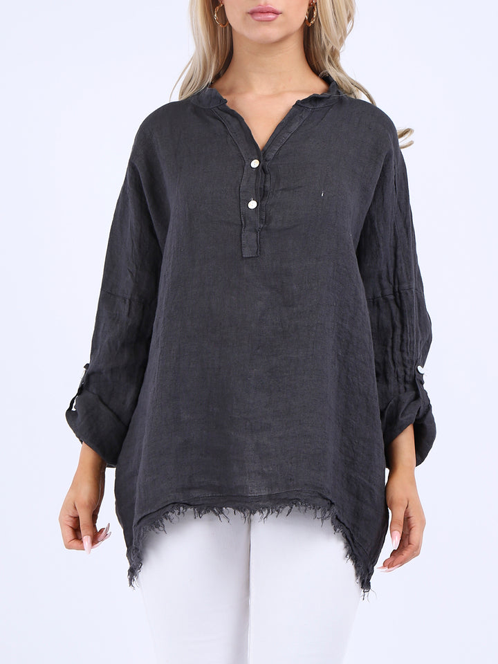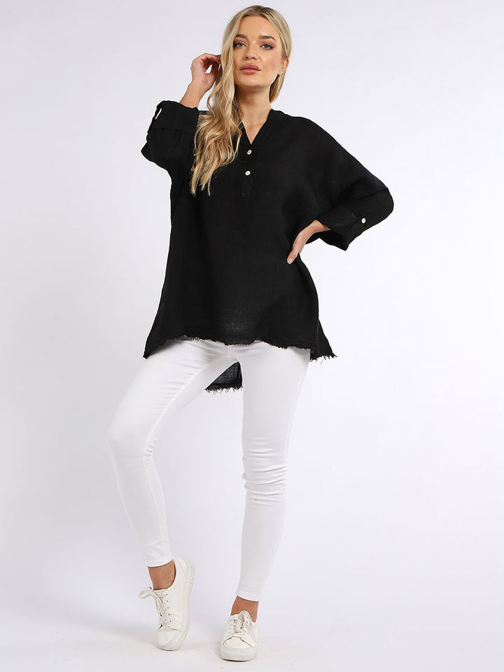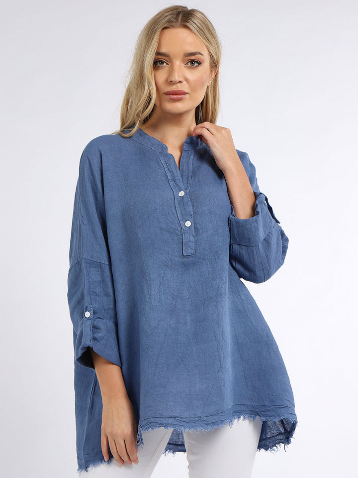 Pure off the grid beauty top that is all in one a wardrobe staple and essential exclusively from Redwholesale. Made to perfection in Italy with features like raw edge hem on a baggy fitting, long button up sleeves, mandarin neck with buttons on the bottom this made in linen that is breathable and skin friendly. Dress it up with jacket and wide leg pants.