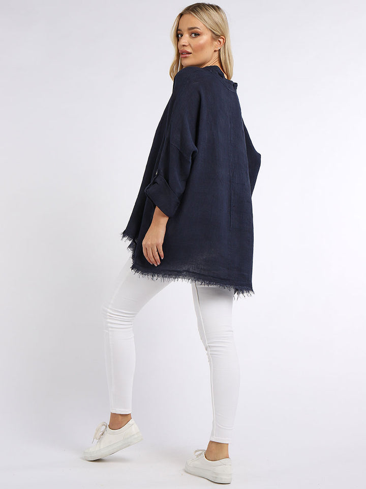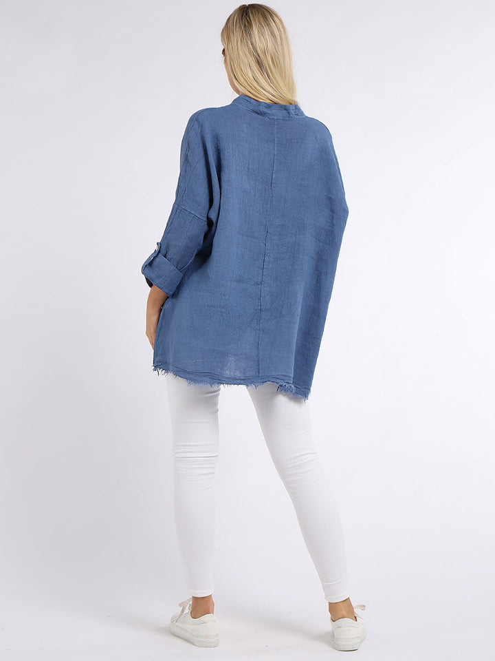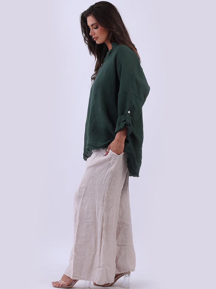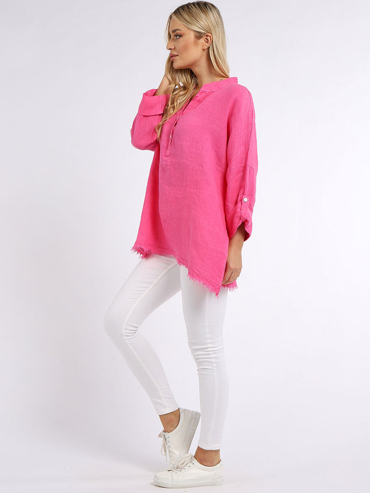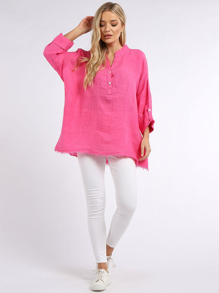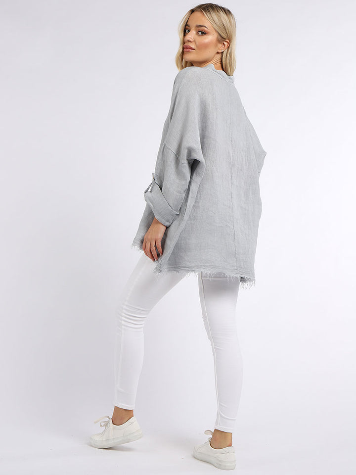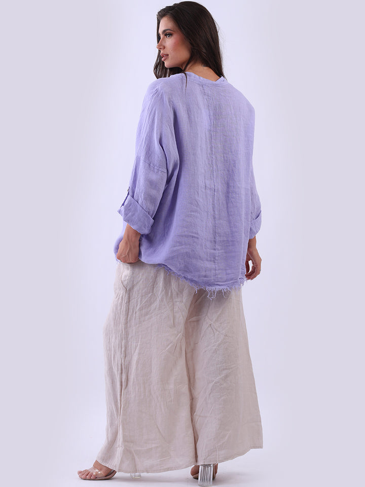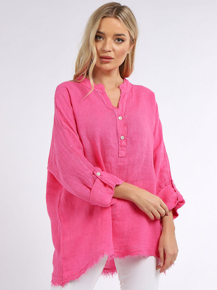 Pure off the grid beauty top that is all in one a wardrobe staple and essential exclusively from Redwholesale. Made to perfection in Italy with features like raw edge hem on a baggy fitting, long button up sleeves, mandarin neck with buttons on the bottom this made in linen that is breathable and skin friendly. Dress it up with jacket and wide leg pants.