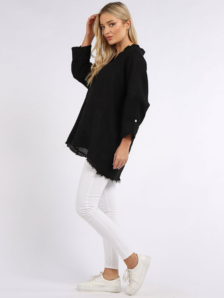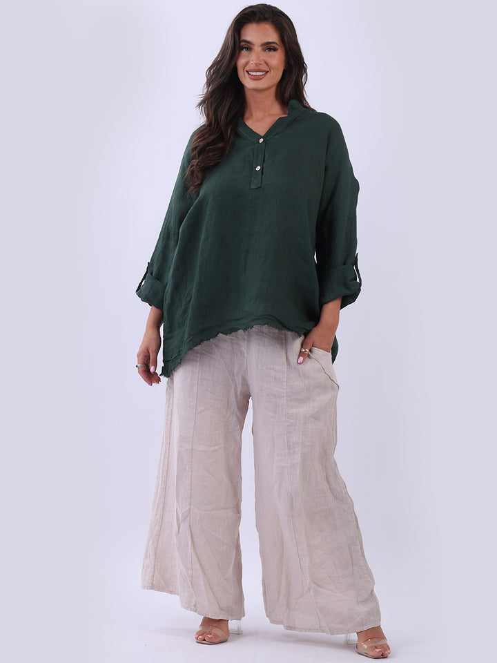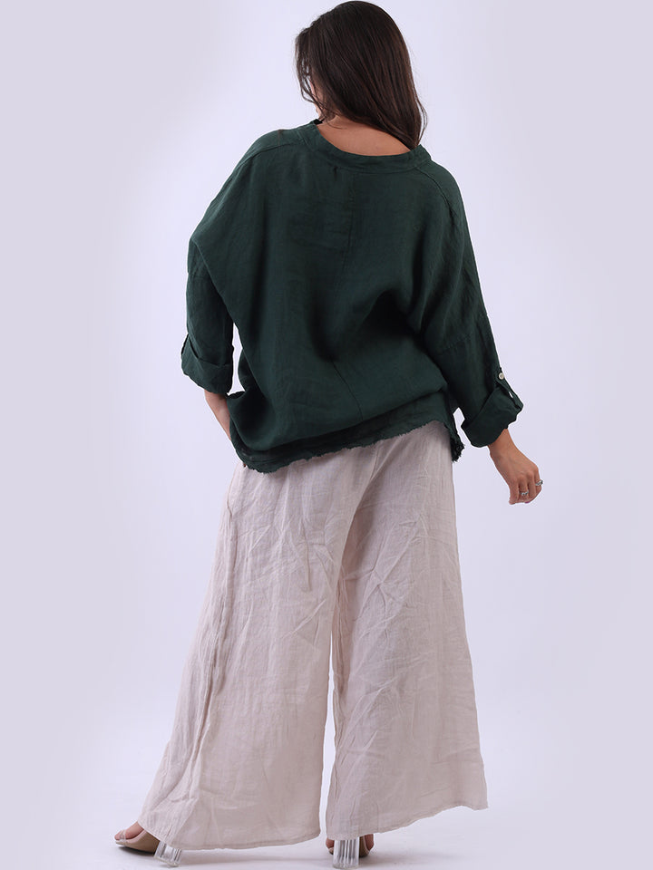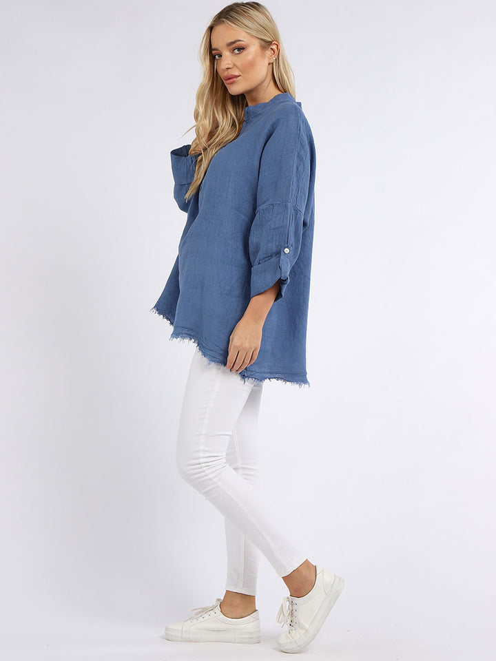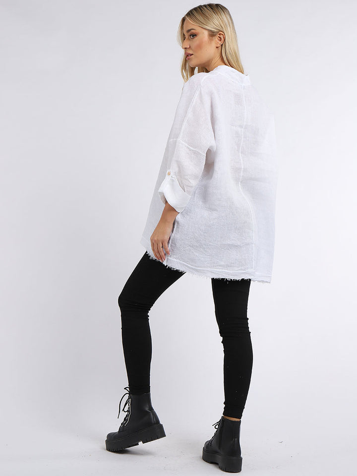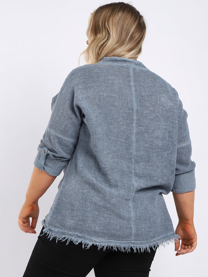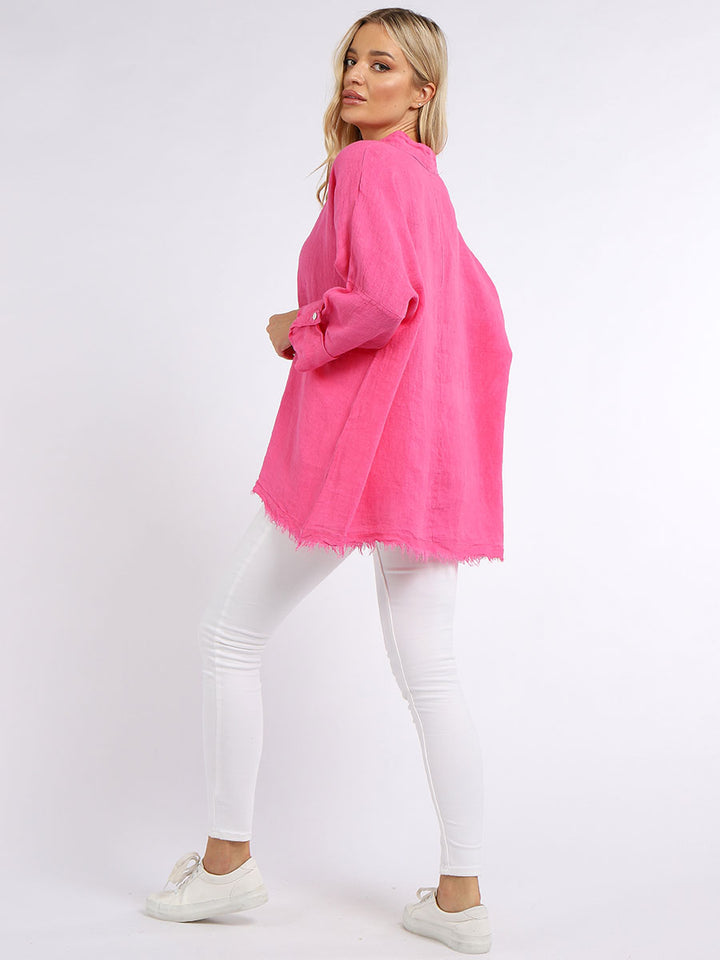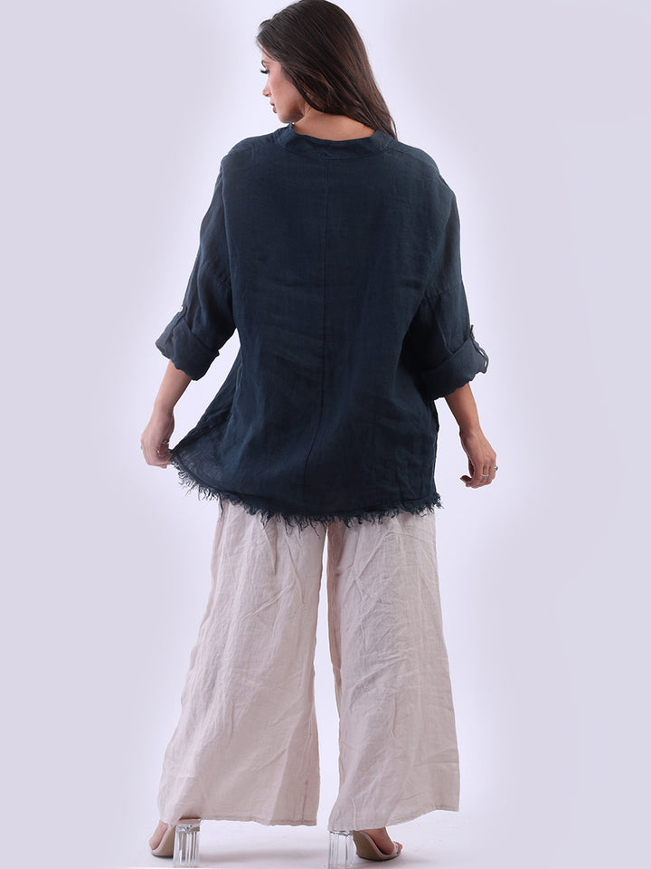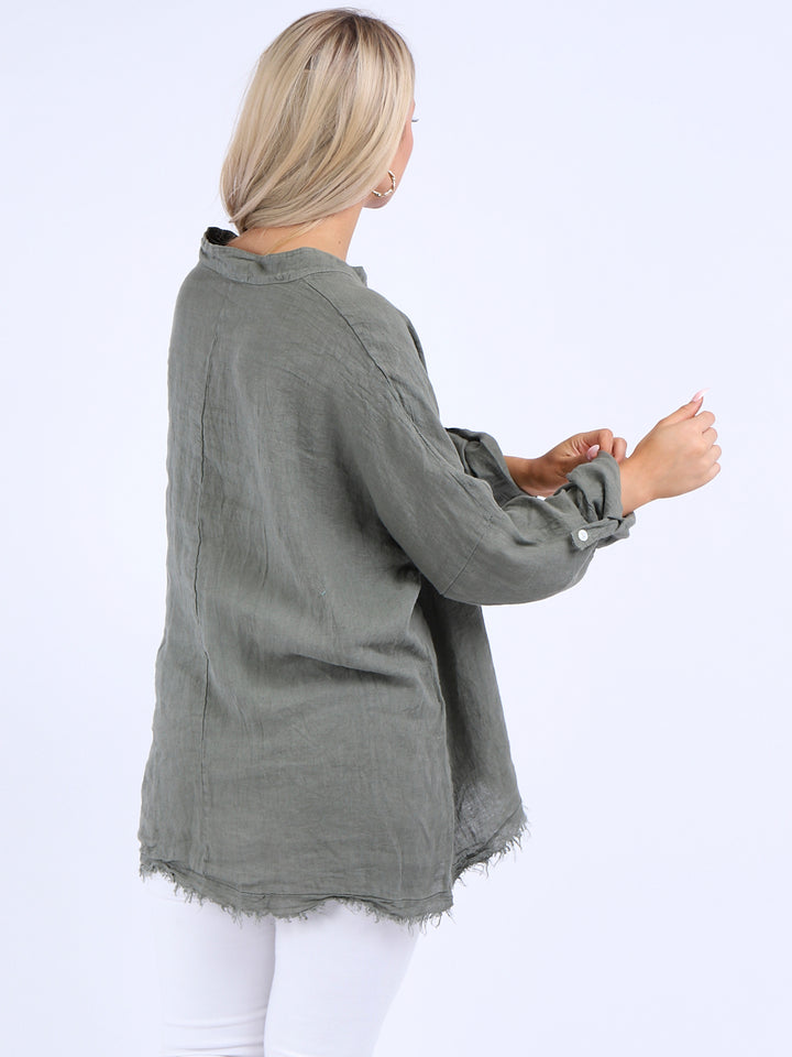 Pure off the grid beauty top that is all in one a wardrobe staple and essential exclusively from Redwholesale. Made to perfection in Italy with features like raw edge hem on a baggy fitting, long button up sleeves, mandarin neck with buttons on the bottom this made in linen that is breathable and skin friendly. Dress it up with jacket and wide leg pants.
