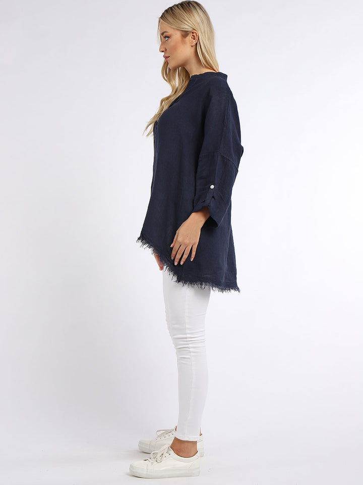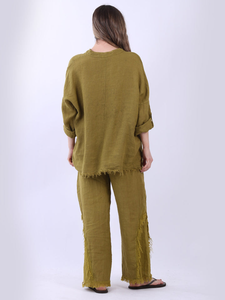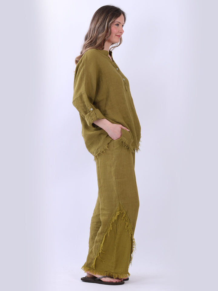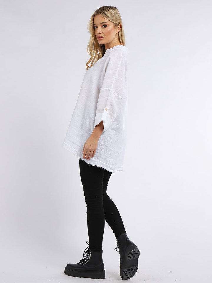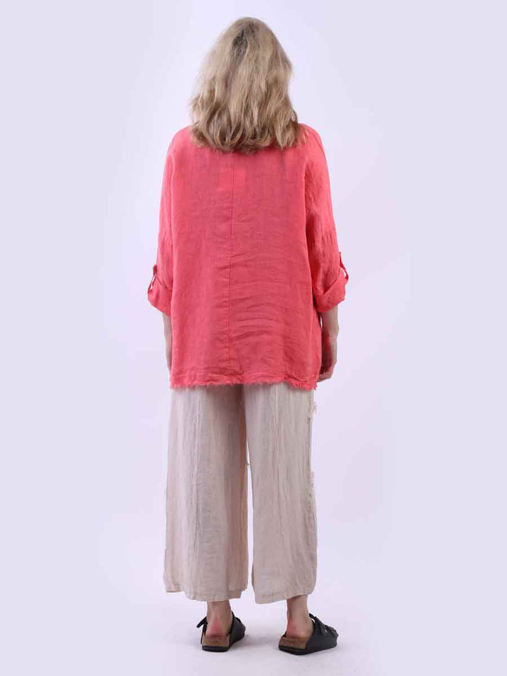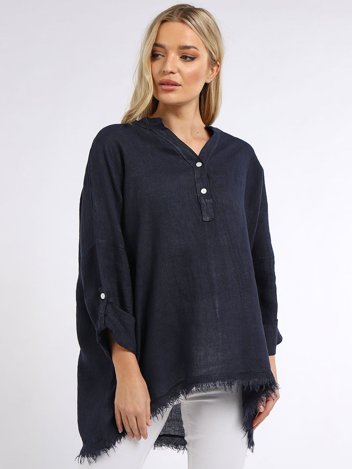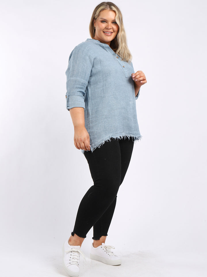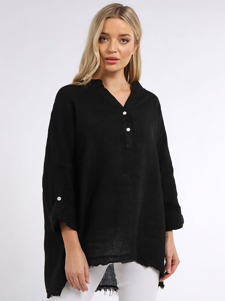 Pure off the grid beauty top that is all in one a wardrobe staple and essential exclusively from Redwholesale. Made to perfection in Italy with features like raw edge hem on a baggy fitting, long button up sleeves, mandarin neck with buttons on the bottom this made in linen that is breathable and skin friendly. Dress it up with jacket and wide leg pants.