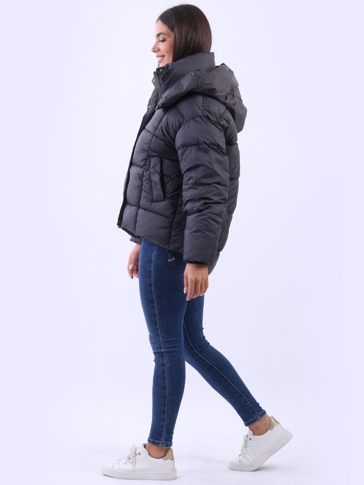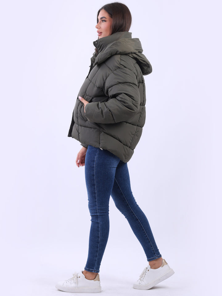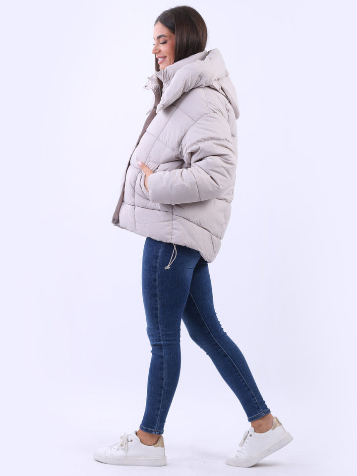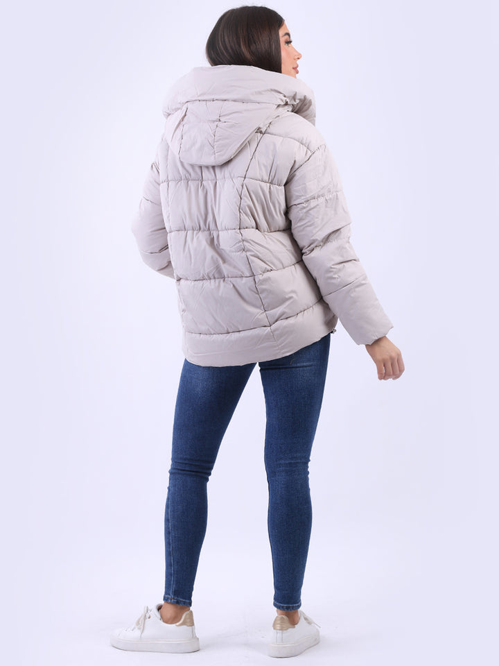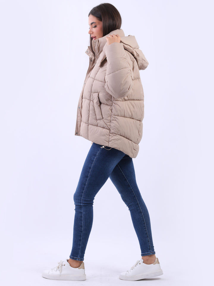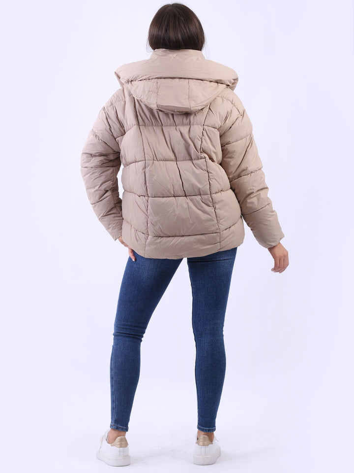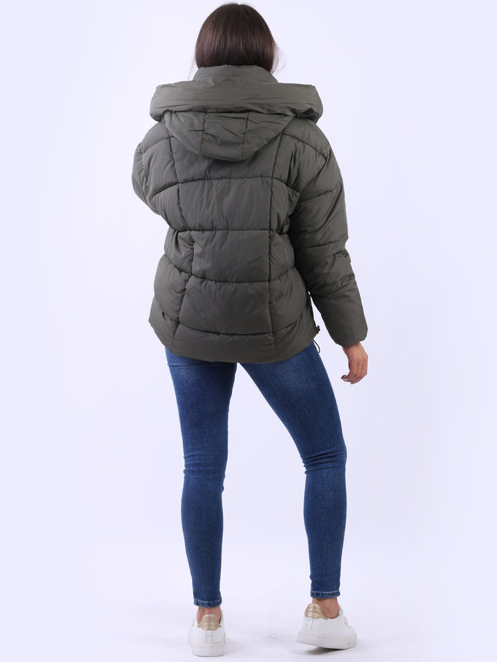 Women's winter jacket that is trendy and the style what ladies wear in Italy. Make a statement with this gold, lush and padded fluffy soft jacket with hood. Slightly longer back, front zipper and button detailing makes it uniquely boutique style that is ideal for ladies to wear in winter and enjoy warmth.