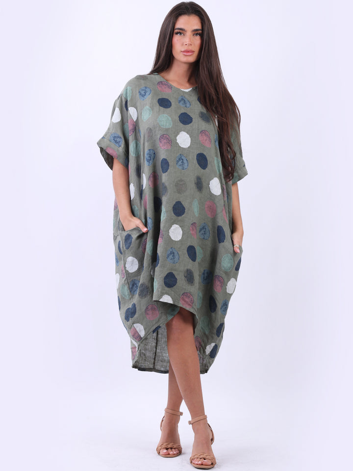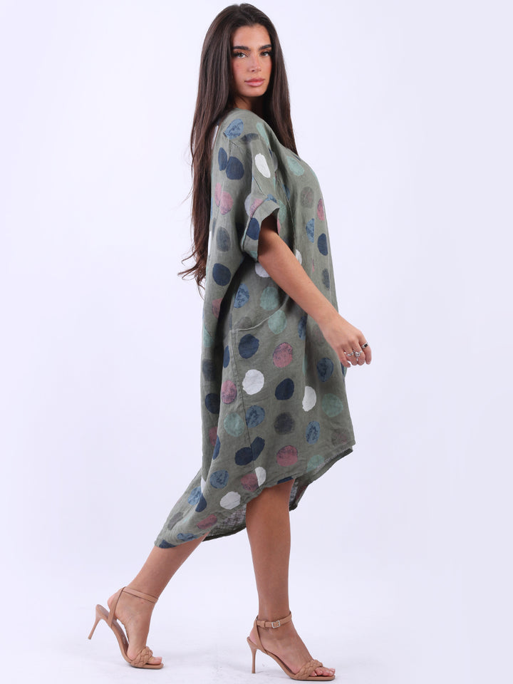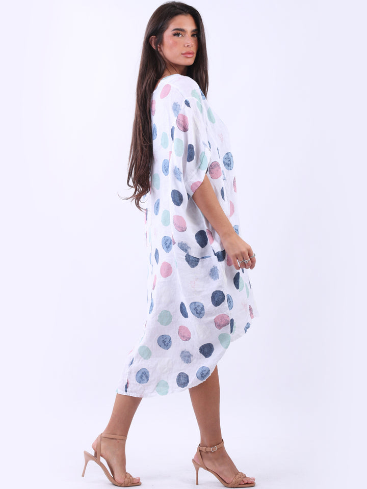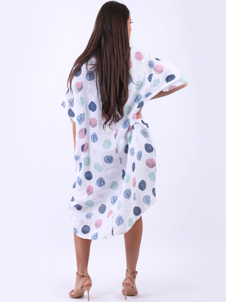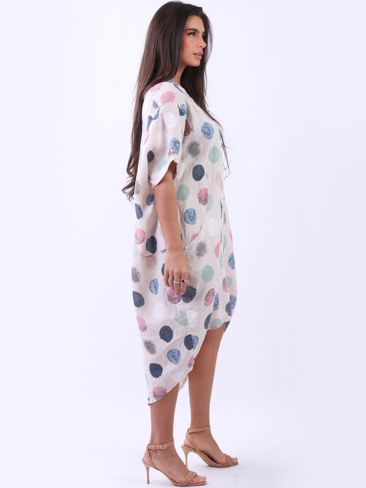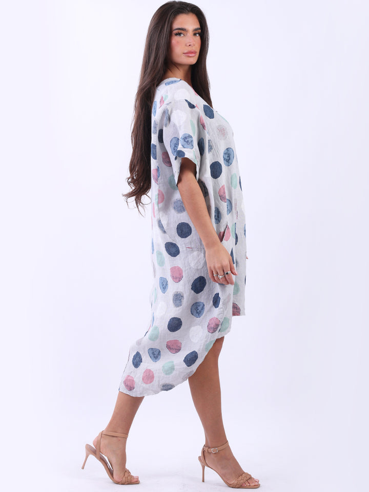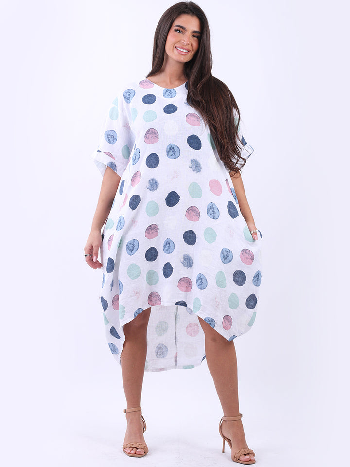 Artistic and authentic this is the look that women wearers dream to have for casual Italian women clothing. Dreamy and timeless multi polka dot print, that gives a painted style finish to the overall design, made in Italy with unique and durable linen fabric that is remarkable for every season and style. Functional pockets and high low hem makes it a unique Italian moda silhouette. Dress it with capris and high heels to finish the look in style.
