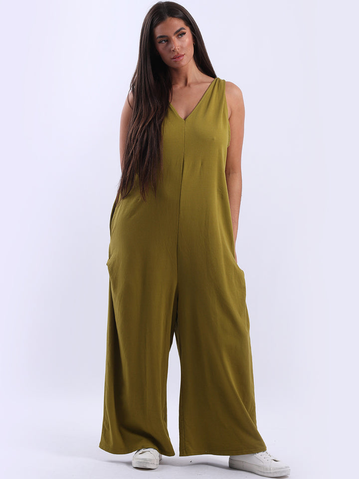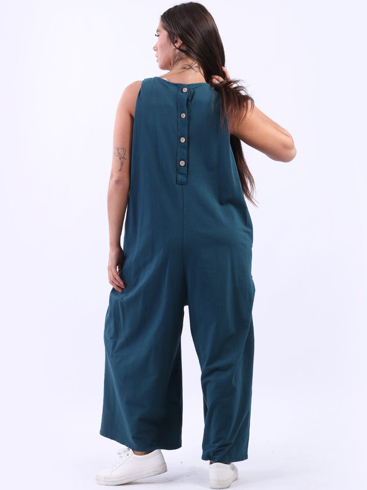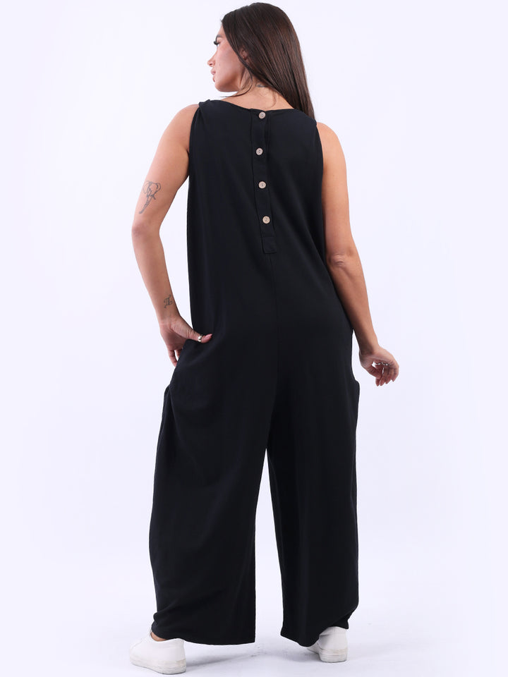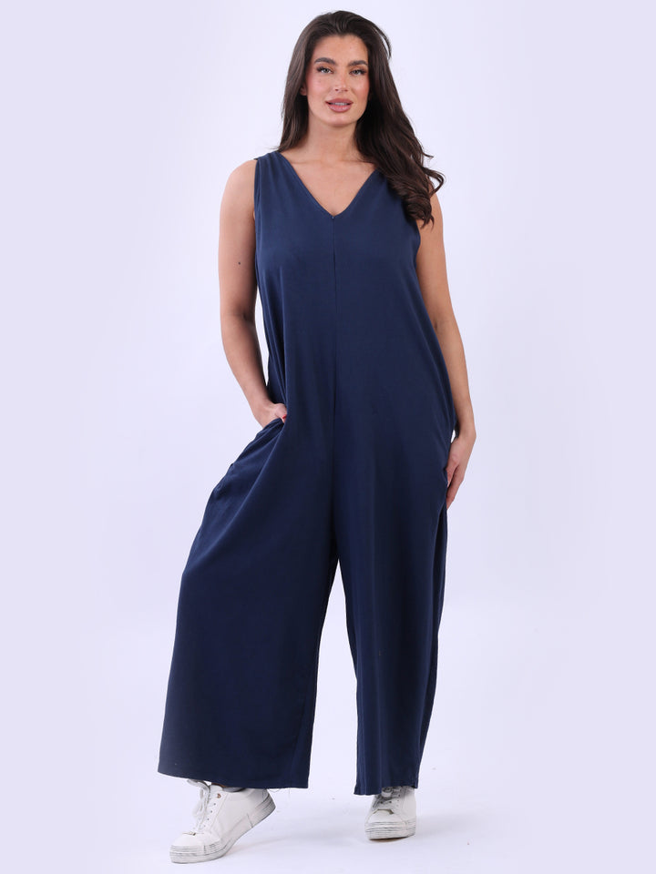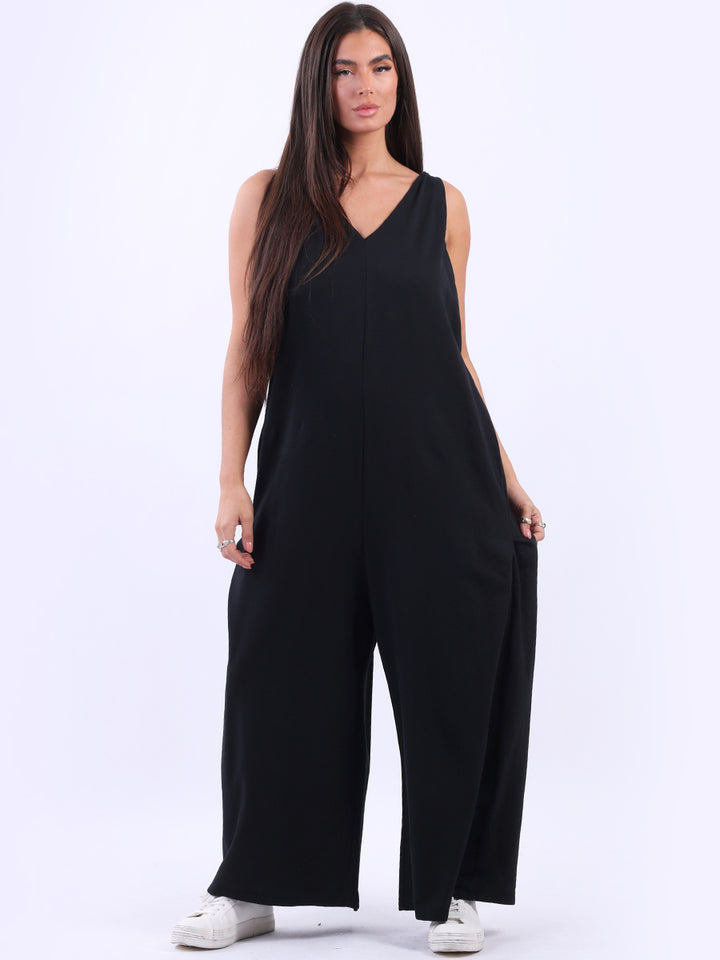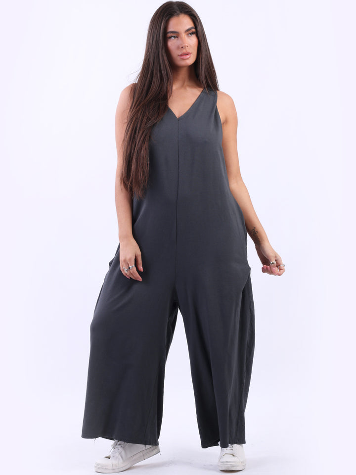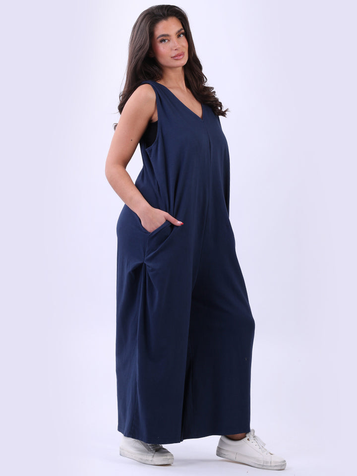 Casual Italian fashion at its best with Italian women look made easy. Jumpsuits are ideal for all seasons with its very comfy look and feel. Plunging V-neckline, baggy plus size fit with chic button detailing at the back. Mix and match with fine knit cardigans from Redwholesale London.