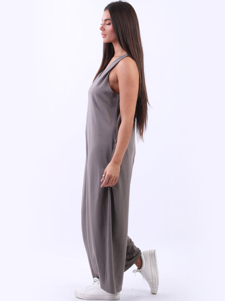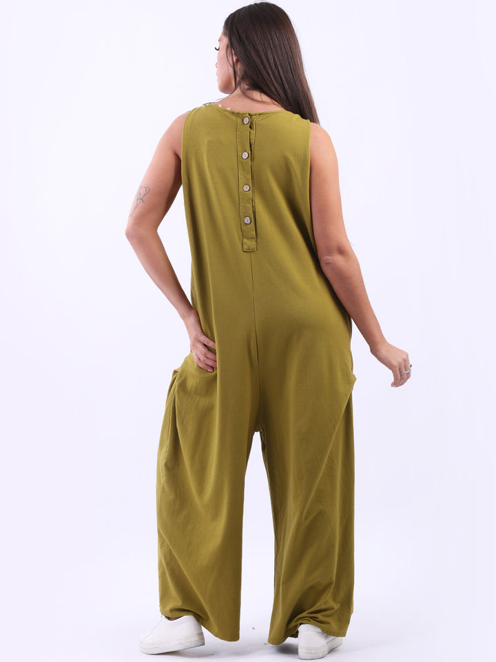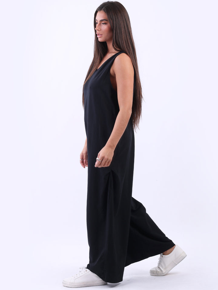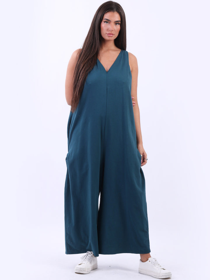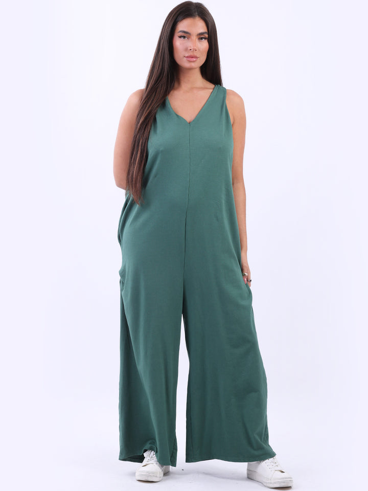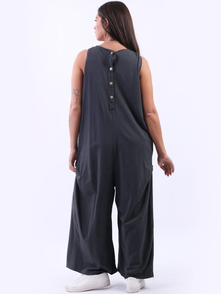 Casual Italian fashion at its best with Italian women look made easy. Jumpsuits are ideal for all seasons with its very comfy look and feel. Plunging V-neckline, baggy plus size fit with chic button detailing at the back. Mix and match with fine knit cardigans from Redwholesale London.