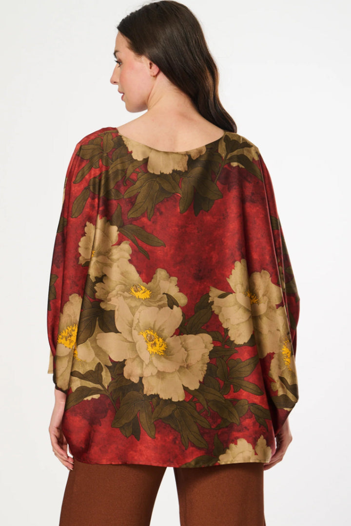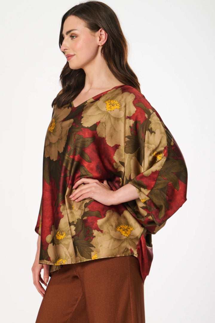 Satin style cape top featuring a vibrant delicate floral print, flattering batwing sleeves, and a sophisticated v-neckline,