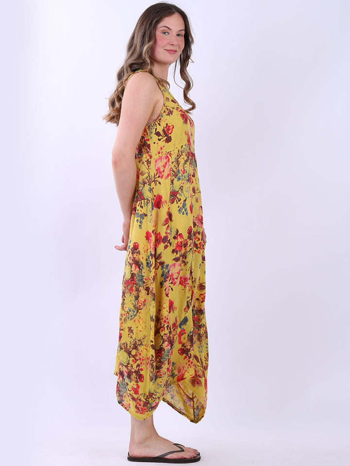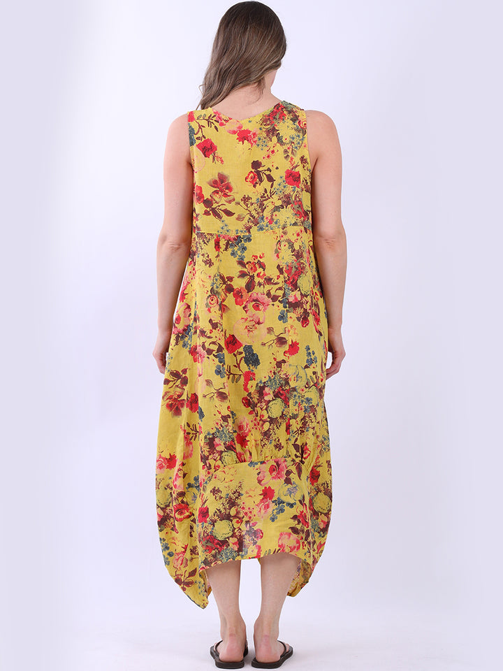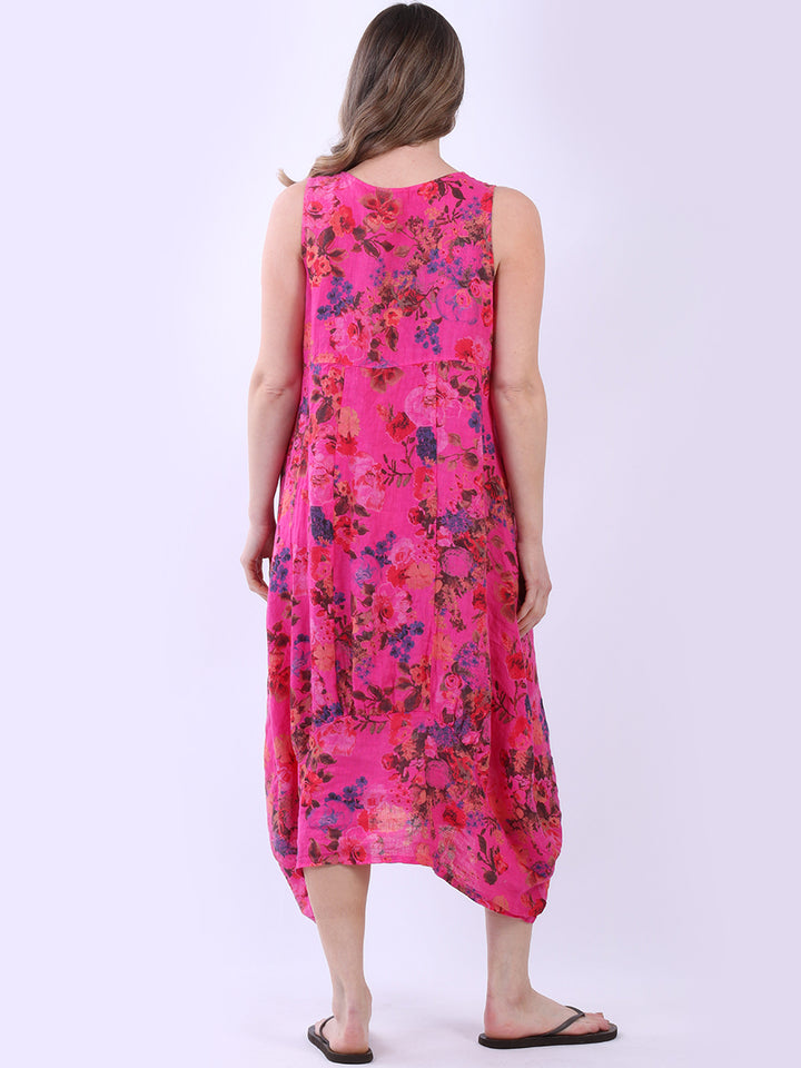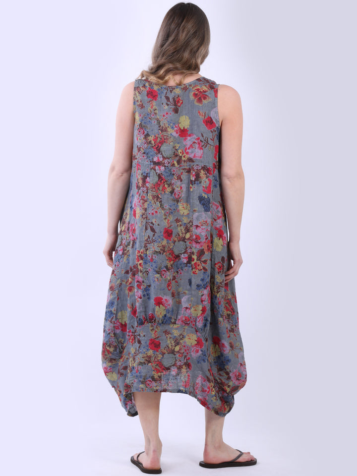 This beautiful, flowing, sleeveless dress, crafted in Italy, adds a delightful hint of nature's charm to women’s everyday style. The delicate floral print brings a gentle, romantic touch, and the airy linen ensures it feels light and comfy against the skin. This dress is made for women who cherish the simplicity of getting ready. It effortlessly complements sandals on sunny days and can be cosily layered with a cardigan when the chill sets in.