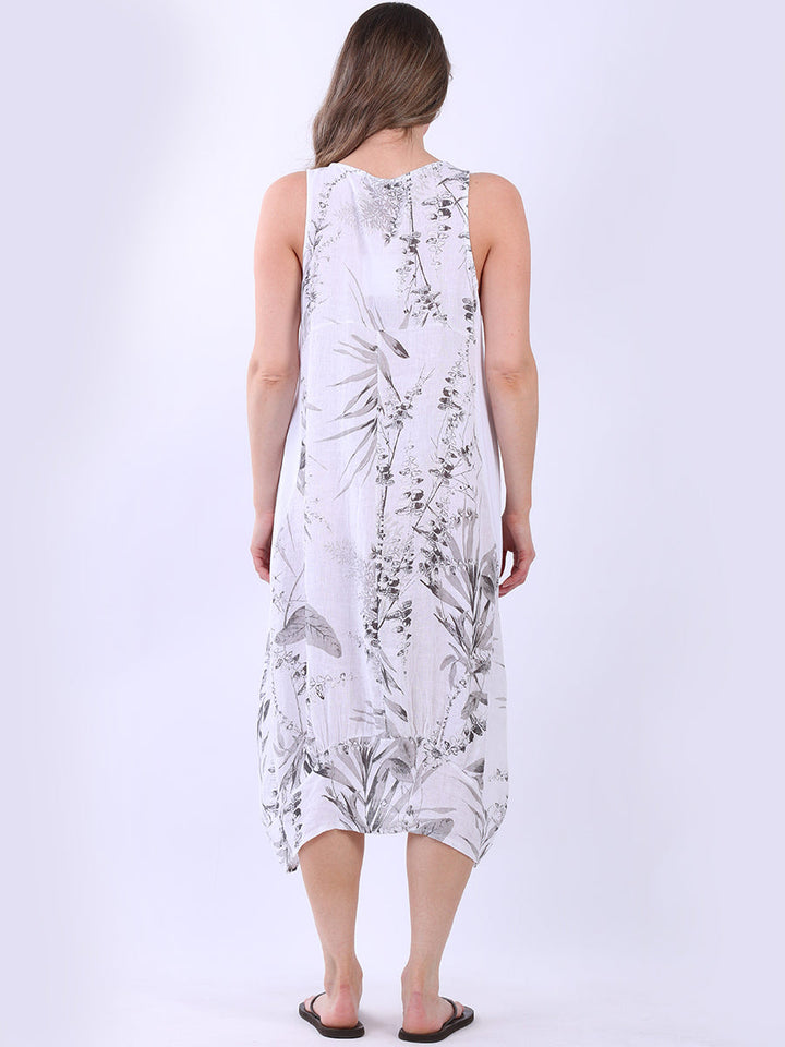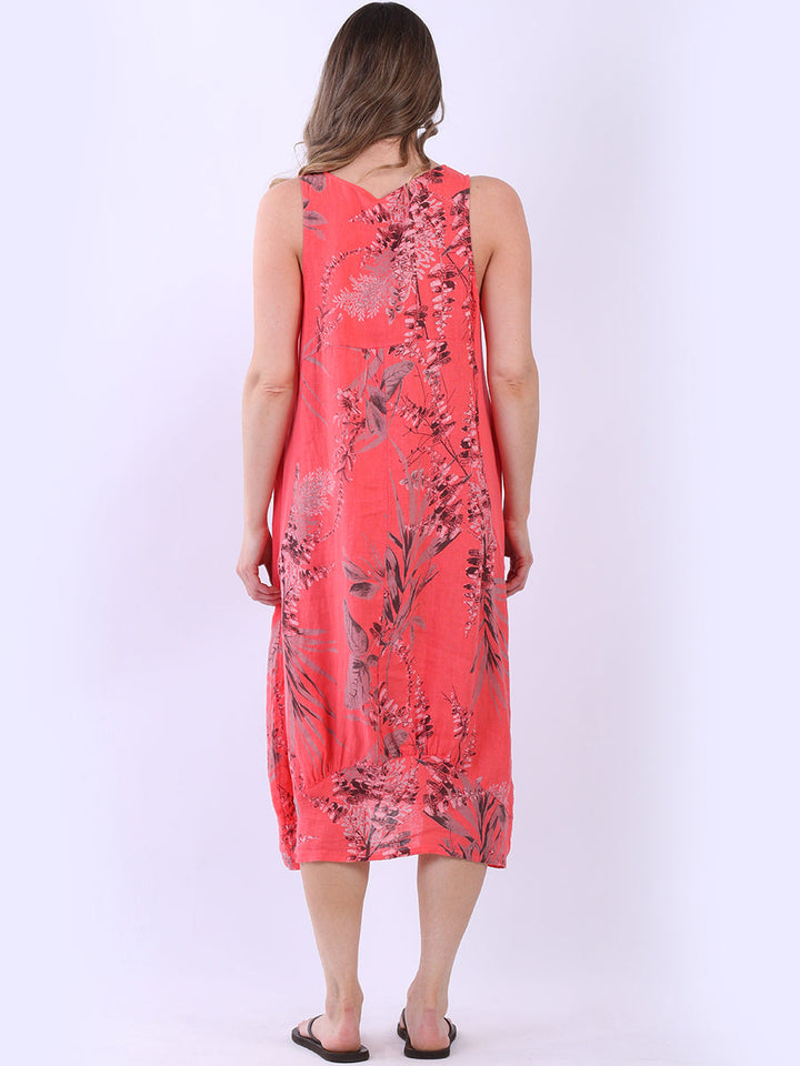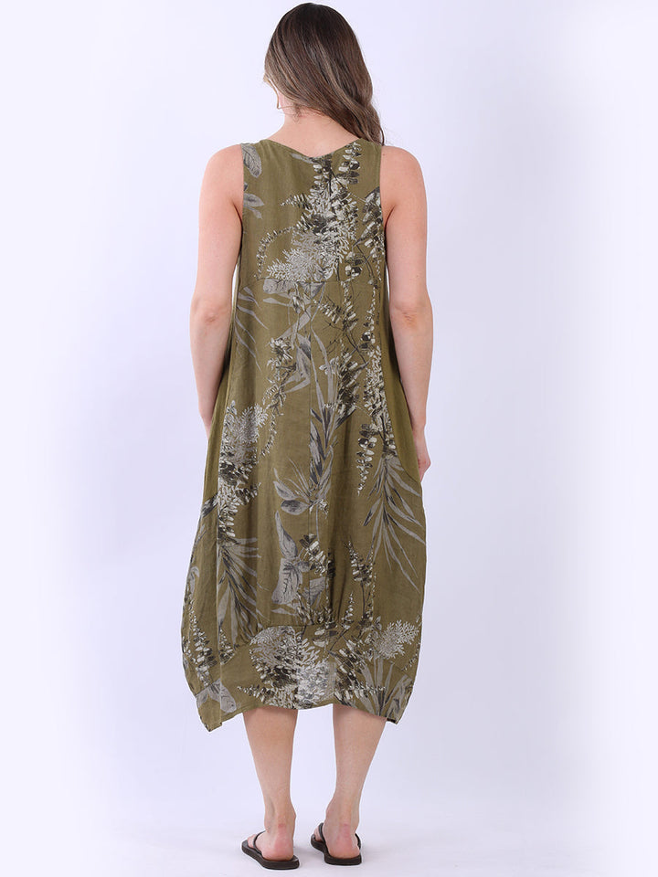 This sleeveless linen dress in lagenlook design features delicate leaf prints and a casual fit. Made in Italy, it fits lazy days and leisurely summer evenings. For ladies seeking for fashionable yet airy wardrobe basics, it is the ideal option.
