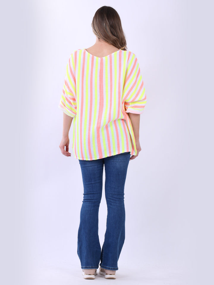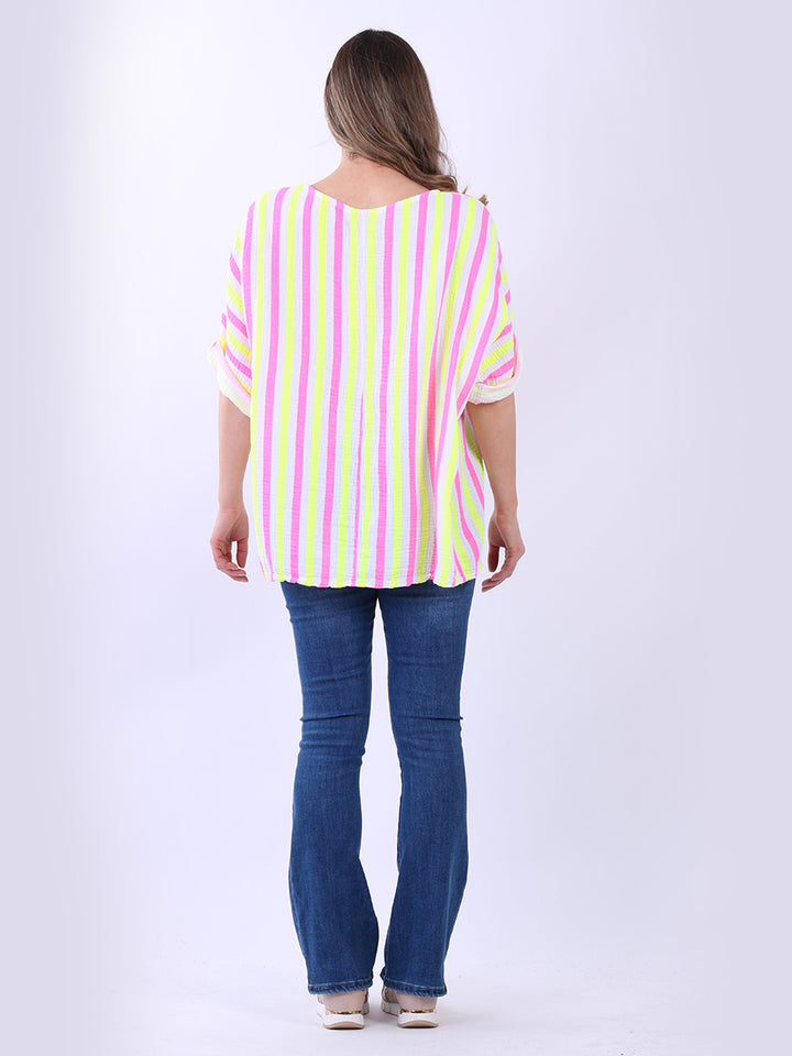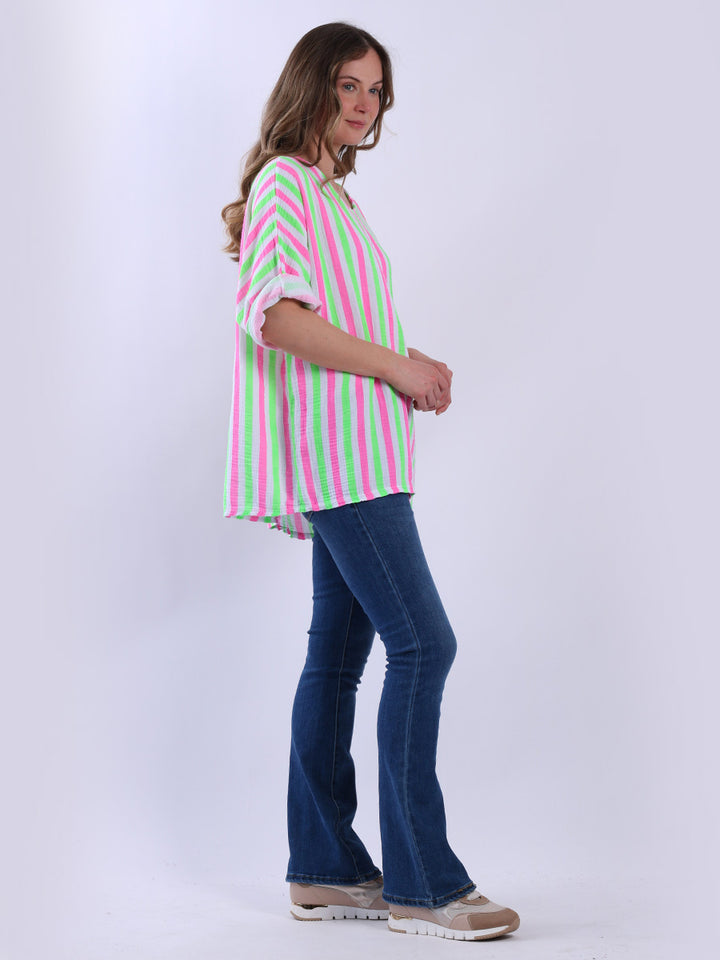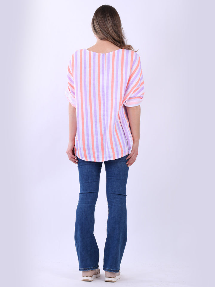 Bold stripes and soft cotton come together in this casual, loose-fit Italian top. Designed with a comfortable fit, it gives any summer wardrobe a playful twist. Designed for women who enjoy simple, oversized lagenlook style. This item is an excellent selection from Redwholesale's casual summer collection.