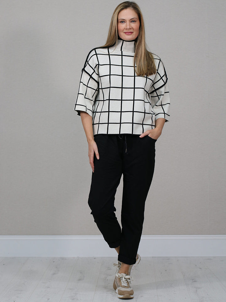 A premium textured knit top featuring a bold white grid pattern. Finished with contrast edge details and a relaxed silhouette for a modern, boutique-quality look.