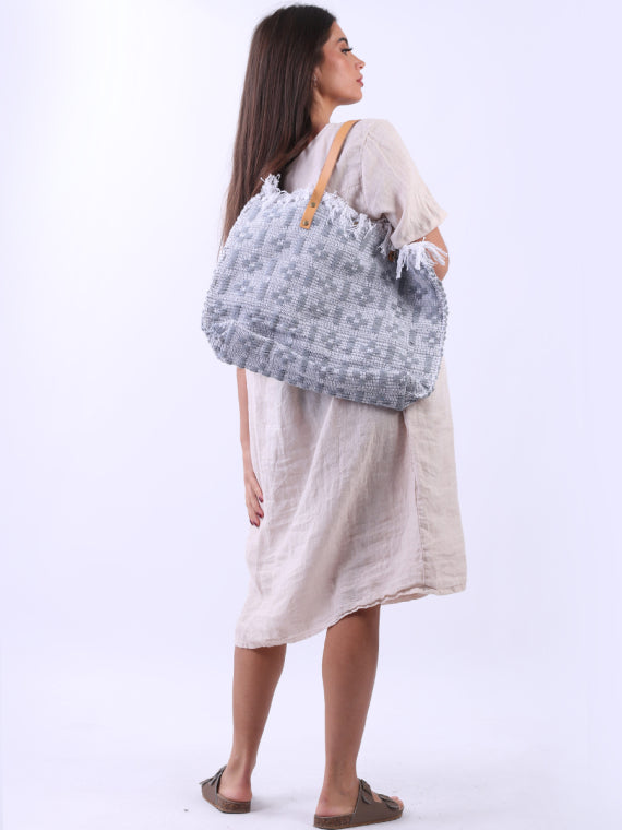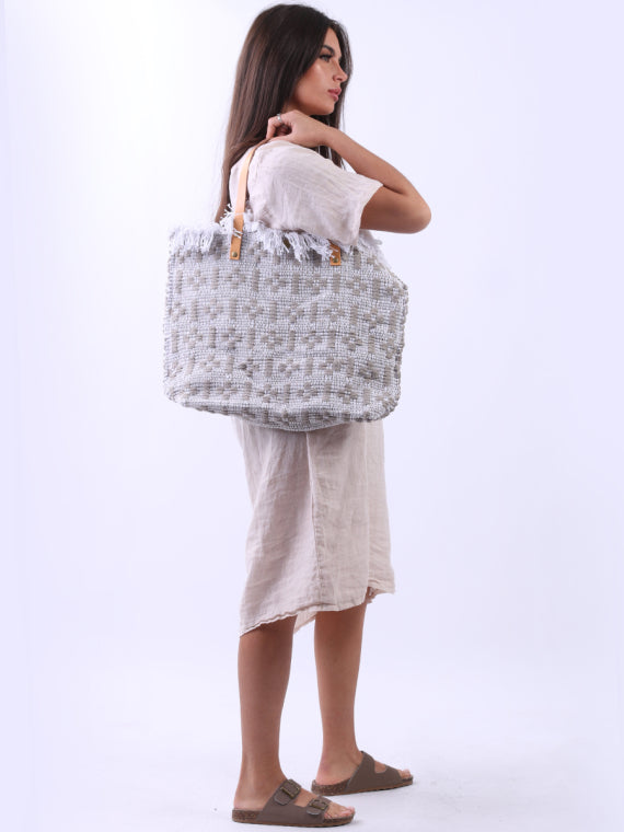 All essential items for the looks business covered by Redwholesale in the finest possible quality standard. Made in Italy with promising quality this fine threaded luxurious check print canvas bag with boho style rough fringe on the top giving the women wearer a refined personal. The contrasting leather look-alike thin straps are an ideal addition to the perfect bag ever made.