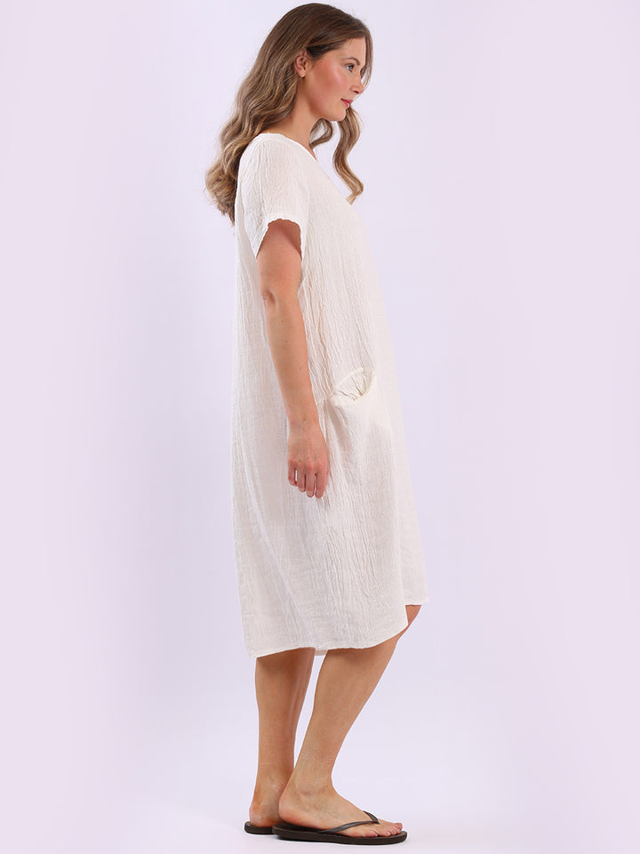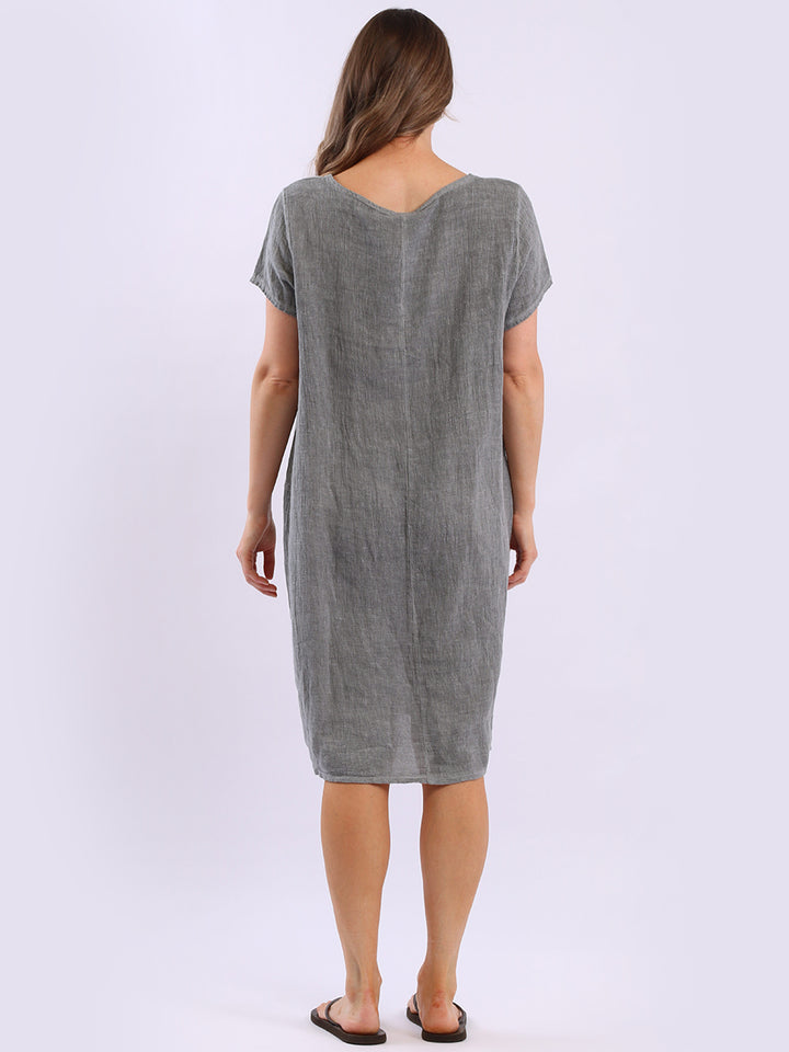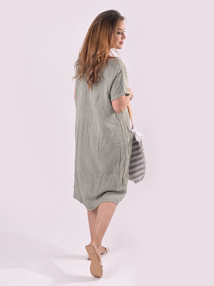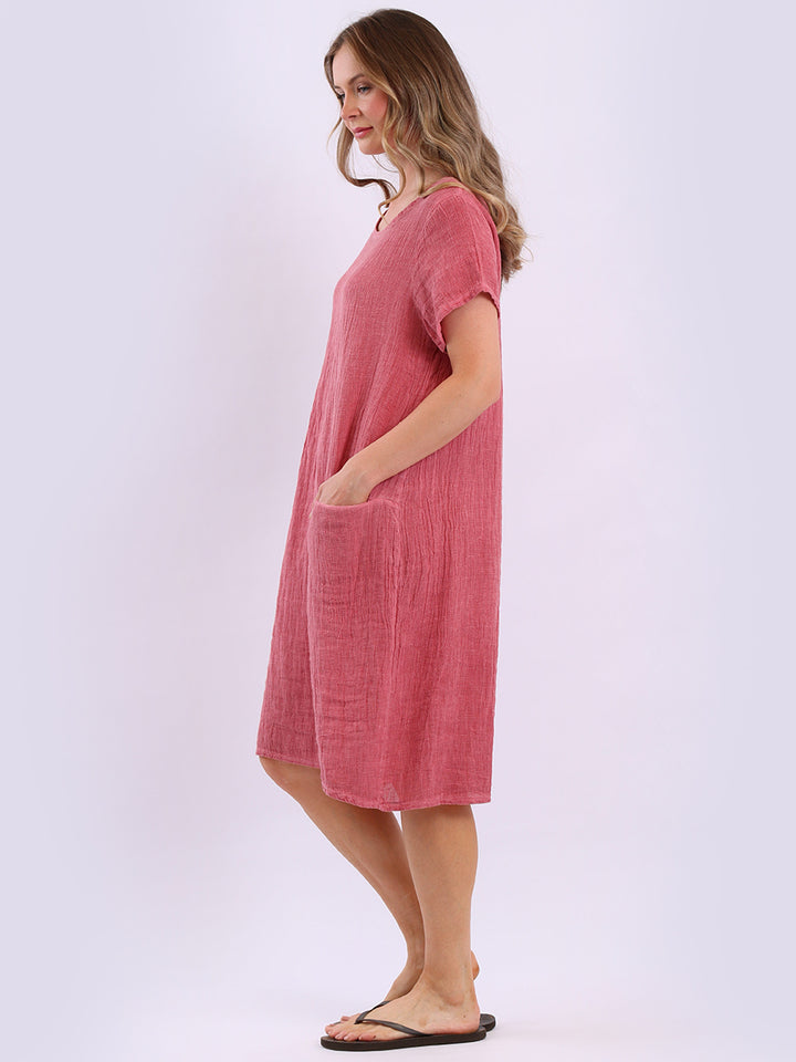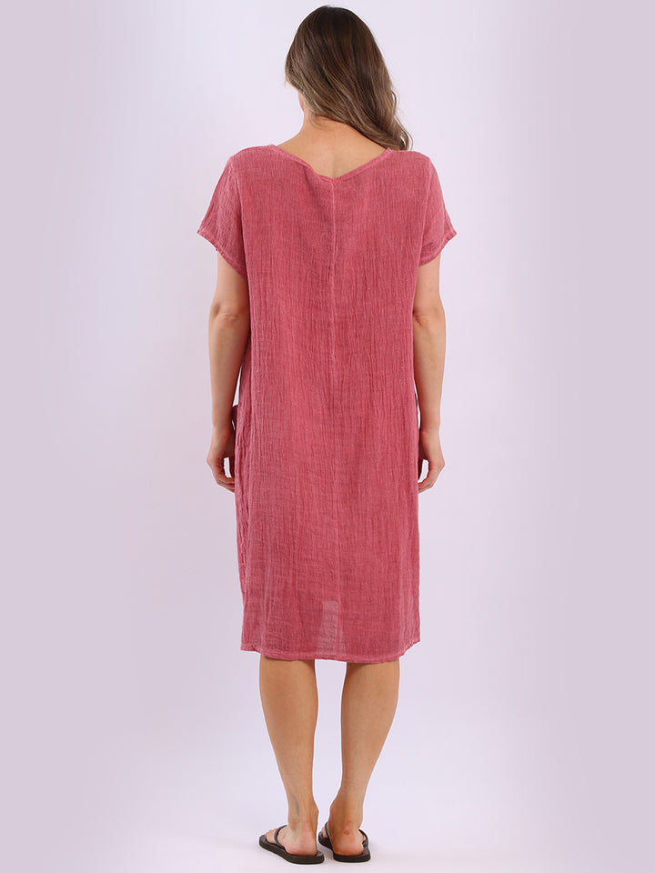 This is a vintage washed linen midi dress in soft colors. It's made from lightweight linen with a slightly textured look and has a relaxed, loose fit for comfort. The dress falls below the knees with a slightly curved hem, short sleeves, and a simple round neckline. It also has two front pockets for convenience. This Redwholesale dress is perfect for warm weather, casual outings, travel, or a laid-back workday, and can be dressed up or down with different shoes and accessories.