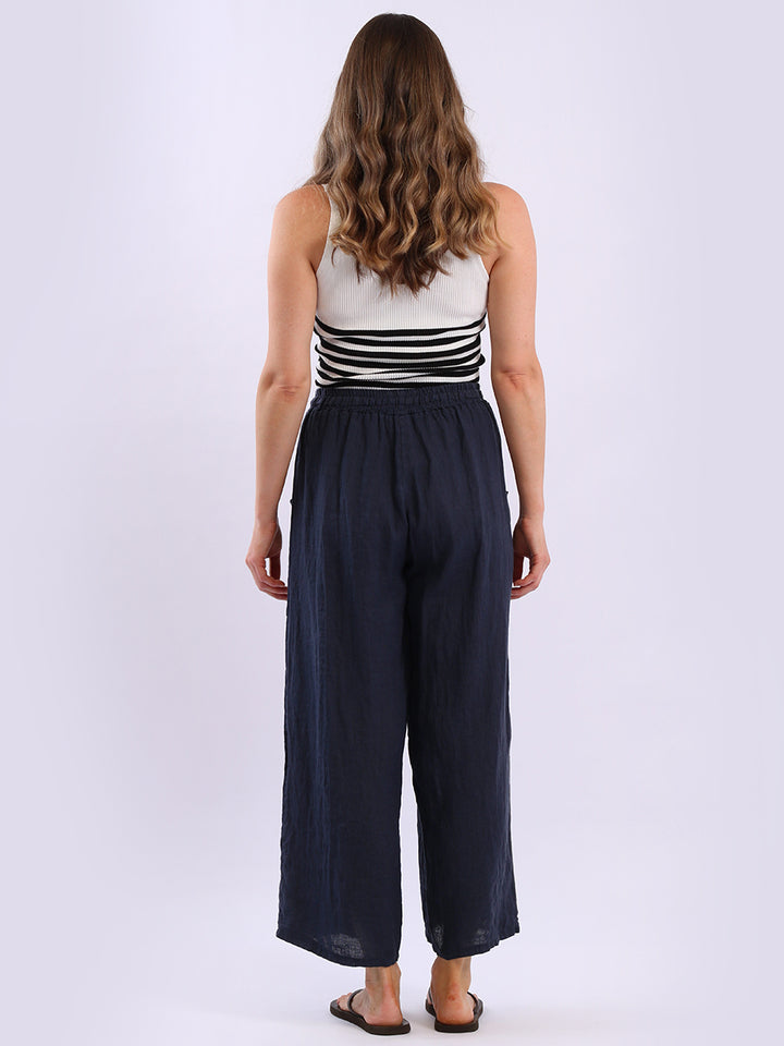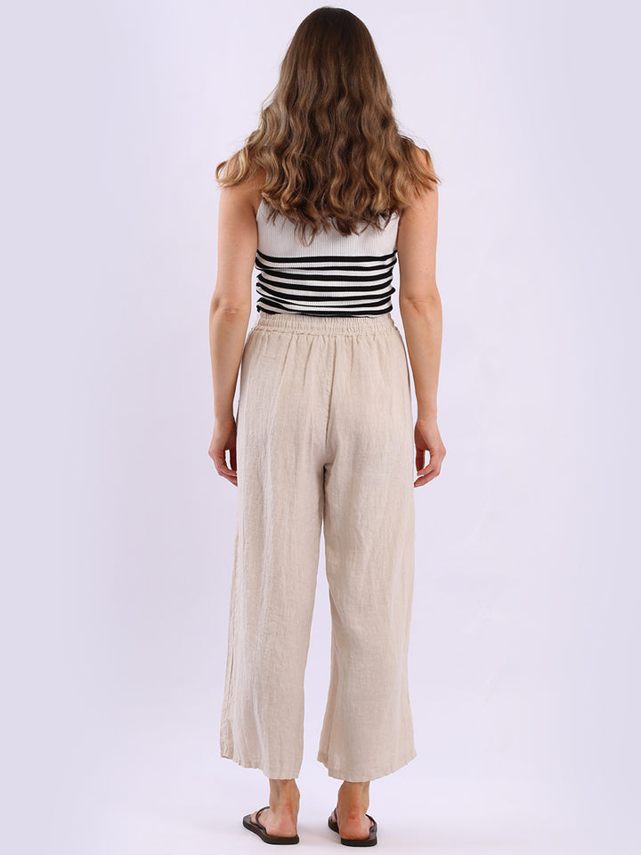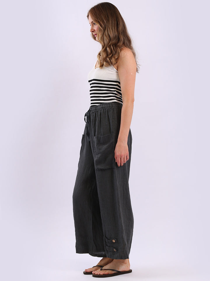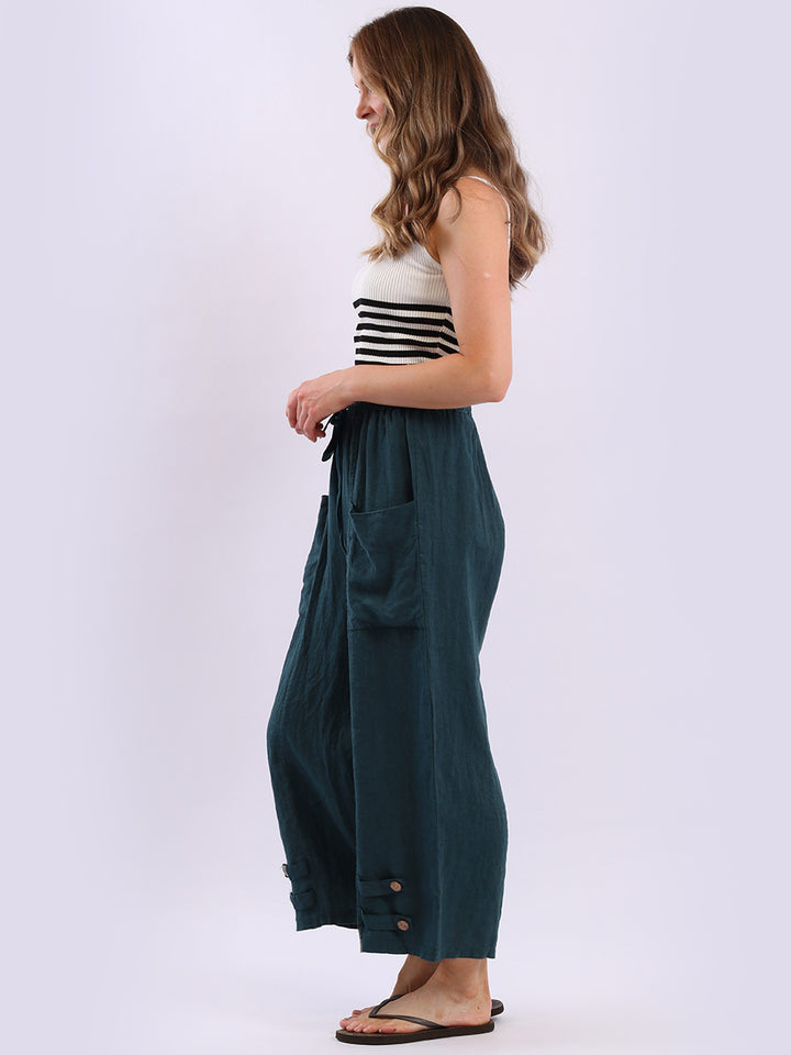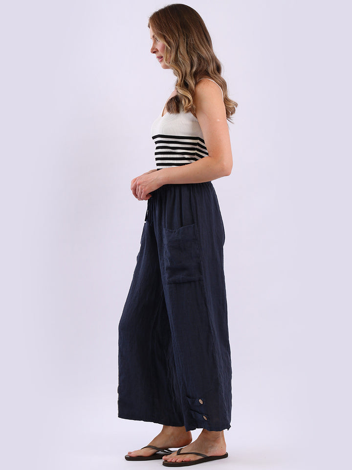 Breezy, bold, and effortlessly stylish, this solid linen trouser is a must-have from our Made in Italy collection. Designed for comfort and versatility, it features a relaxed wide-leg fit, elasticated waistband with drawstring, and spacious front pockets for a laid-back look. The button detailing at the hem adds a subtle touch of structure and charm. Perfect for summer styling, whether pairing it with a light tee or dressing it up with a chic top.