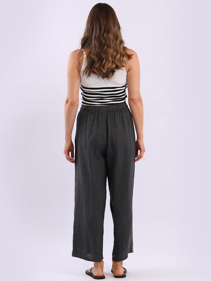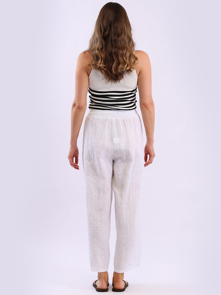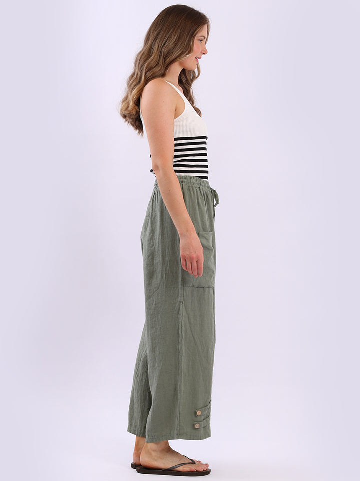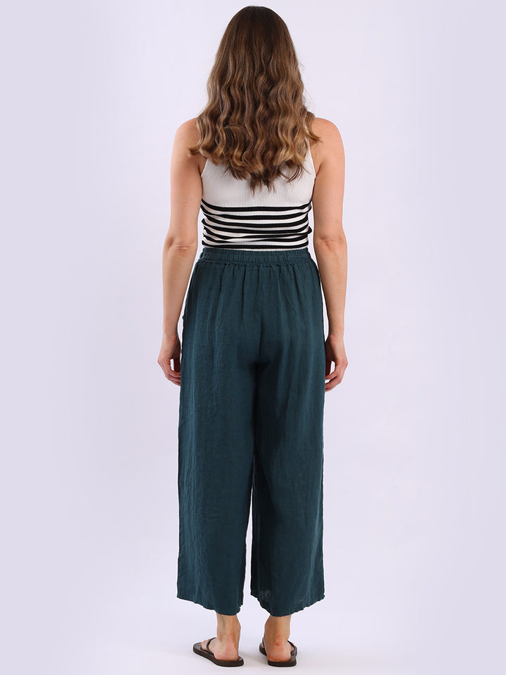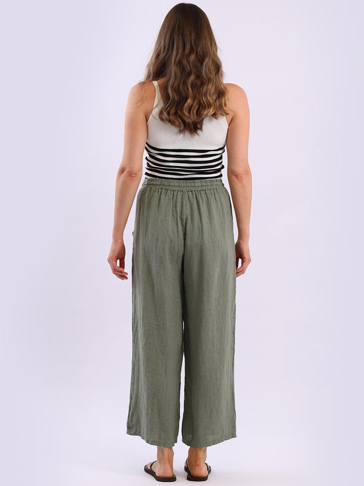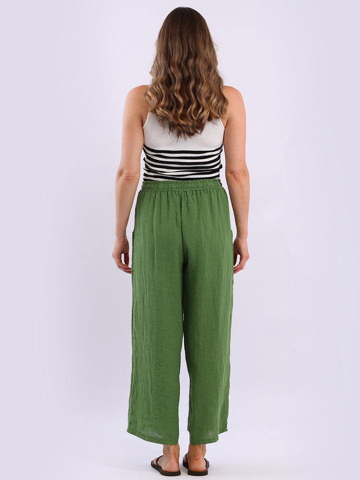 Breezy, bold, and effortlessly stylish, this solid linen trouser is a must-have from our Made in Italy collection. Designed for comfort and versatility, it features a relaxed wide-leg fit, elasticated waistband with drawstring, and spacious front pockets for a laid-back look. The button detailing at the hem adds a subtle touch of structure and charm. Perfect for summer styling, whether pairing it with a light tee or dressing it up with a chic top.