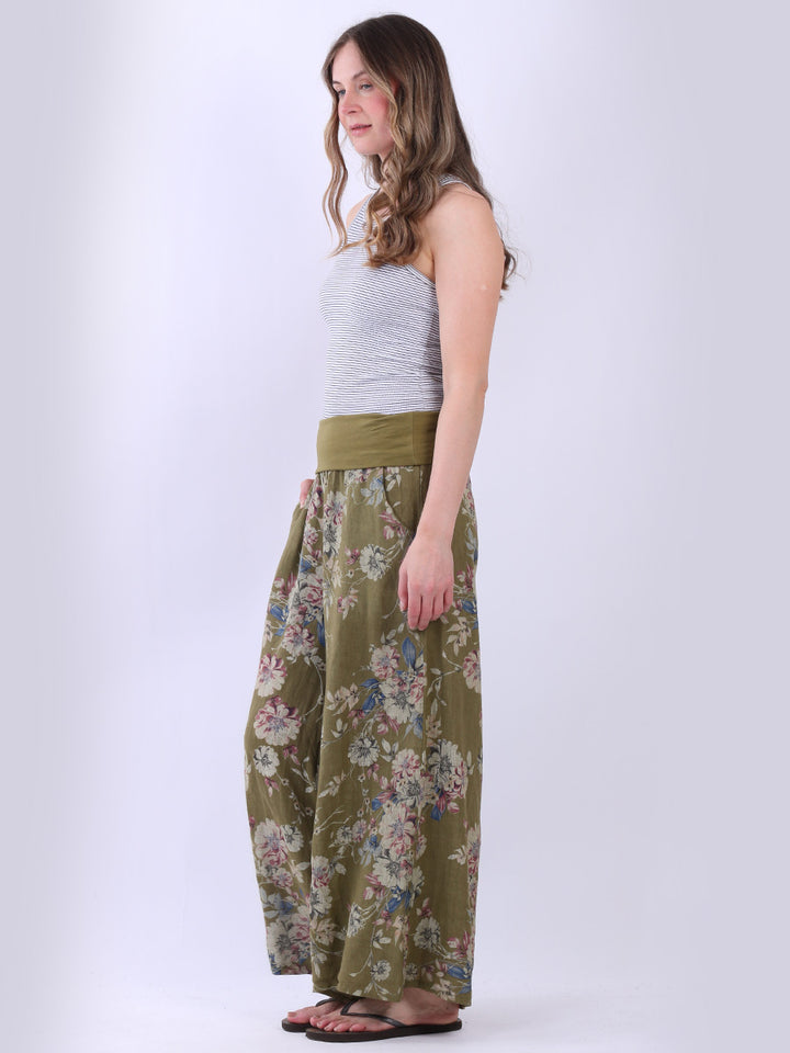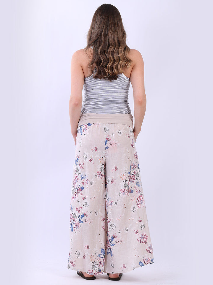 Flowy, feminine and floral! These wide-leg linen trousers are ideal for casual, sunny days. They are perfect to style with linen tops from the Redwholesale women's fashion house.