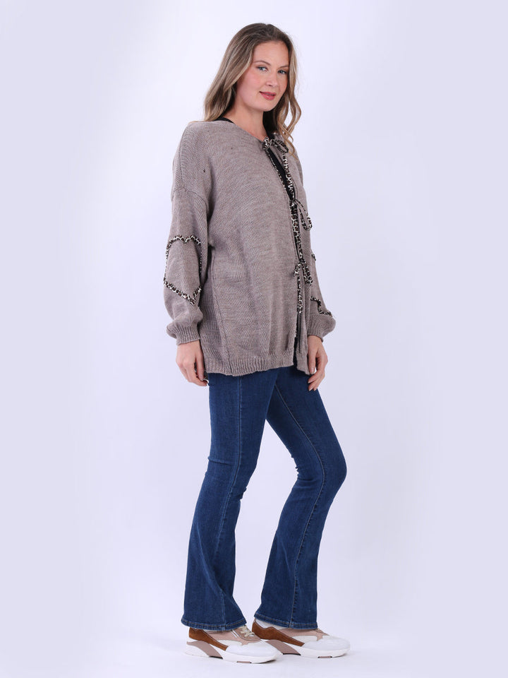 This knitted cardigan from Redwholesale Manchester is designed with women wearers in mind who want both sophistication and style. The delicate leopard trim tie details add a bold feminine touch, while the baggy silhouette keeps it cozy. Perfect for fall layering, this casual piece is easy to pair with any winter wardrobe.