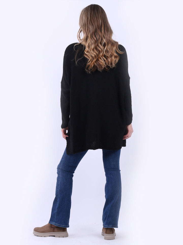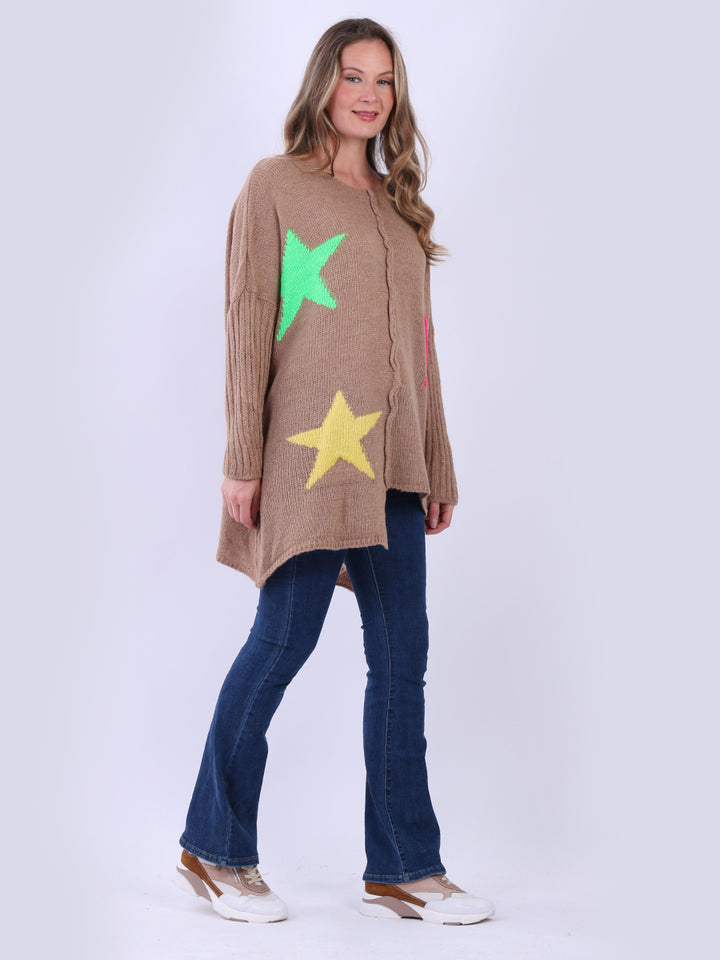 This cozy oversized woolen jumper with vibrant knitted stars is perfect for women looking for a playful addition to their fall/winter wardrobe. The baggy fit ensures a comfortable feel, while the colorful stars and asymmetrical hem add a bold touch of personality. Ladies will love throwing this on for chilly days, making it a staple for a casual, laid-back style.